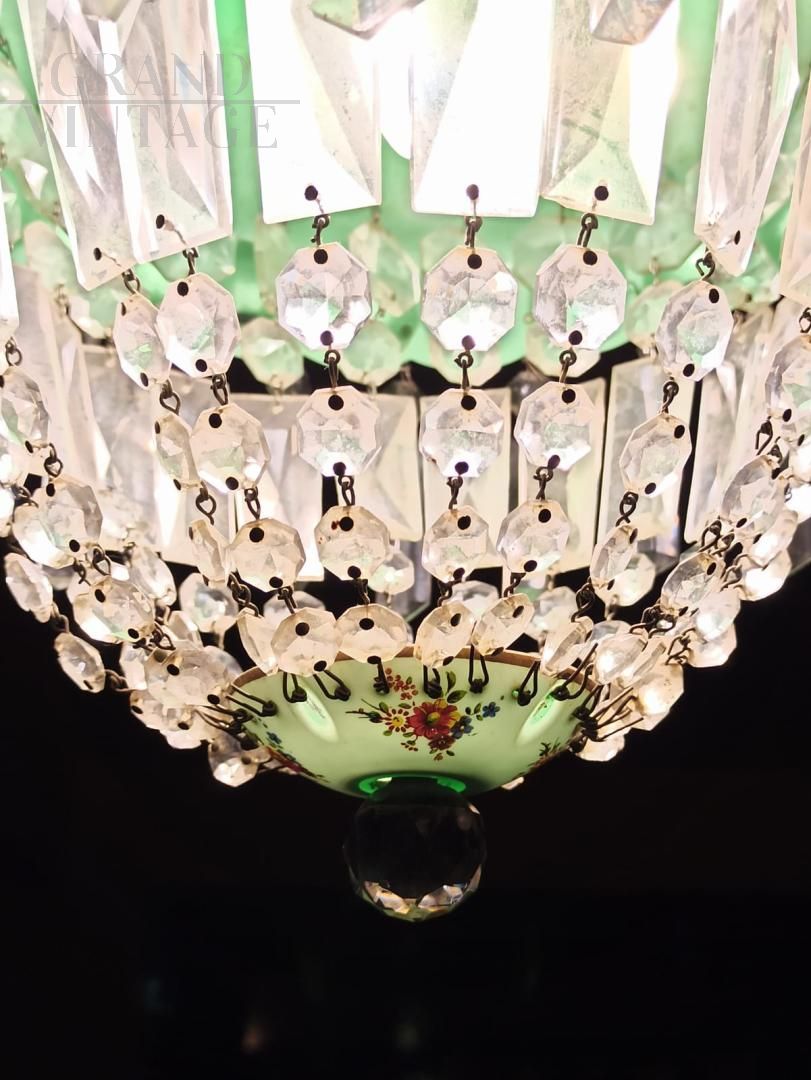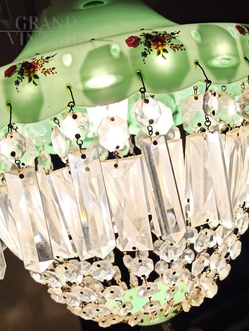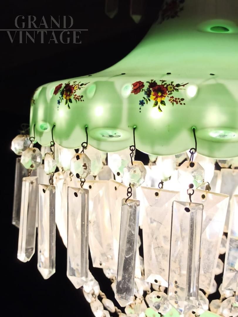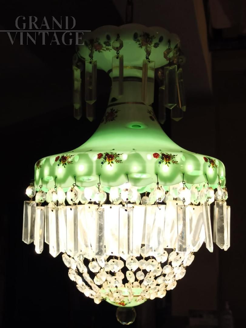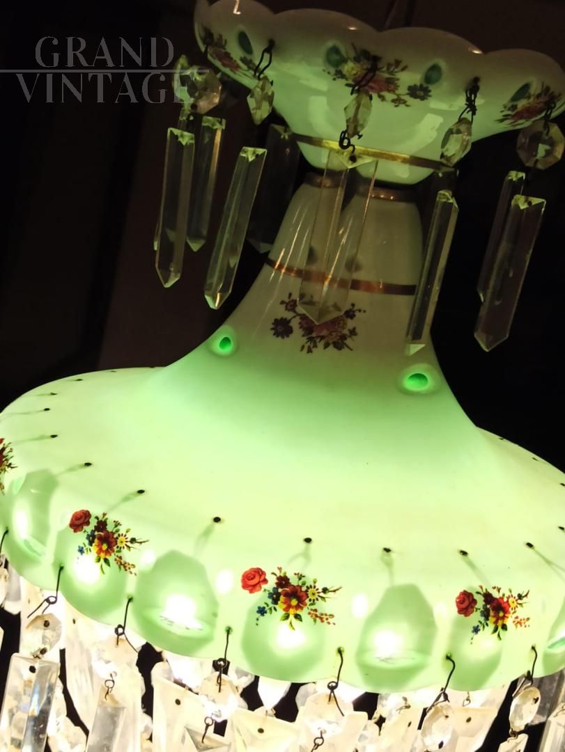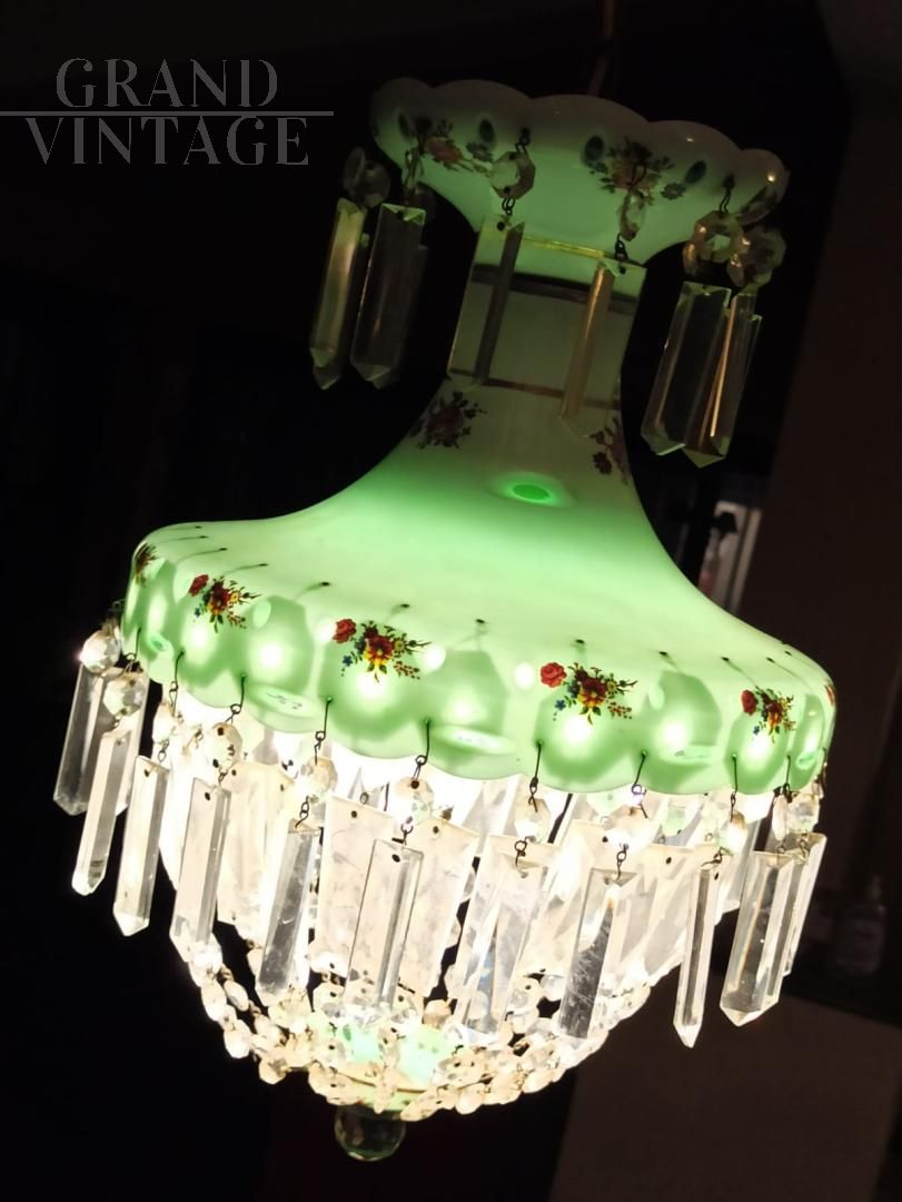 Brocante entrance chandelier in decorated glass and crystal from Bohemia, 1950s, consisting of two white outer and green inner cased glass caps, profiled in gold with floral decorations under enameled. The upper dome conceals an E27 bulb holder for max 100 watts and has a cascade of octagonal crystal chains. This chandelier is ideal for lighting an entrance or corridor. One octagonal crystal is missing.