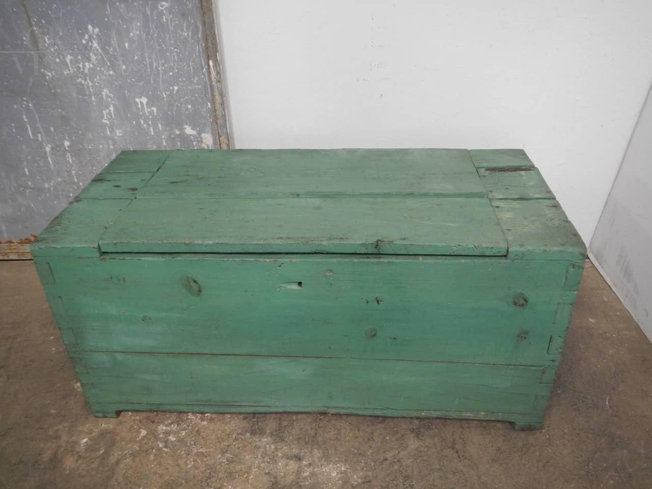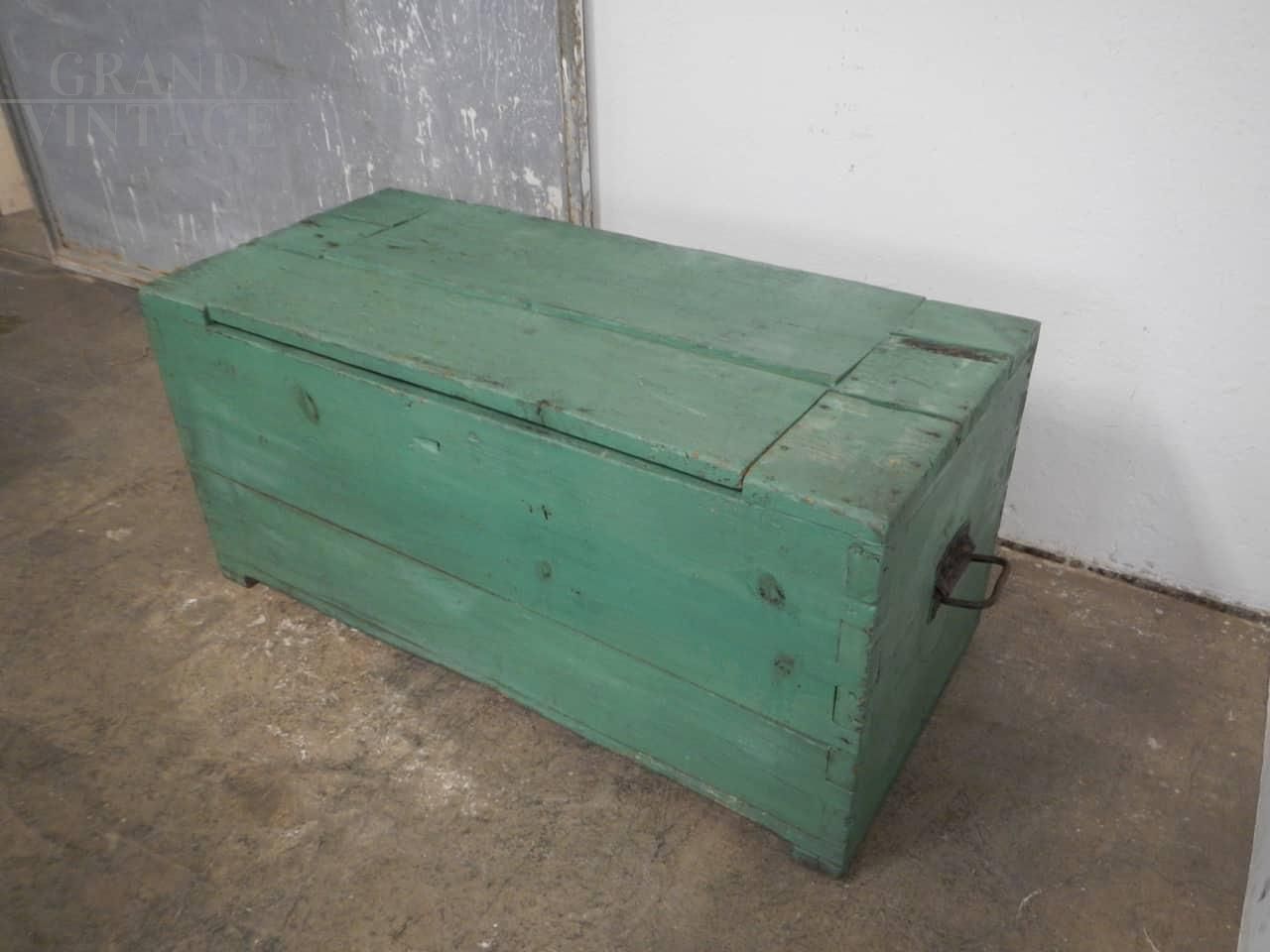 Vintage larch wood trunk, green lacquered on the outside and natural on the inside, from the 1950s, in good condition, clean and left in its original patina.
