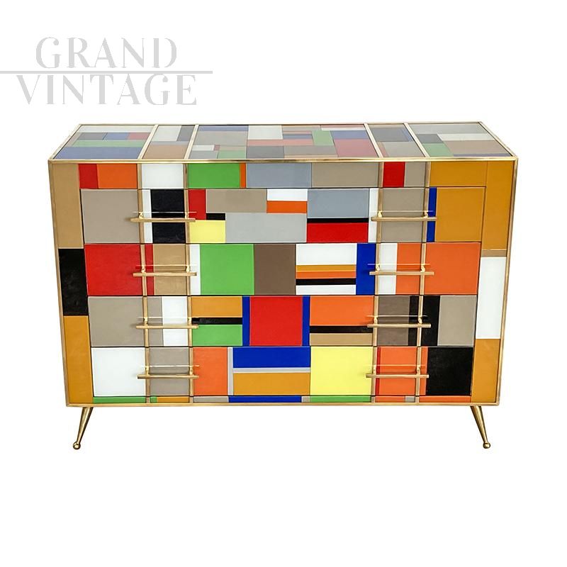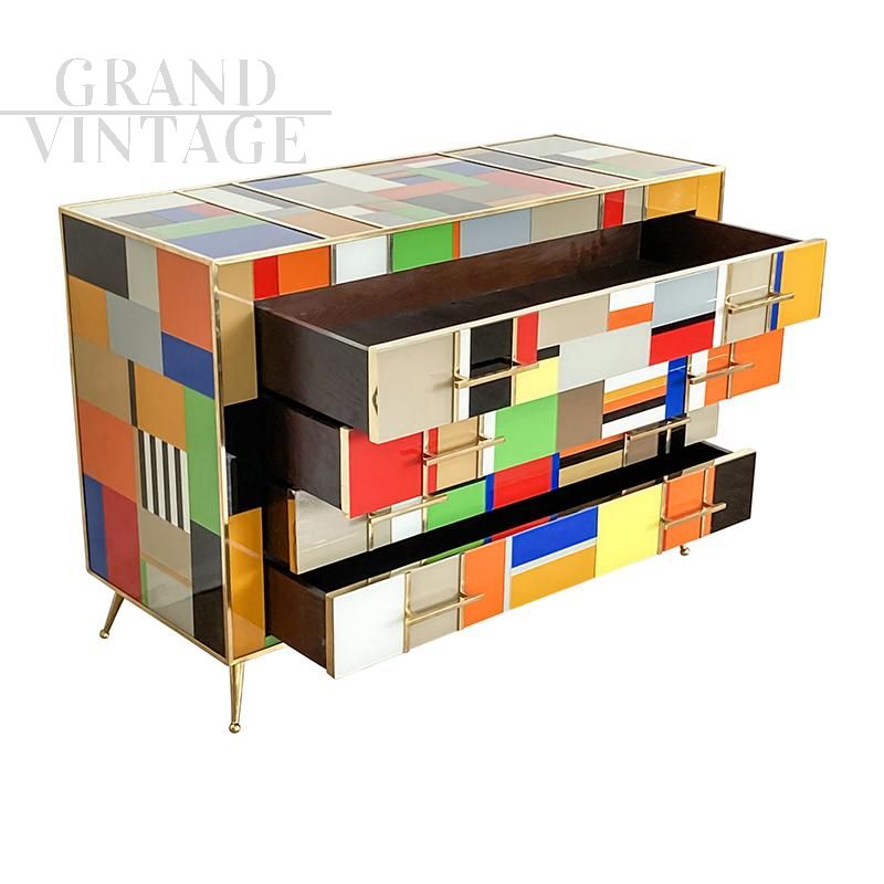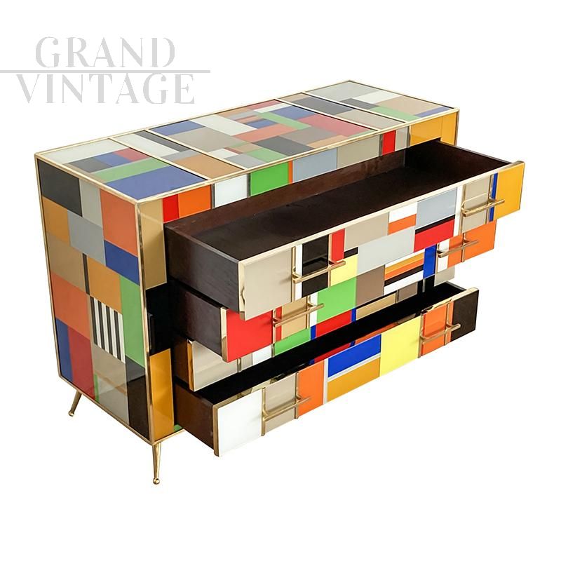 Chest of drawers with four drawers, entirely handmade with wooden structure covered with multicolored Murano glass tiles, and with profiles, handles and feet in golden brass.