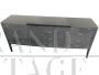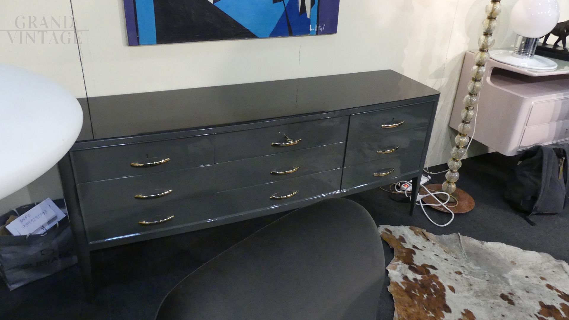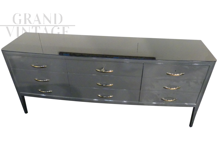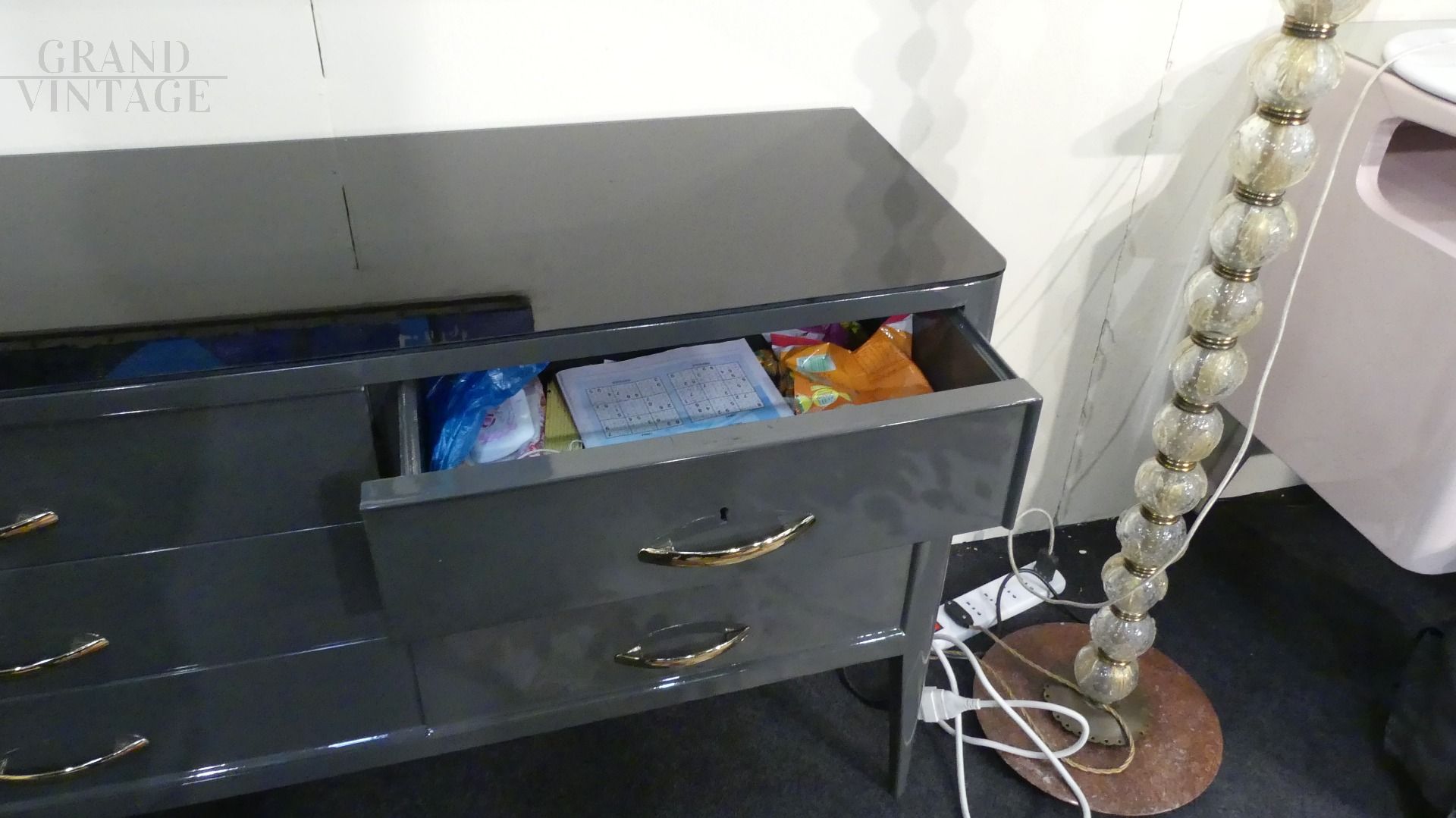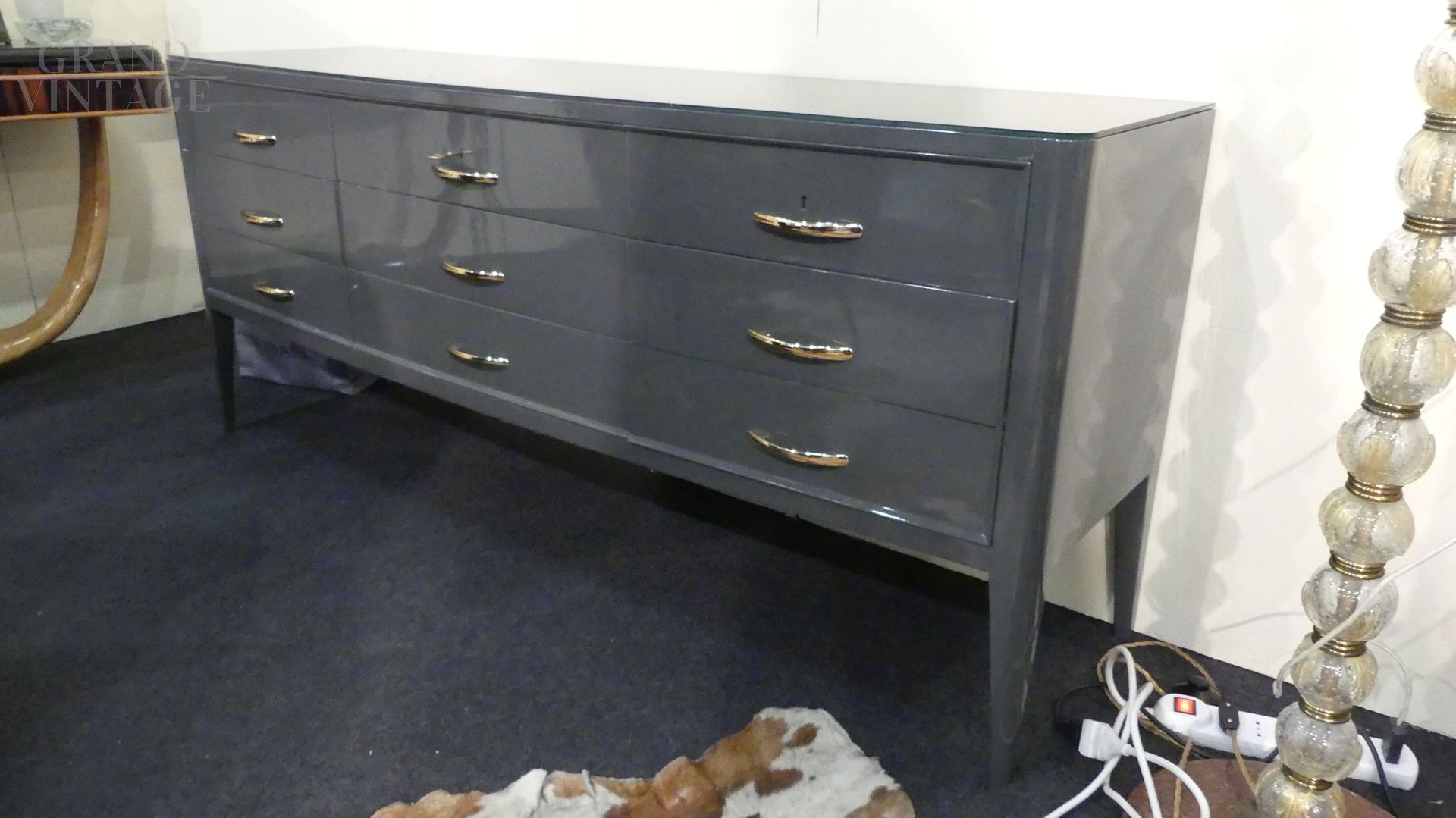 Vintage 1950s chest of drawers with black back-lacquered glass top, non-original brass handles, new lacquered in anthracite gray.