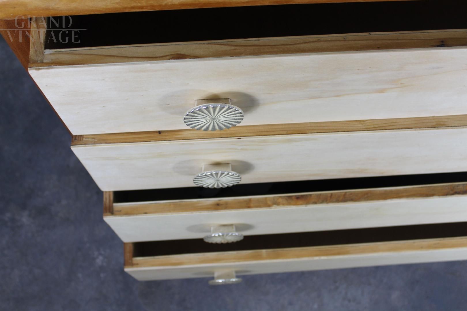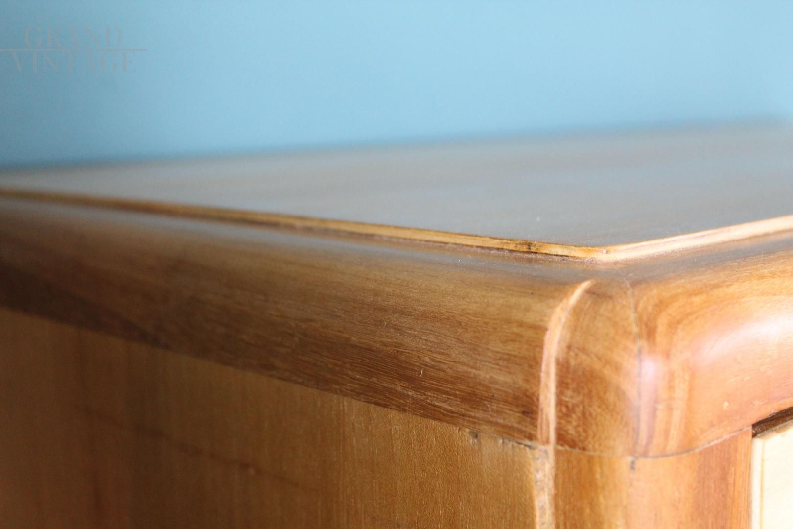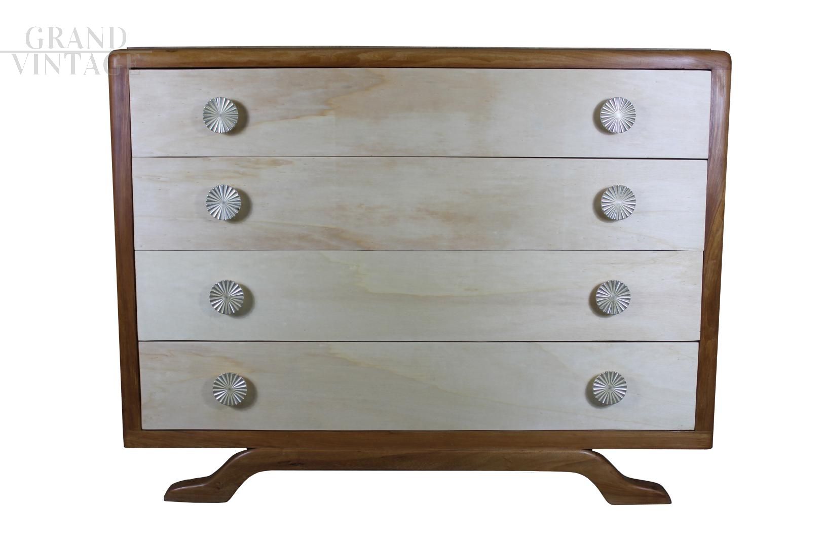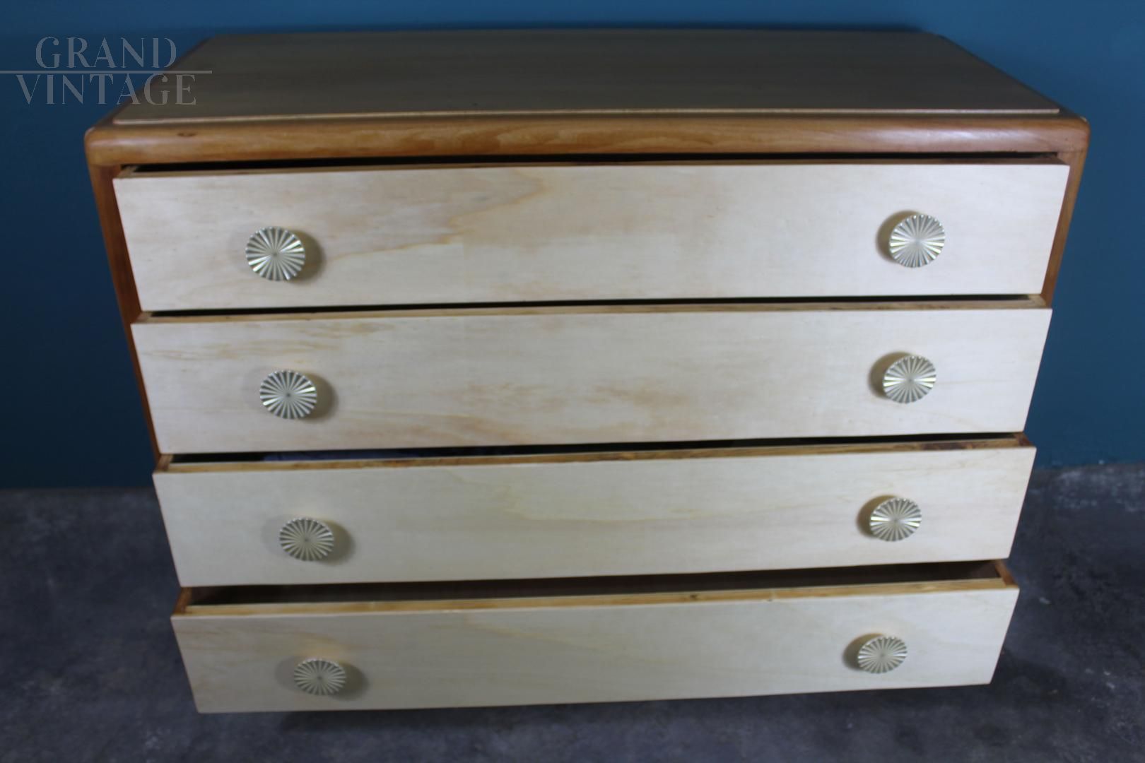 Elegant vintage chest of drawers from the 1950s in natural wood and light wood, restored and in good condition.