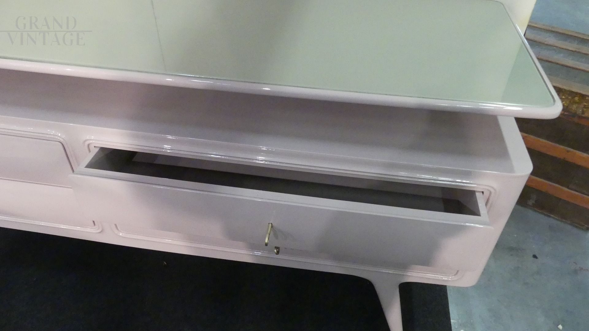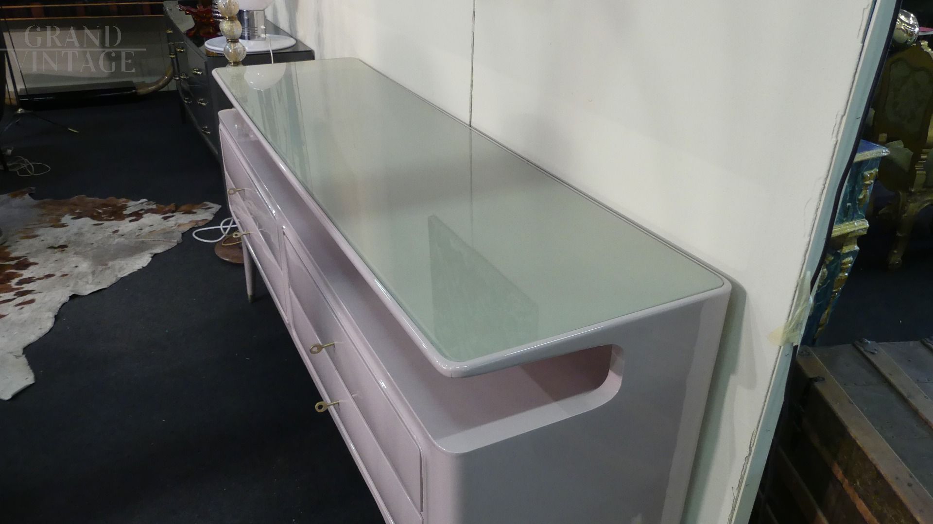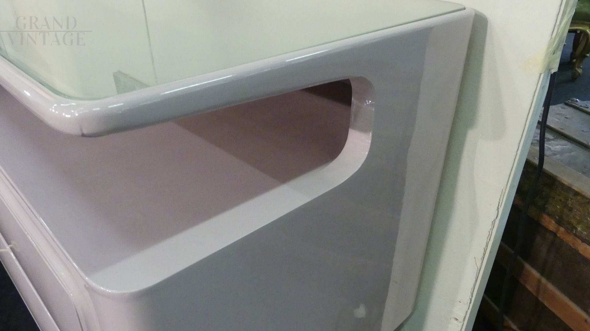 Comò cassettiera vintage con piano in vetro, laccata rosa