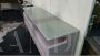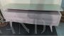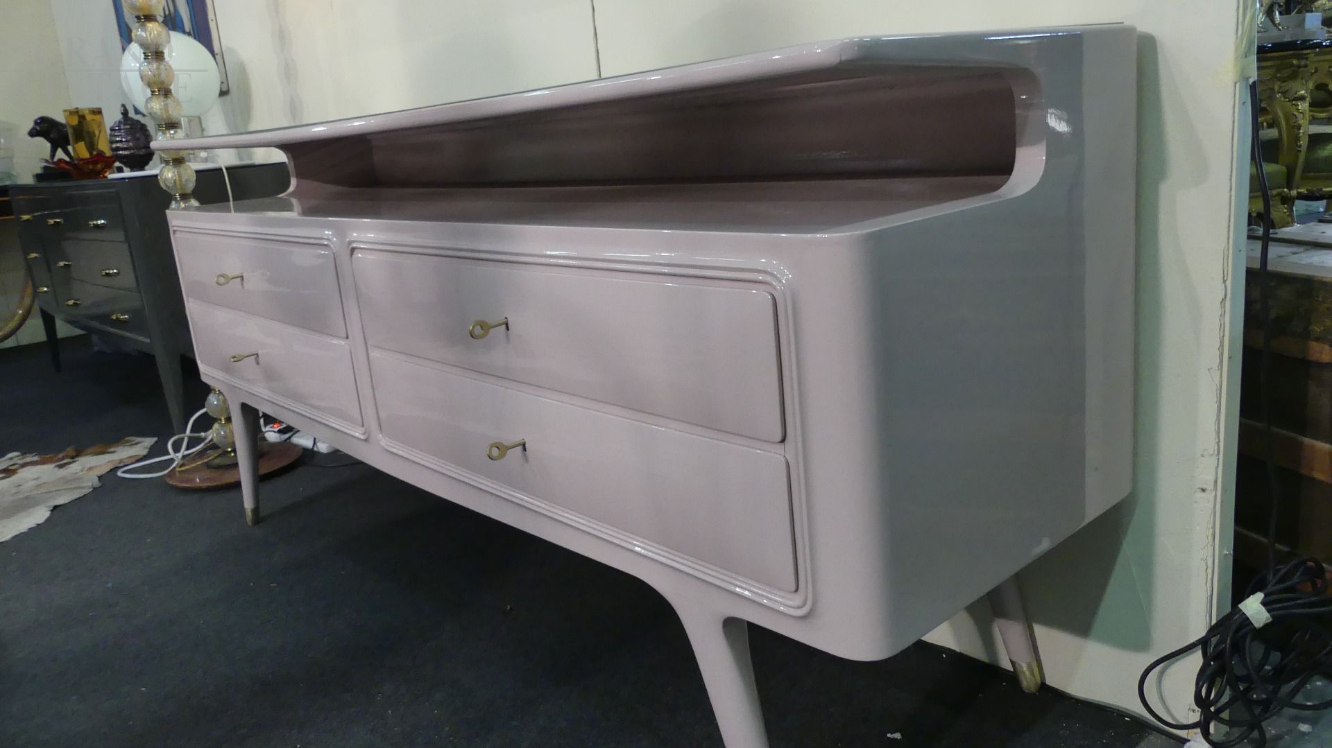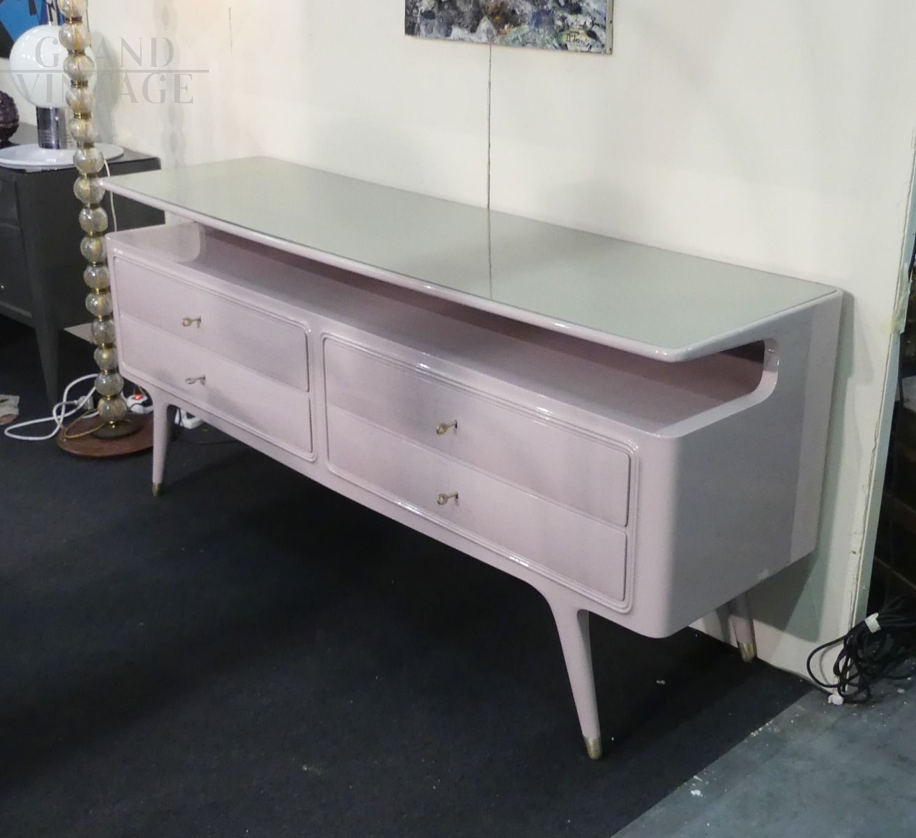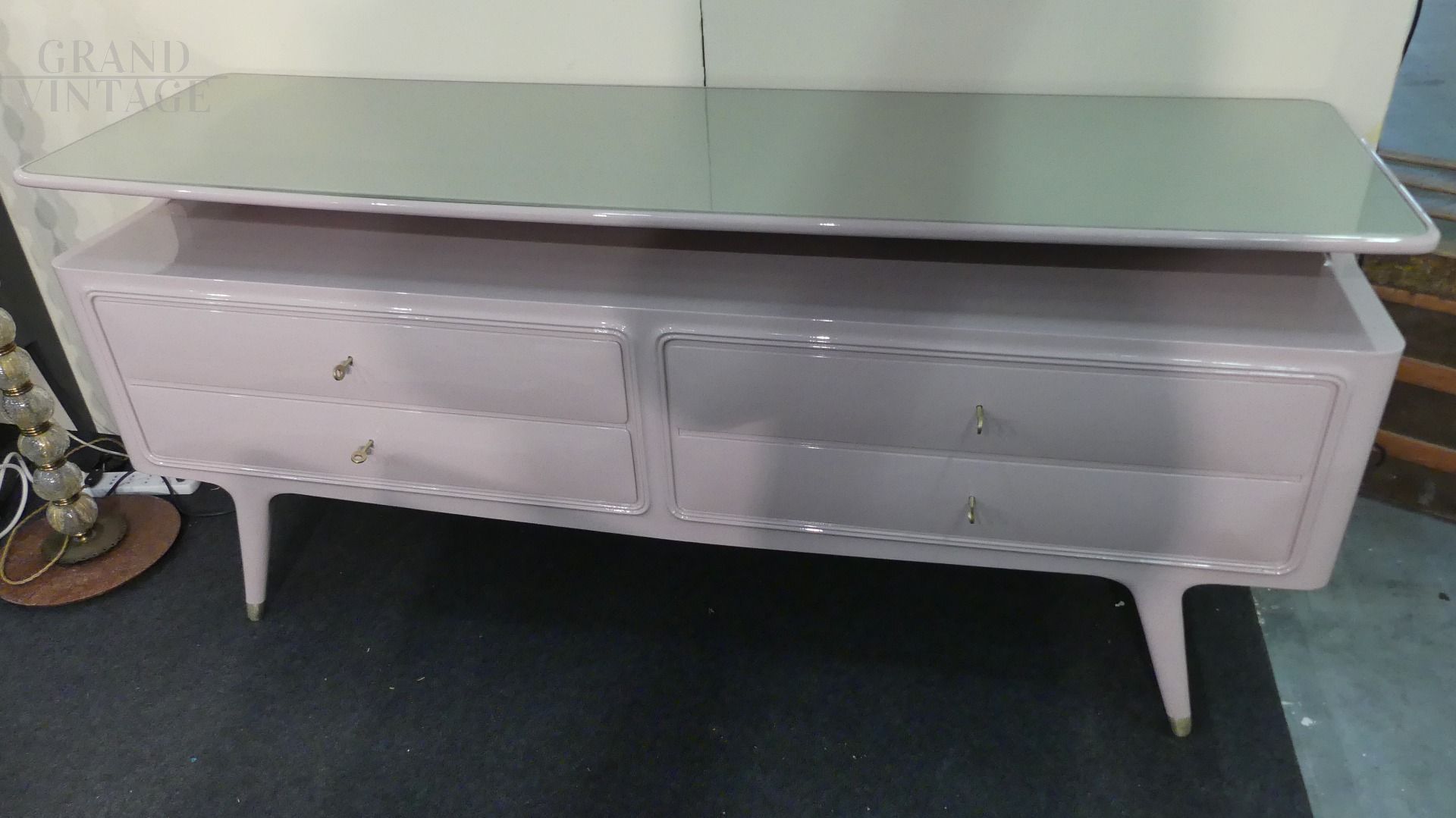 Comò cassettiera vintage con piano in vetro, laccata rosa