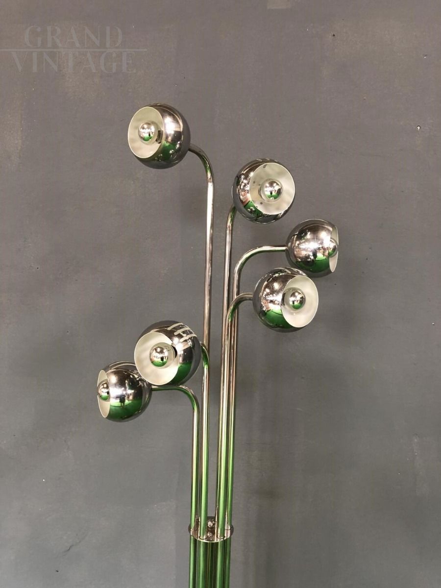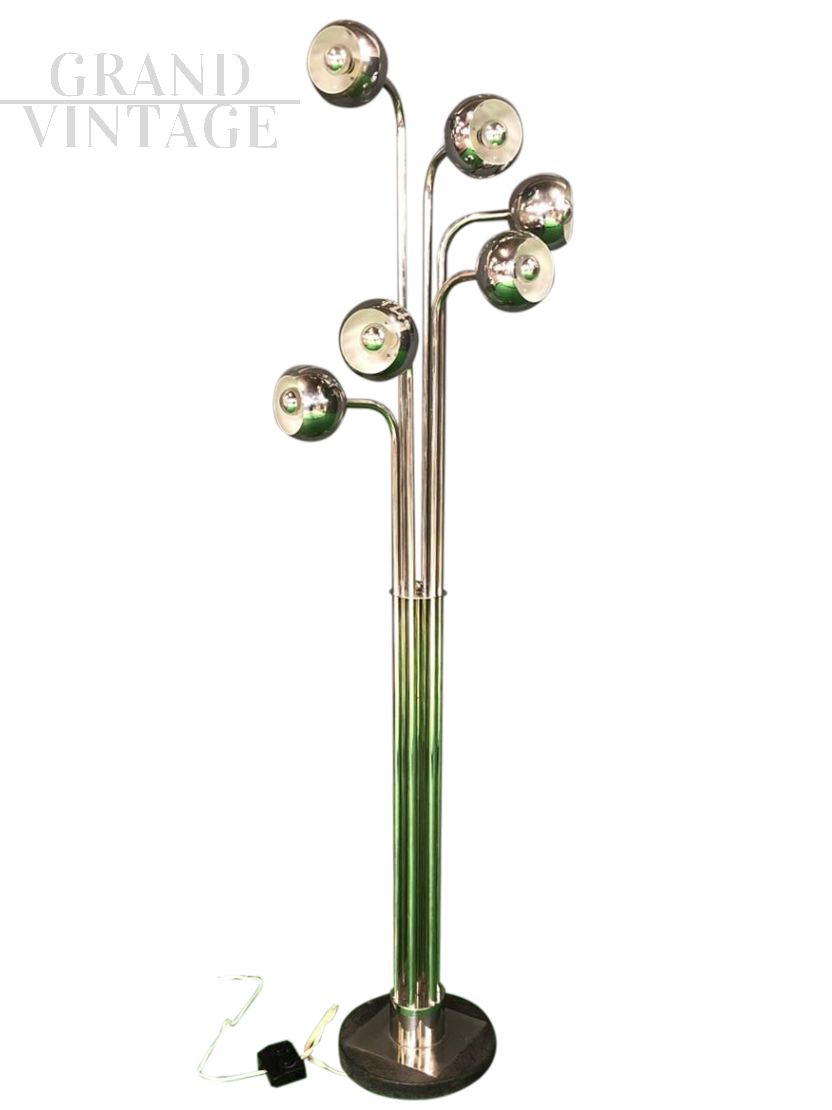 Chrome floor lamp from the 70s with 6 arms and lights, in good condition, working.
