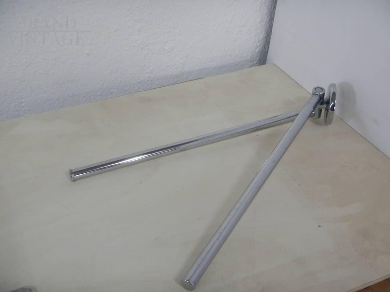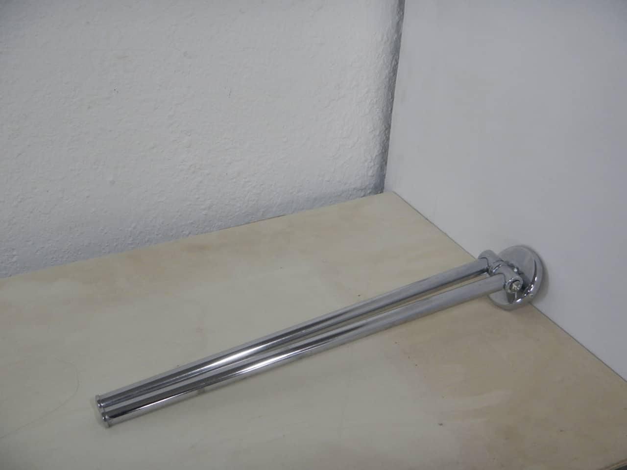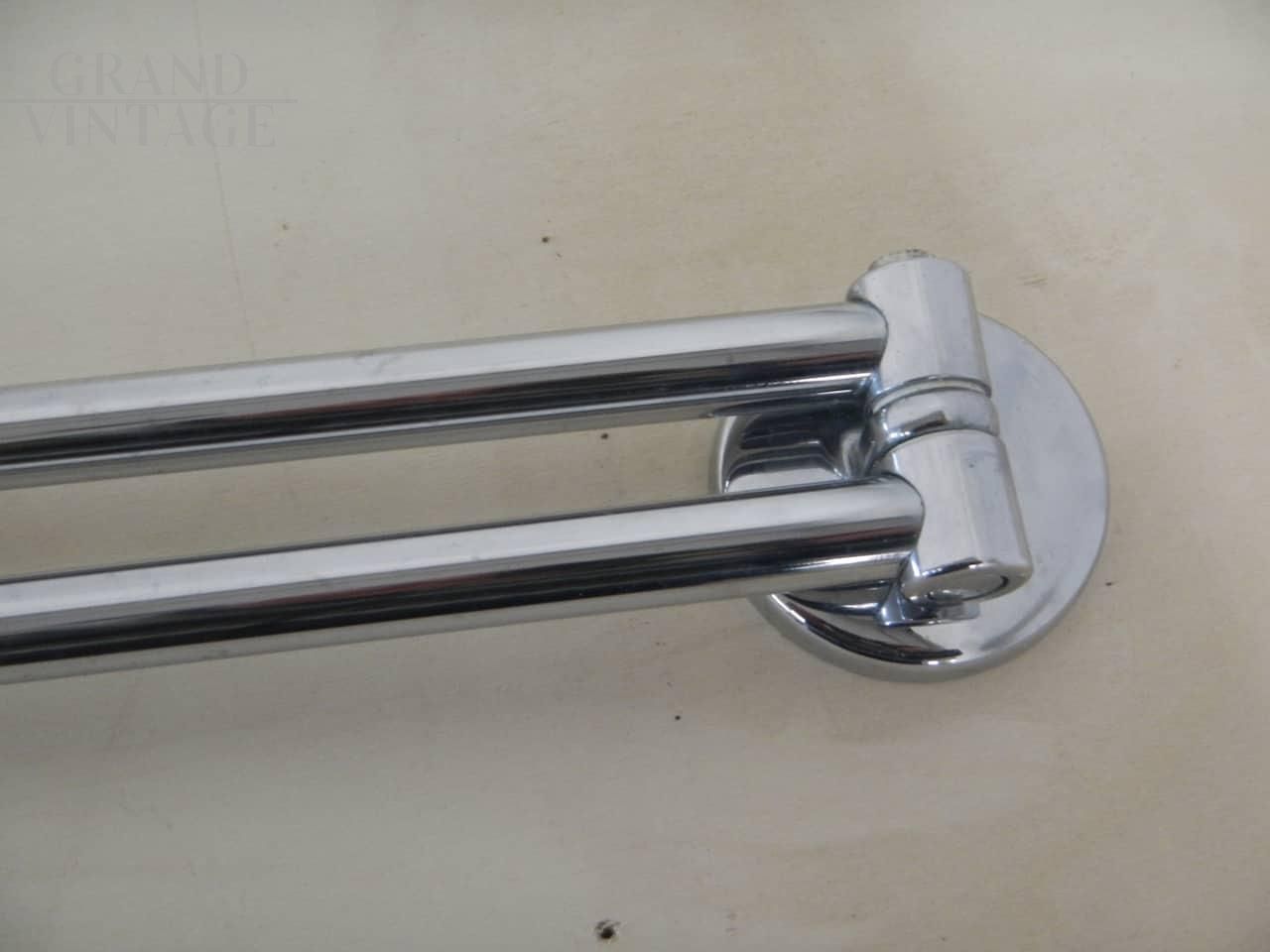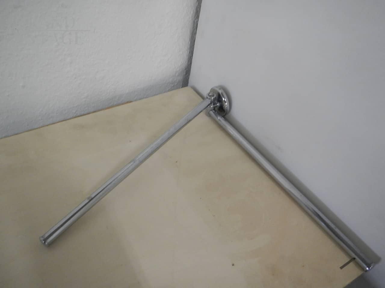 Vintage adjustable wall-mounted bathroom towel rack hanger with chromed metal joint, in good condition with signs of use. Complete with hook to apply to the wall for hanging.