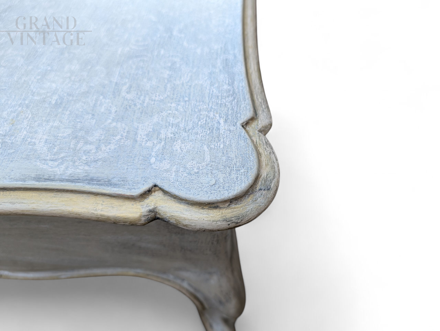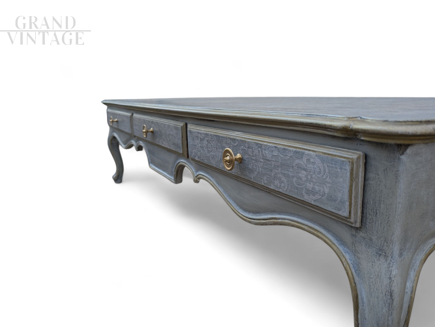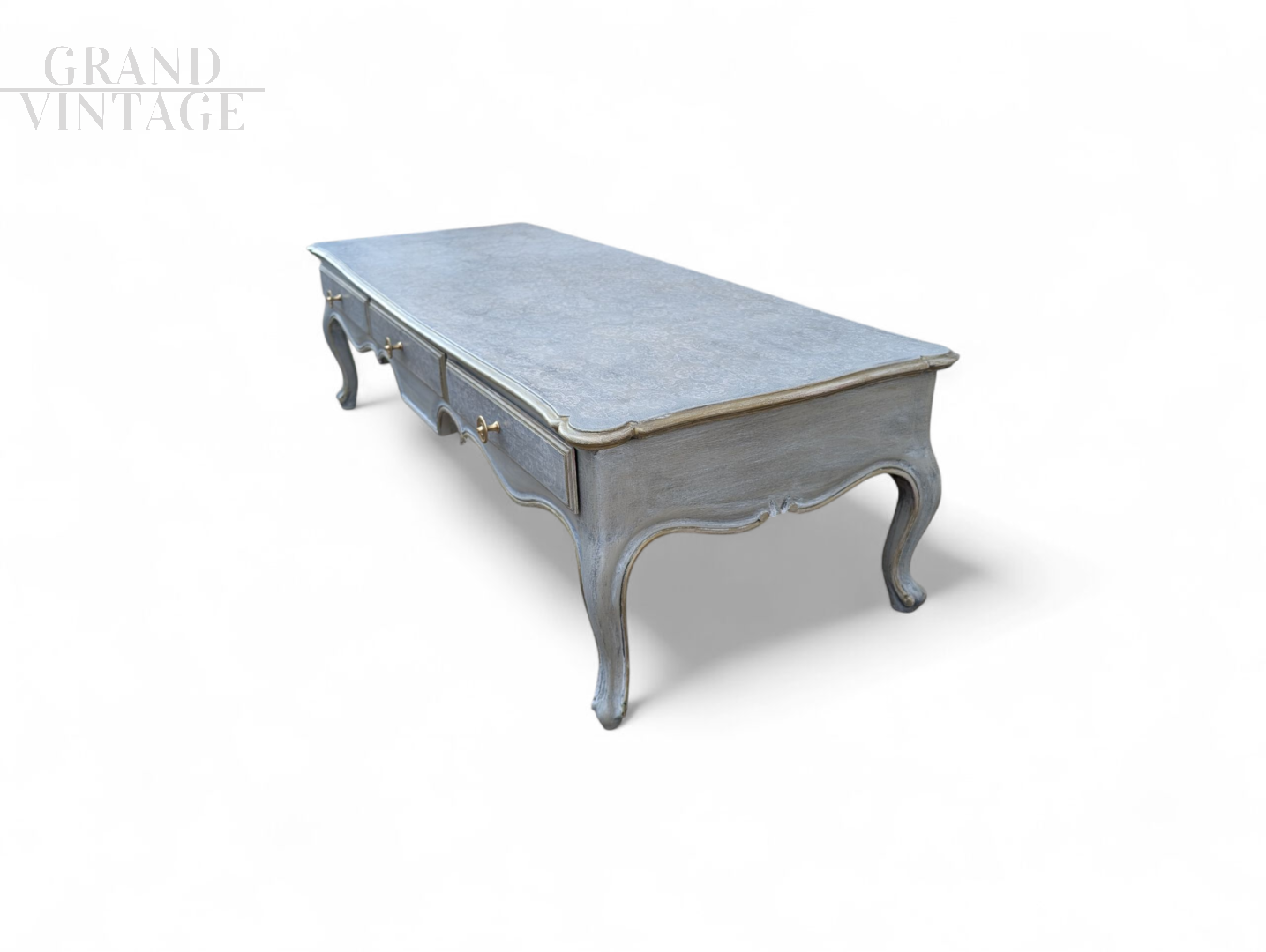 An elegant coffee table in classic French Provençal style, crafted from fine solid walnut and finished with a delicate antiqued light gray finish featuring a subtle classic pattern, enhancing its decorative appeal. The large, linear top rests on four Louis XV-style legs, while the front features three drawers embellished with decorative floral motifs and round brass handles. The deliberately patinated finish gives the piece a refined, time-worn look, perfect for classic, Provençal, or shabby chic interiors. This handcrafted piece combines the solidity of walnut with the aesthetic lightness of color and decorations, ideal for those seeking a unique, elegant, and functional piece.