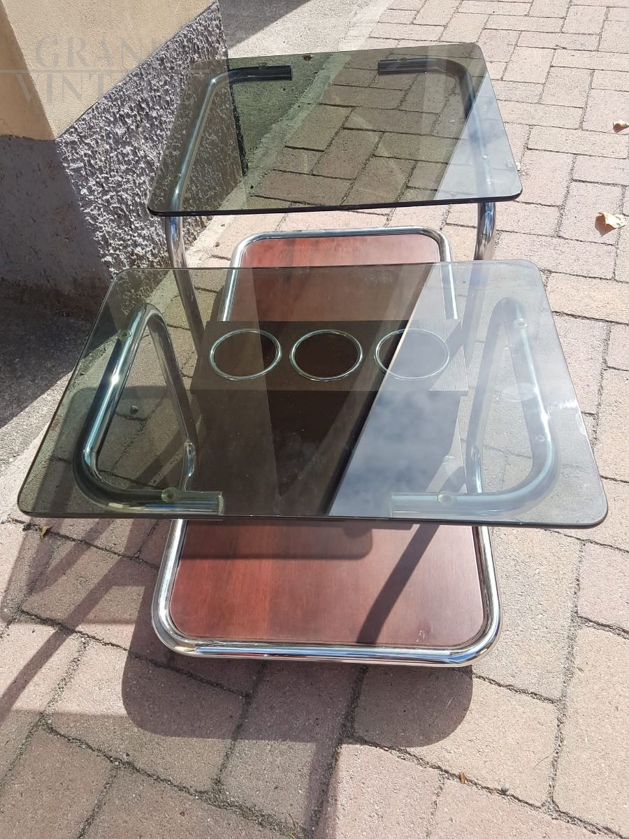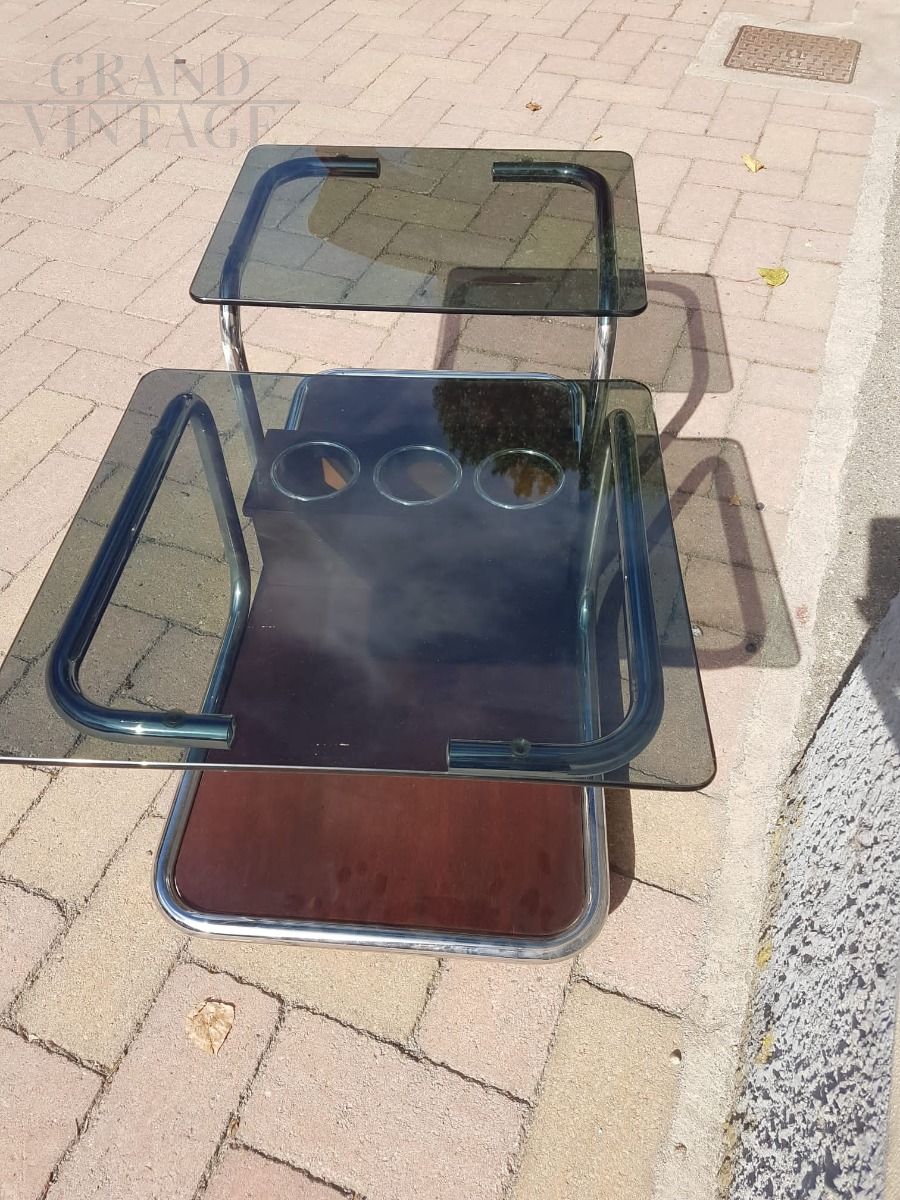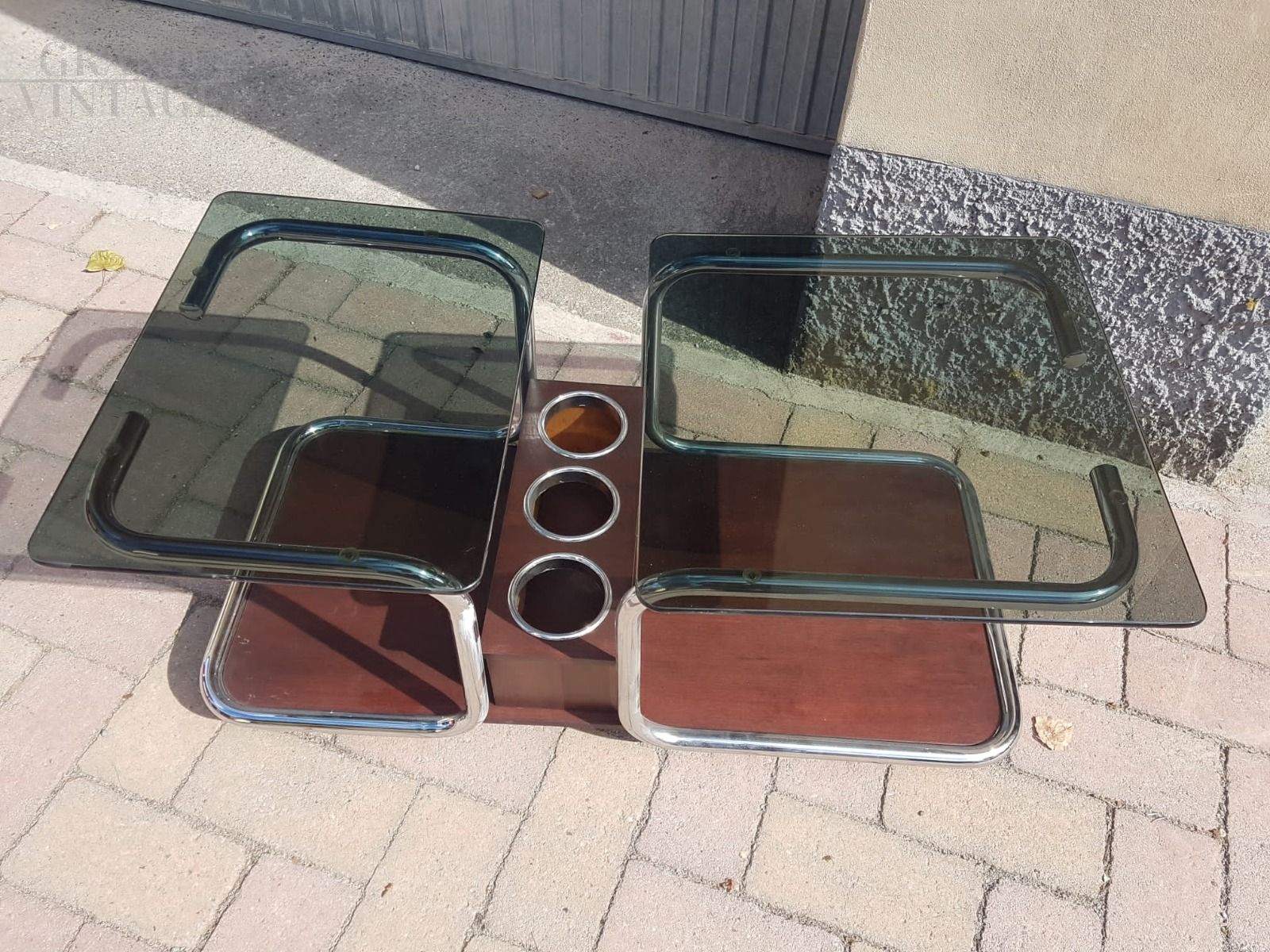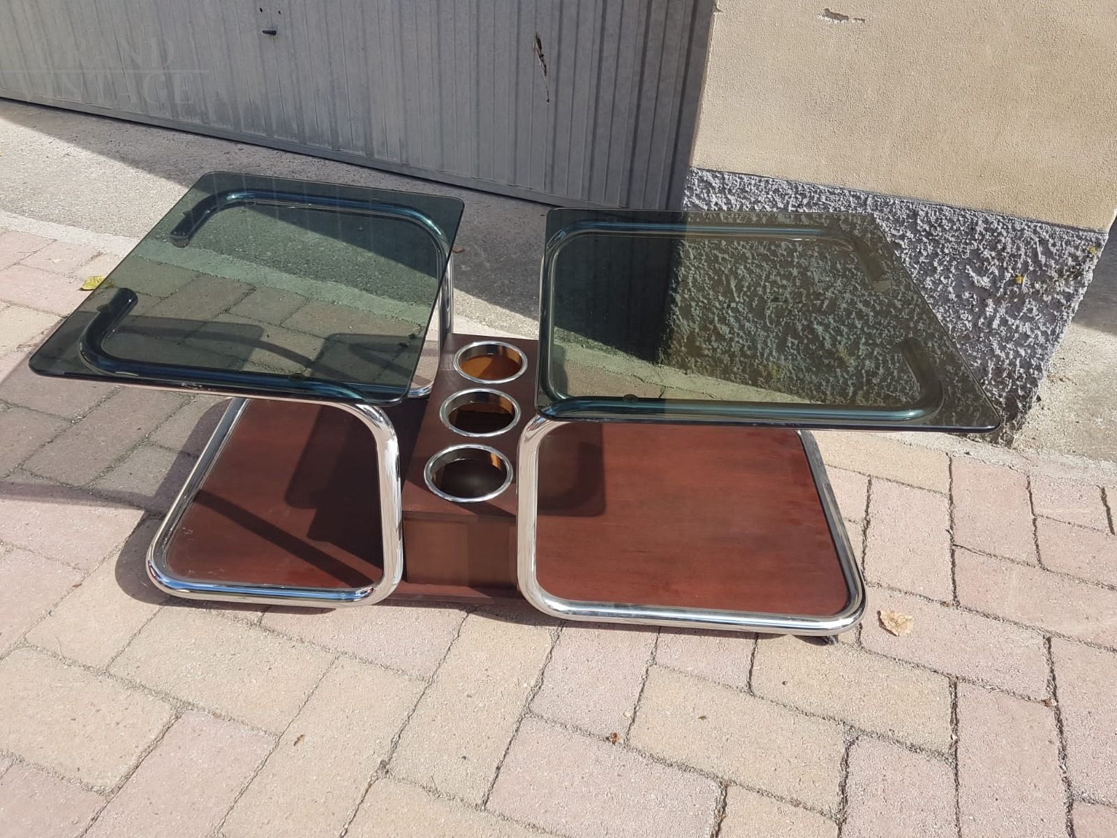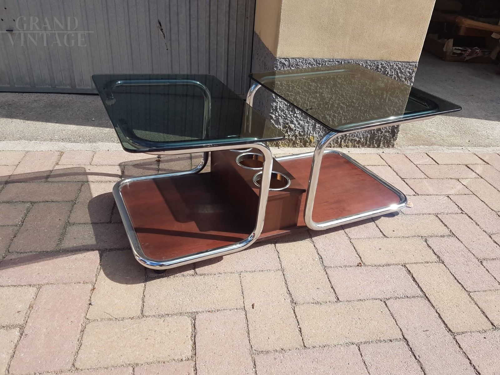 Tavolino da salotto vintage con portabottiglie e piano in vetro