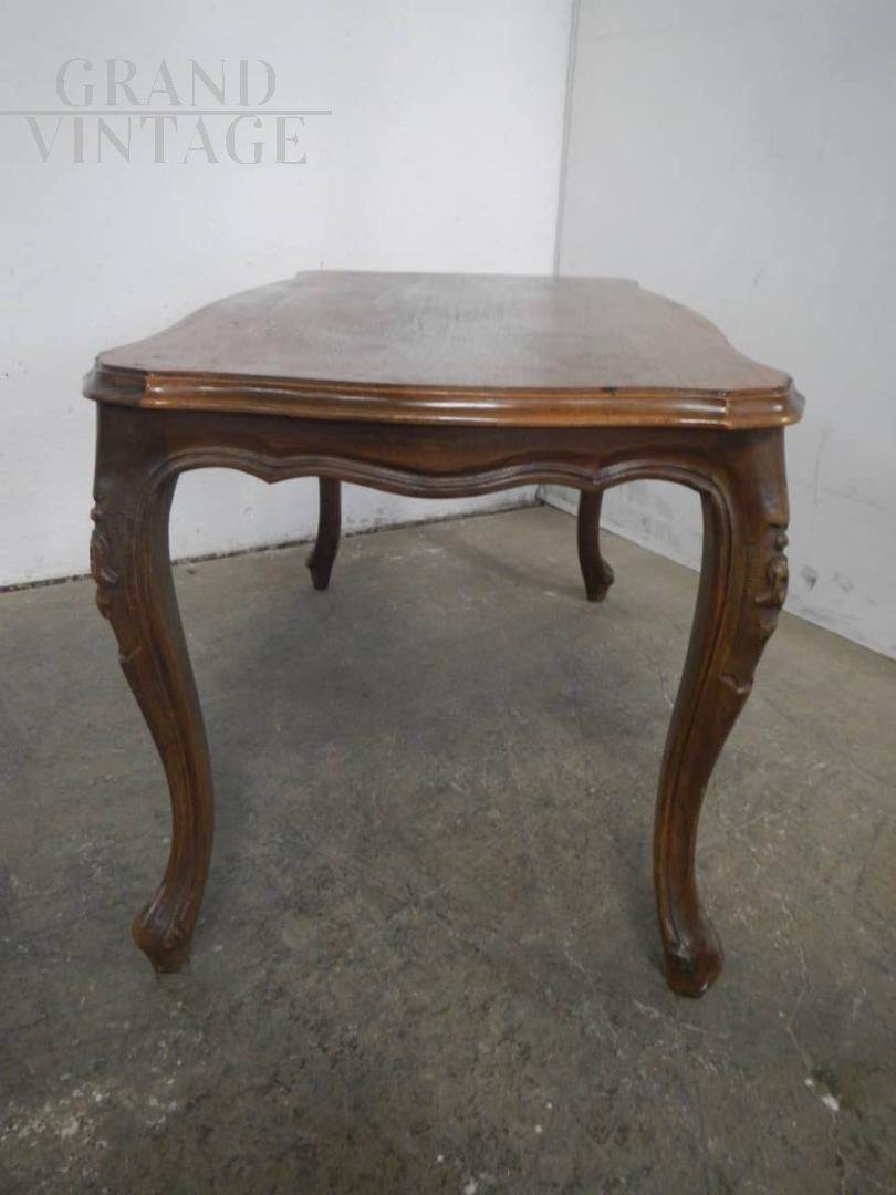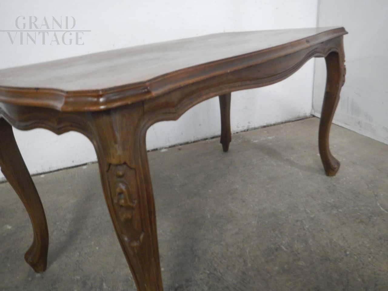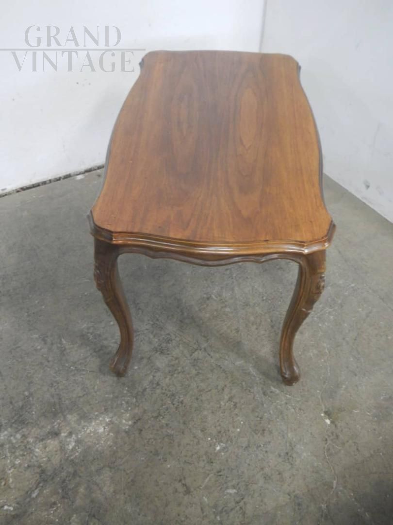 Vintage antique style coffee table in walnut wood with walnut blockboard top and wavy legs with floral carvings. In good condition.