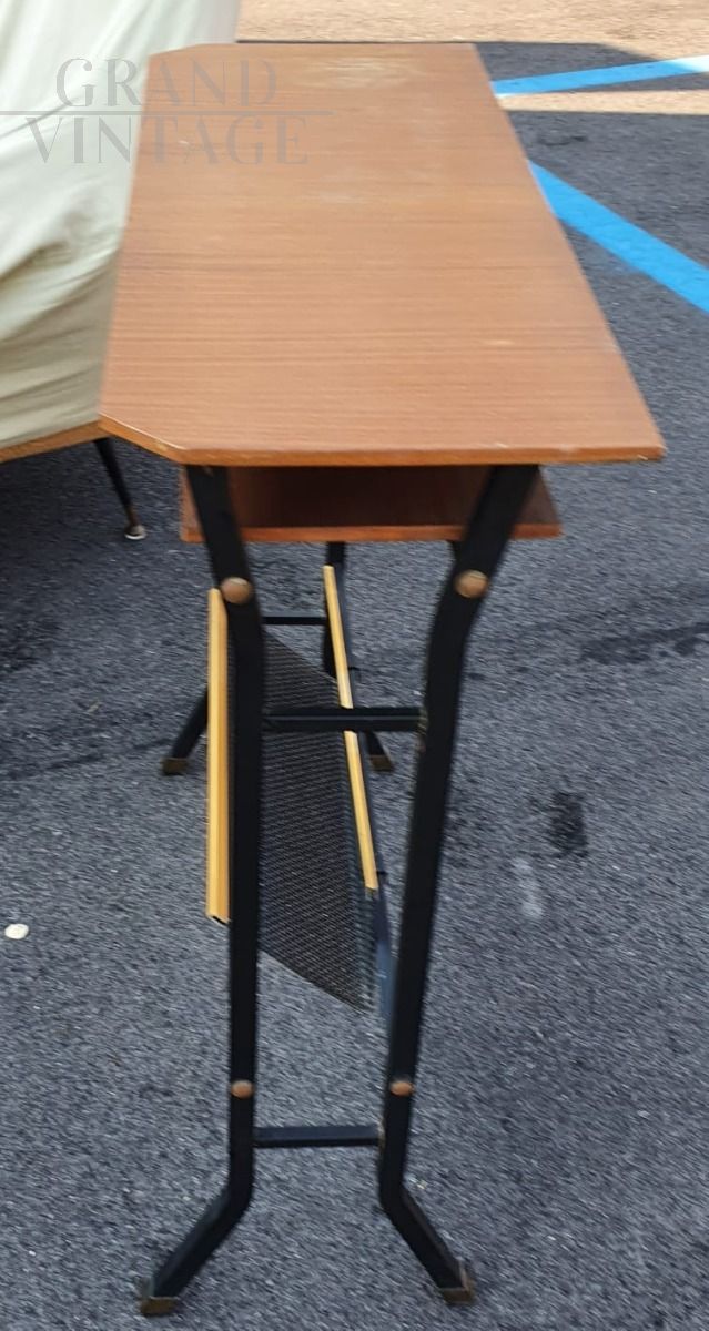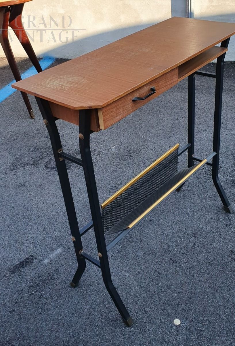 Vintage 70s teak wood console with drawer and magazine rack in black lacquered metal, enriched with beautiful brass details, Scandinavian style. In good condition, the magazine rack is removable.