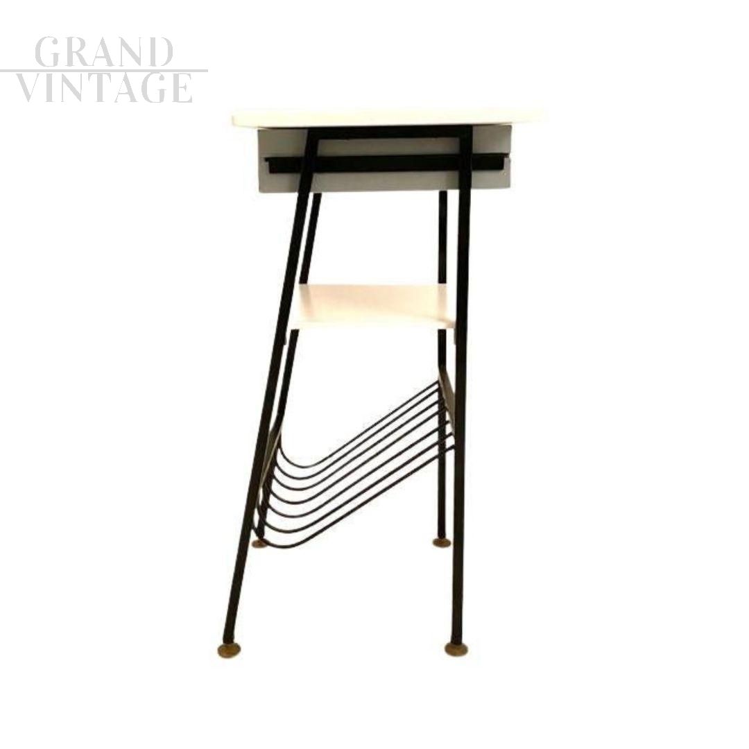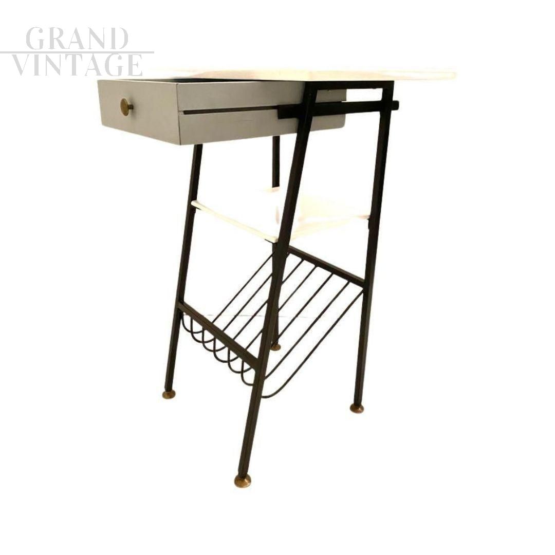 Pretty vintage console with magazine rack from the 1950s, with painted iron structure and white / light blue top with drawer. Brass feet. Restored and in excellent condition, it shows the natural signs of aging.