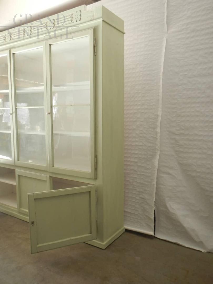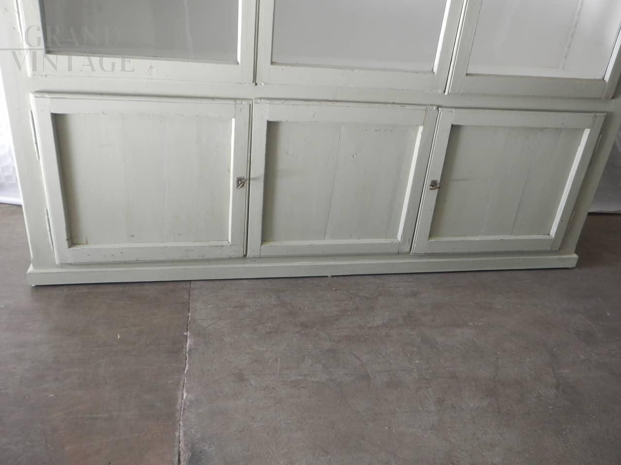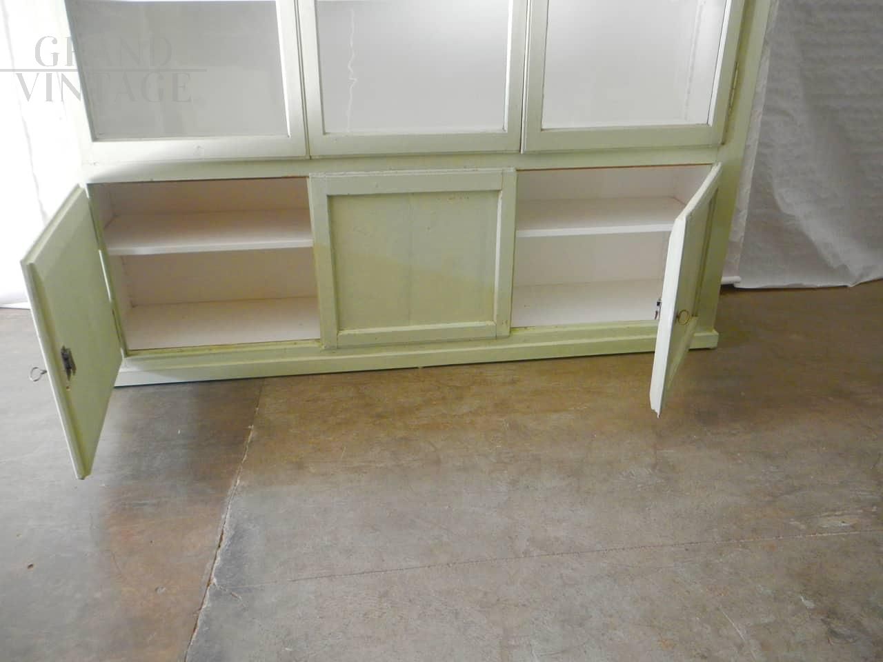 Large vintage fir wood display cabinet in green paint, from a 1950s stationery shop.