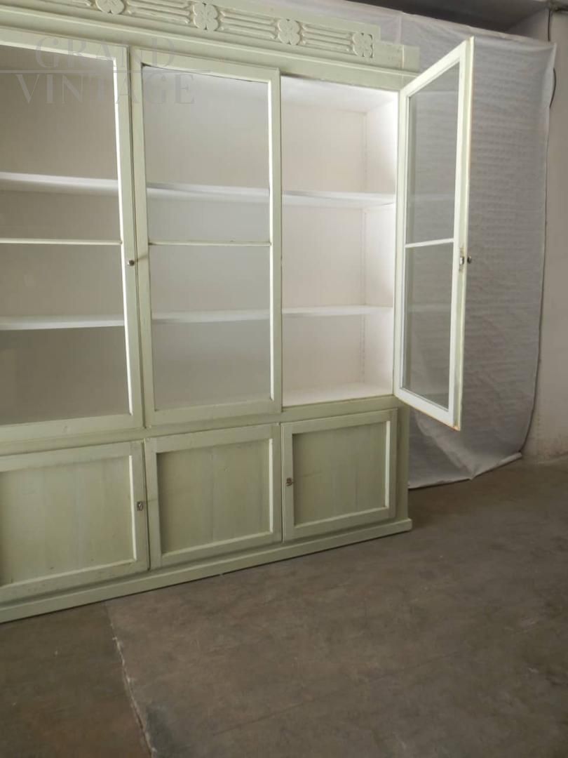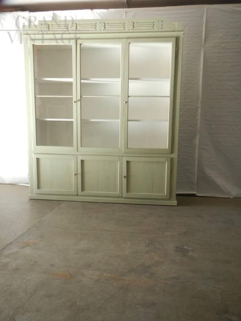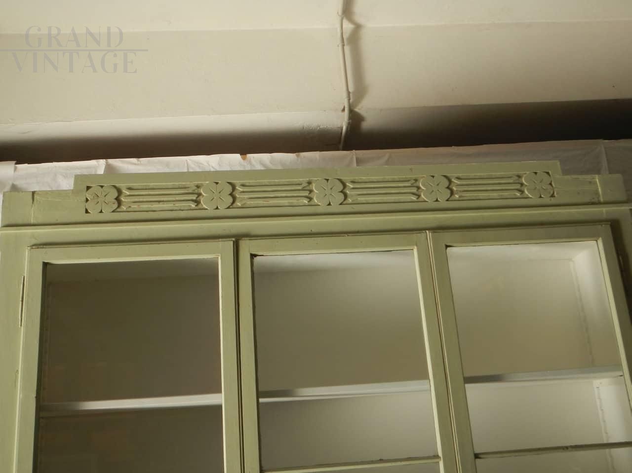 The sideboard has a lower part made up of 2 compartments and 3 closed doors, and an upper part closed by three glass doors and organized in internal shelves in white paint, with a beautiful clover carving work on the top. Completely restored and left in patina.