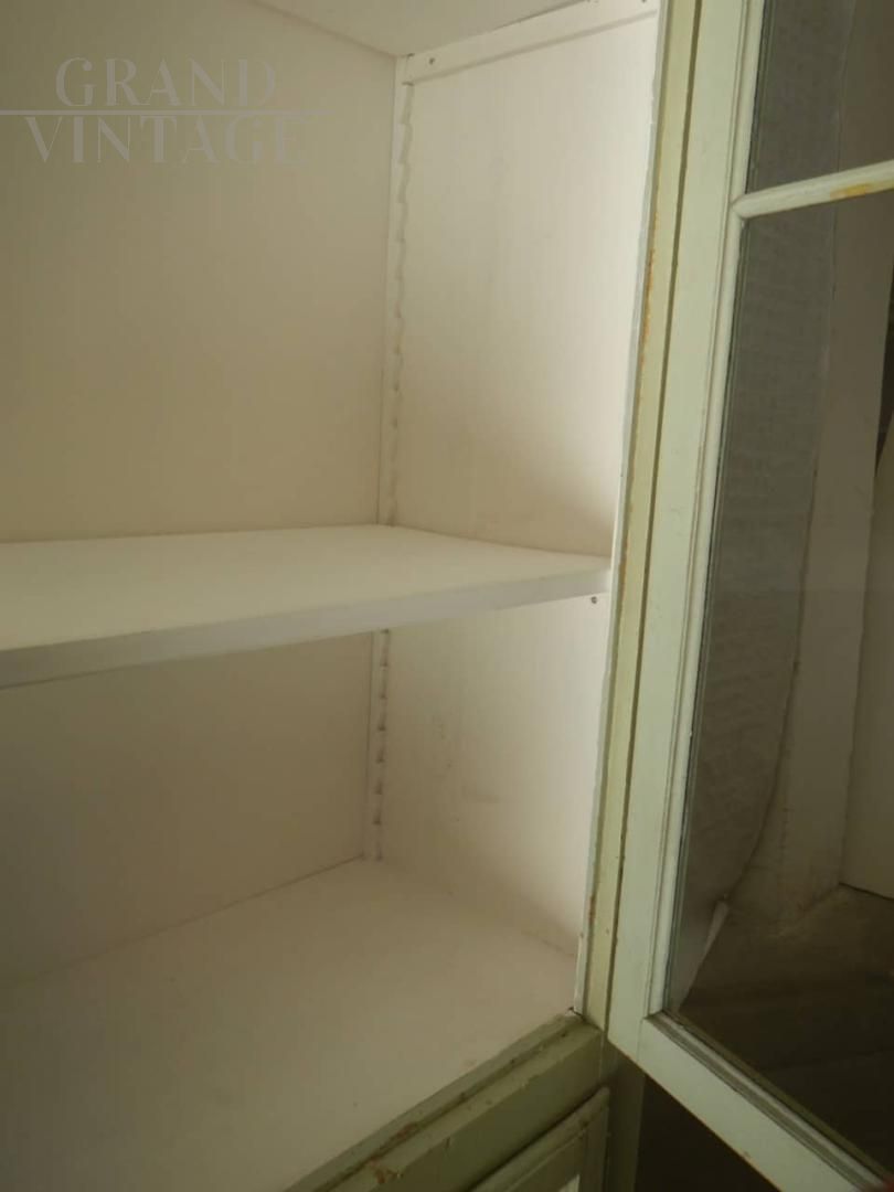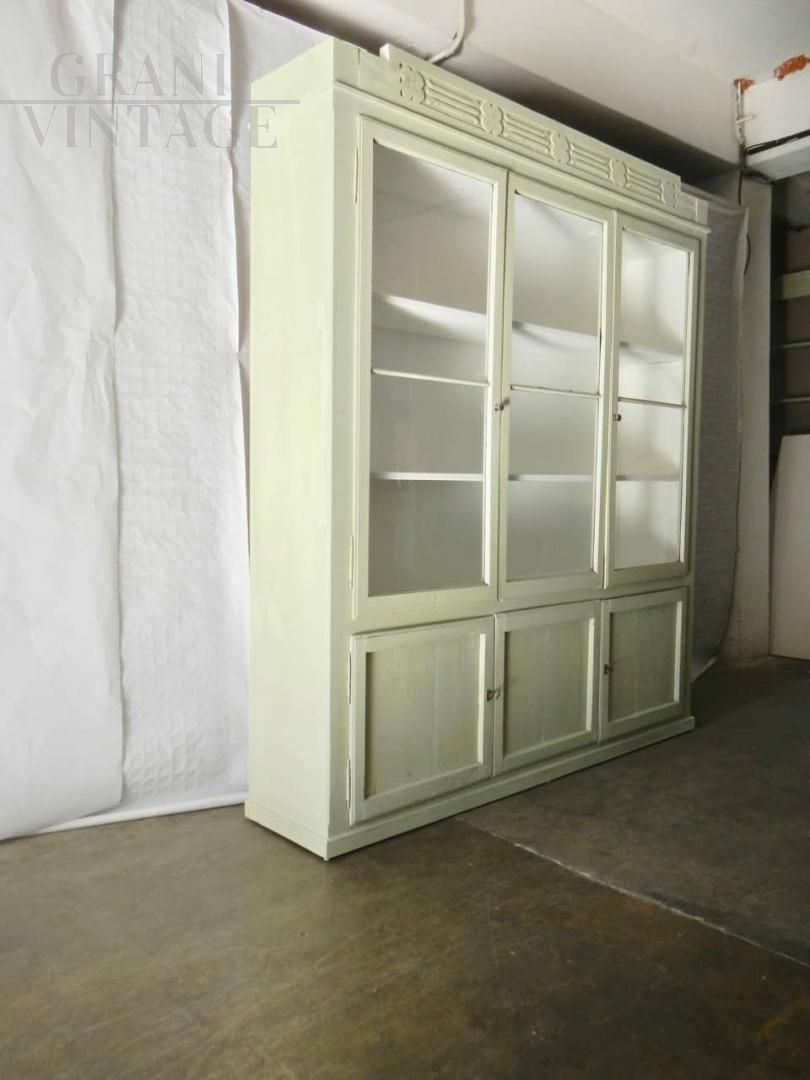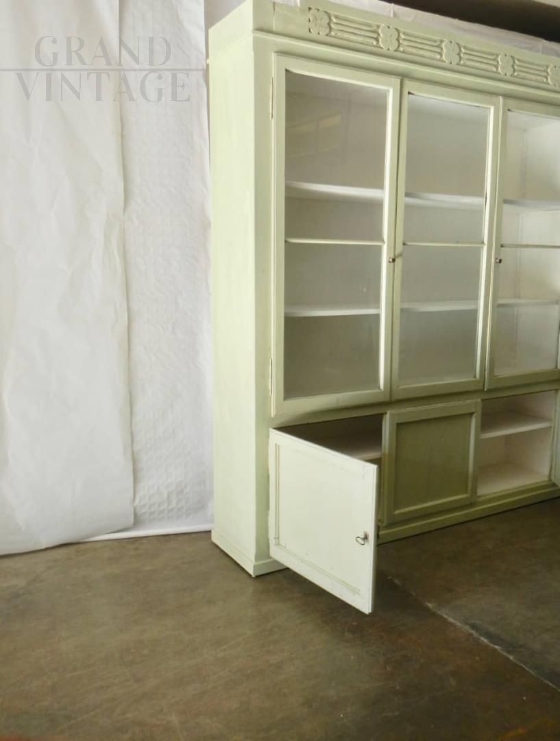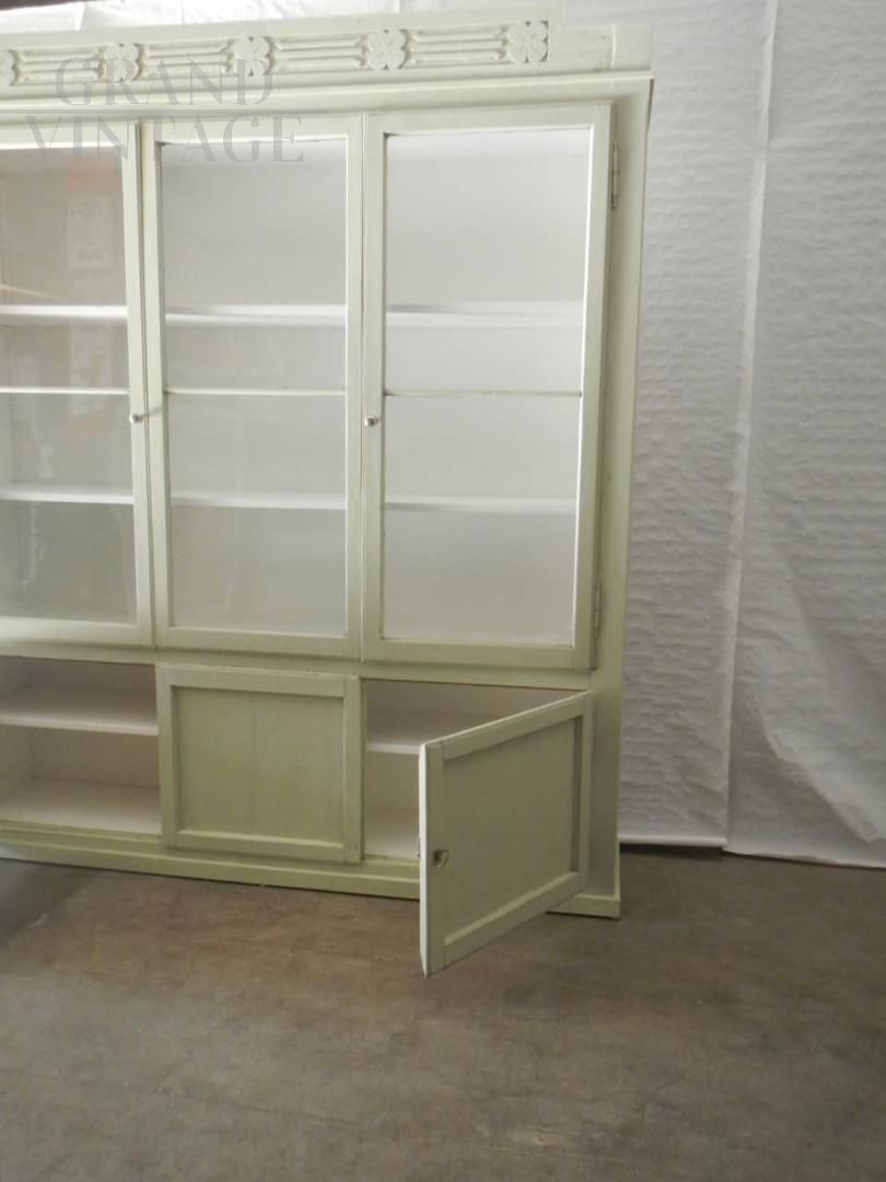 The sideboard has a lower part made up of 2 compartments and 3 closed doors, and an upper part closed by three glass doors and organized in internal shelves in white paint, with a beautiful clover carving work on the top. Completely restored and left in patina.