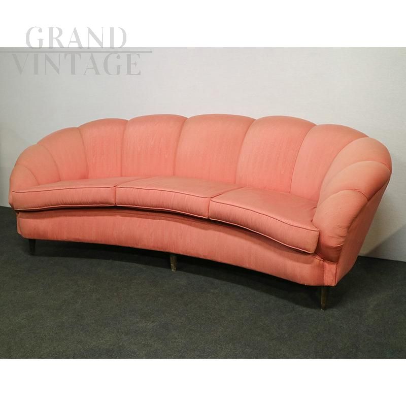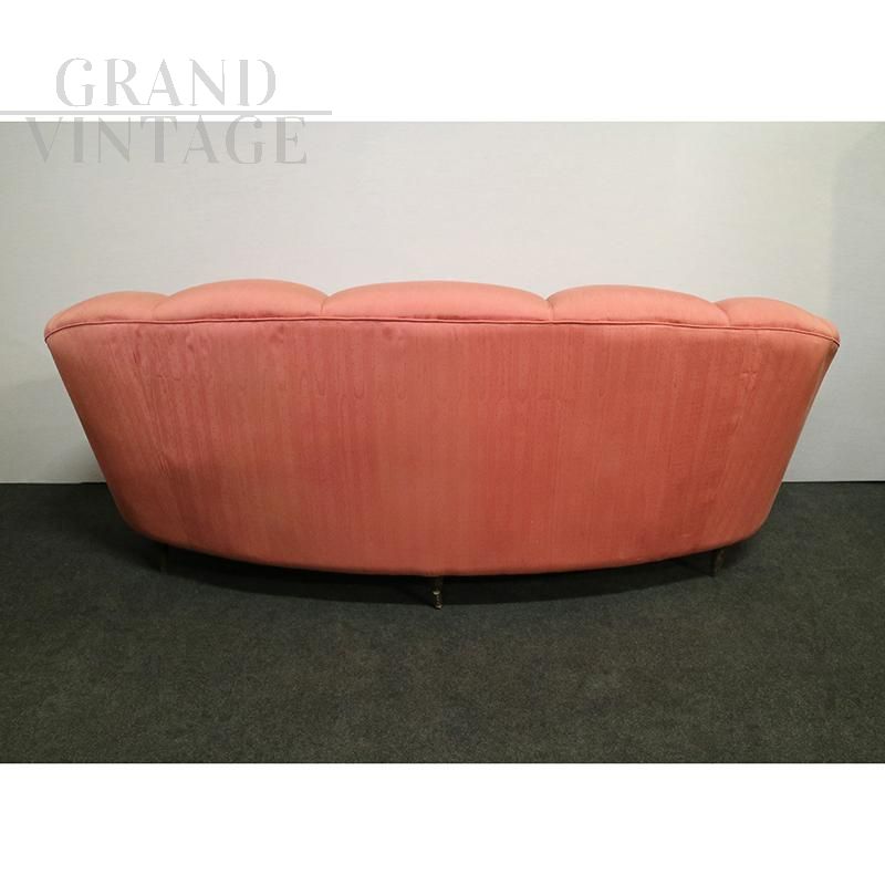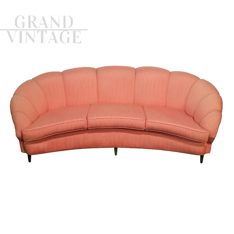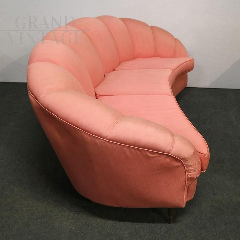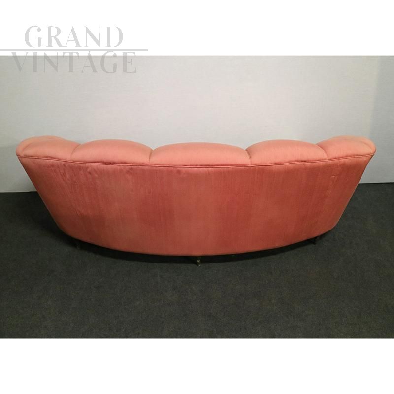 Vintage curved three-seater sofa in peach-pink velvet made to a design by Gio Ponti for Casa & Giardino, Italy 1940s - 1950s. The backrest enriches the quality due to its sinuous shape.