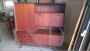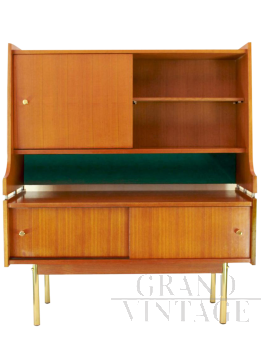 Vintage 1960s Danish highboard sideboard in teak wood. On the left side it has two drawers and some shelves closed by a door. On the right side it has a compartment with two doors, two open compartments and a beautiful compartment with mirrored interior and glass shelf, and with drop-down closure.