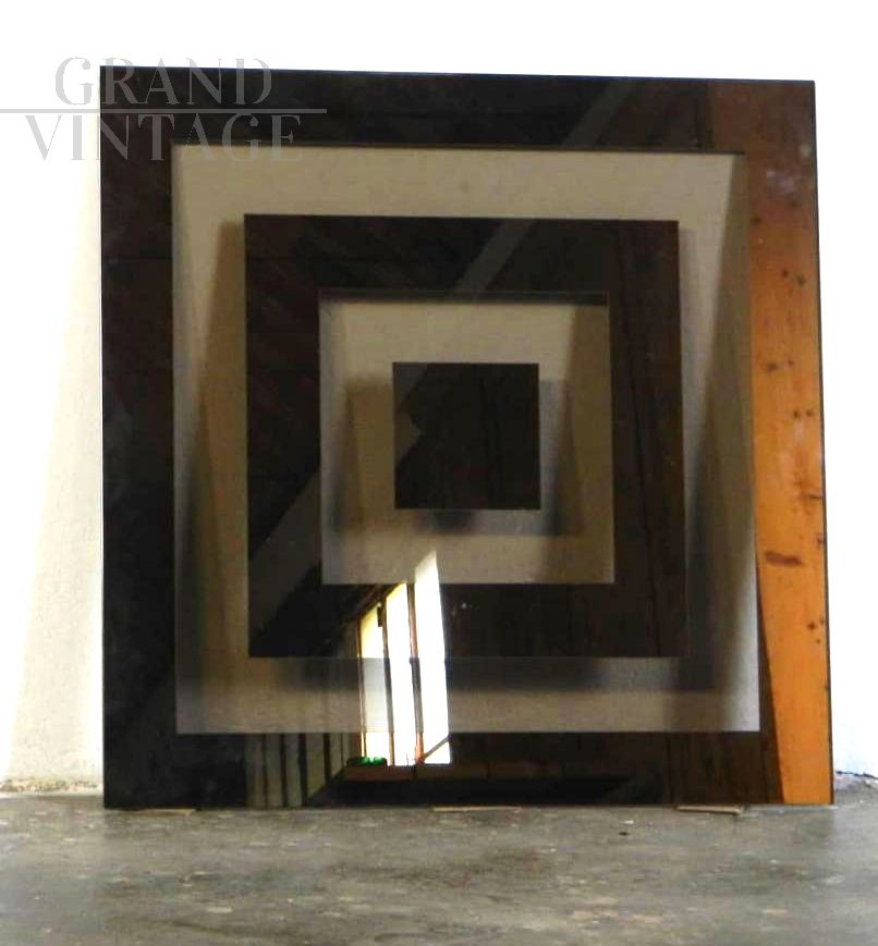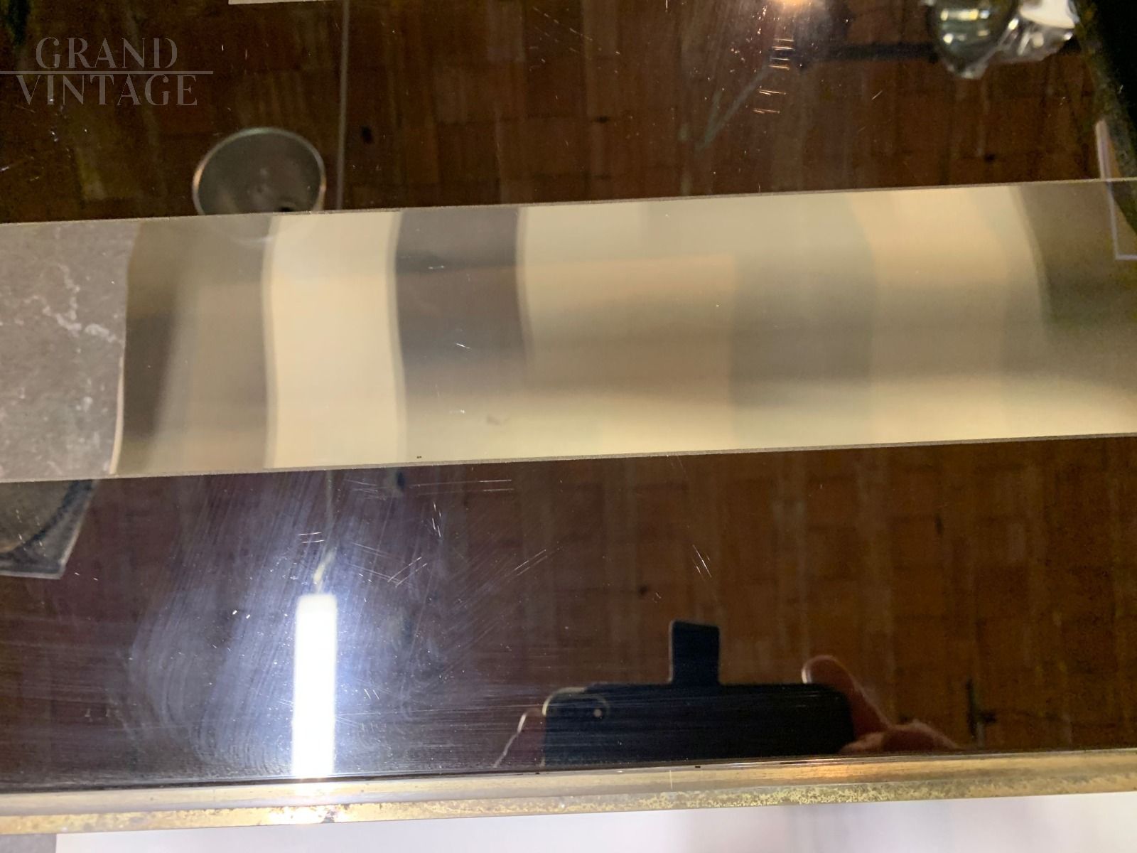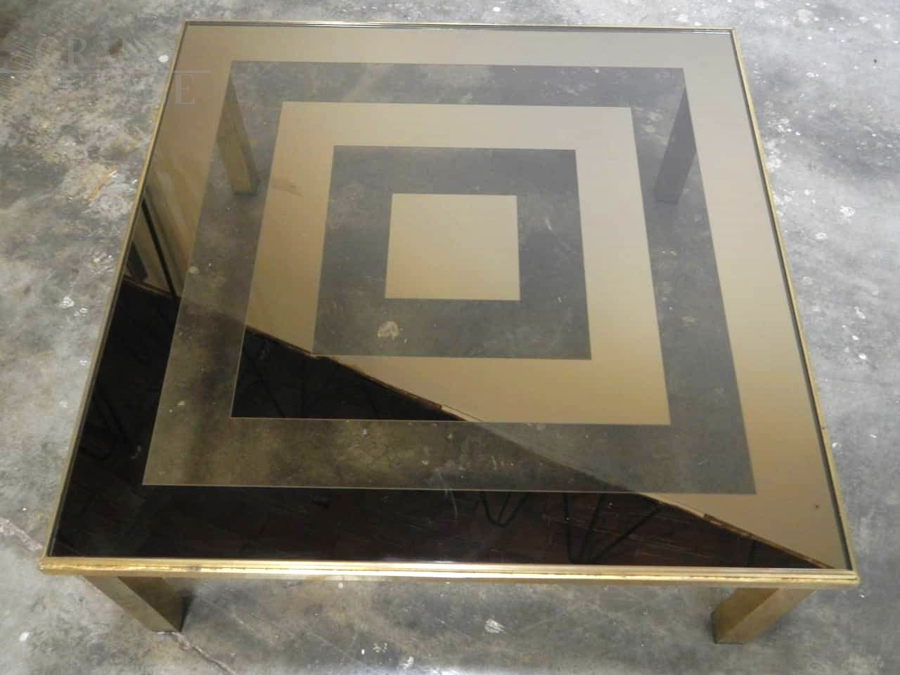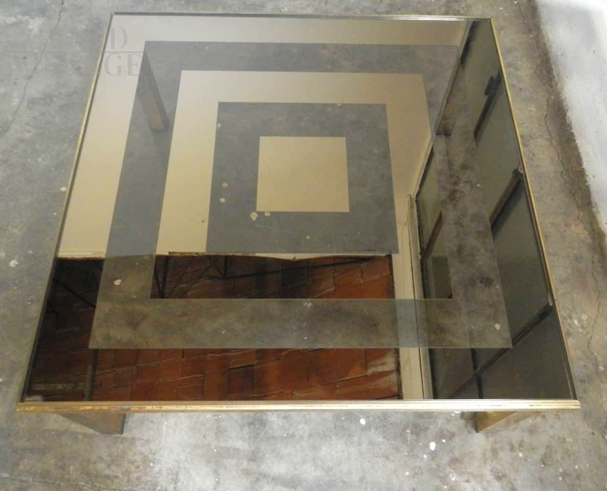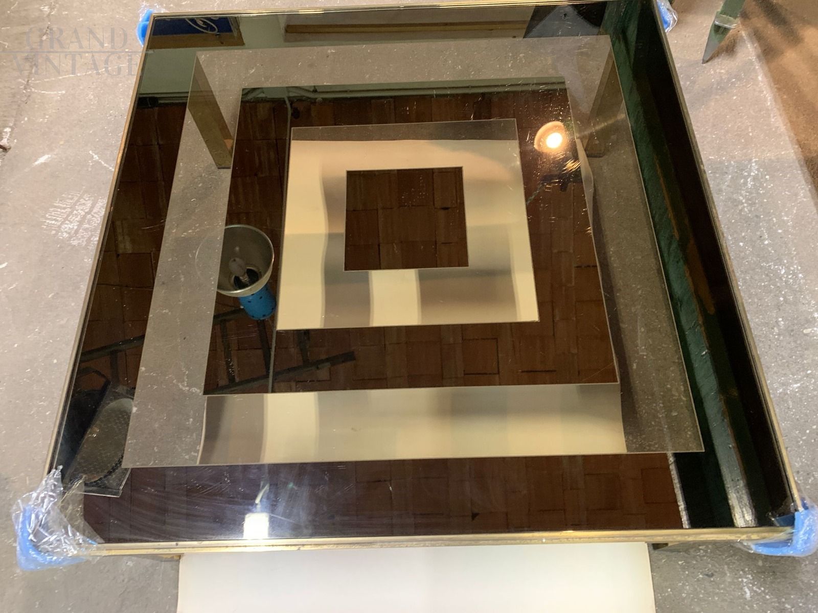Vintage coffee table in brass-plated metal and two-tone golden and smoked glass, Italy, 1970s.