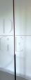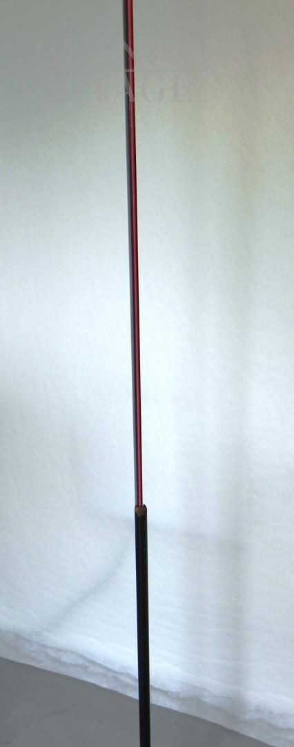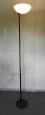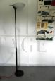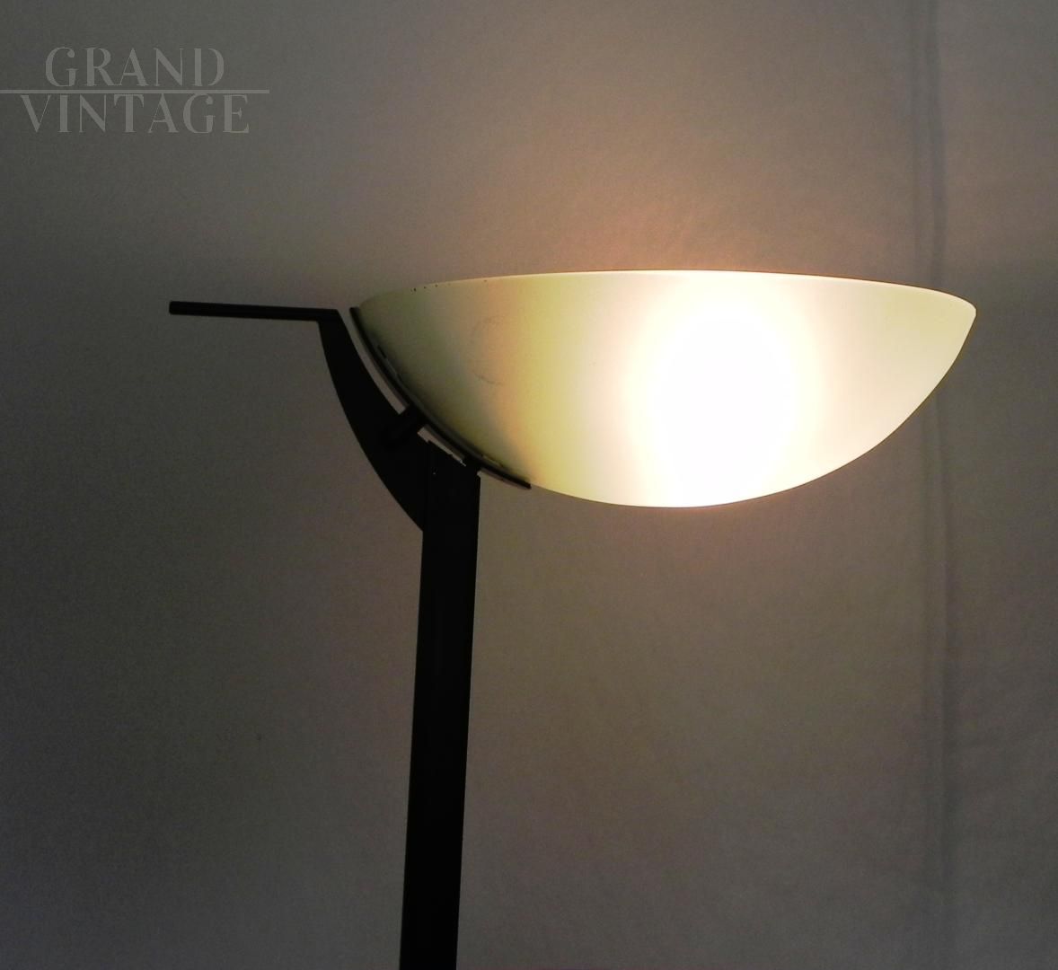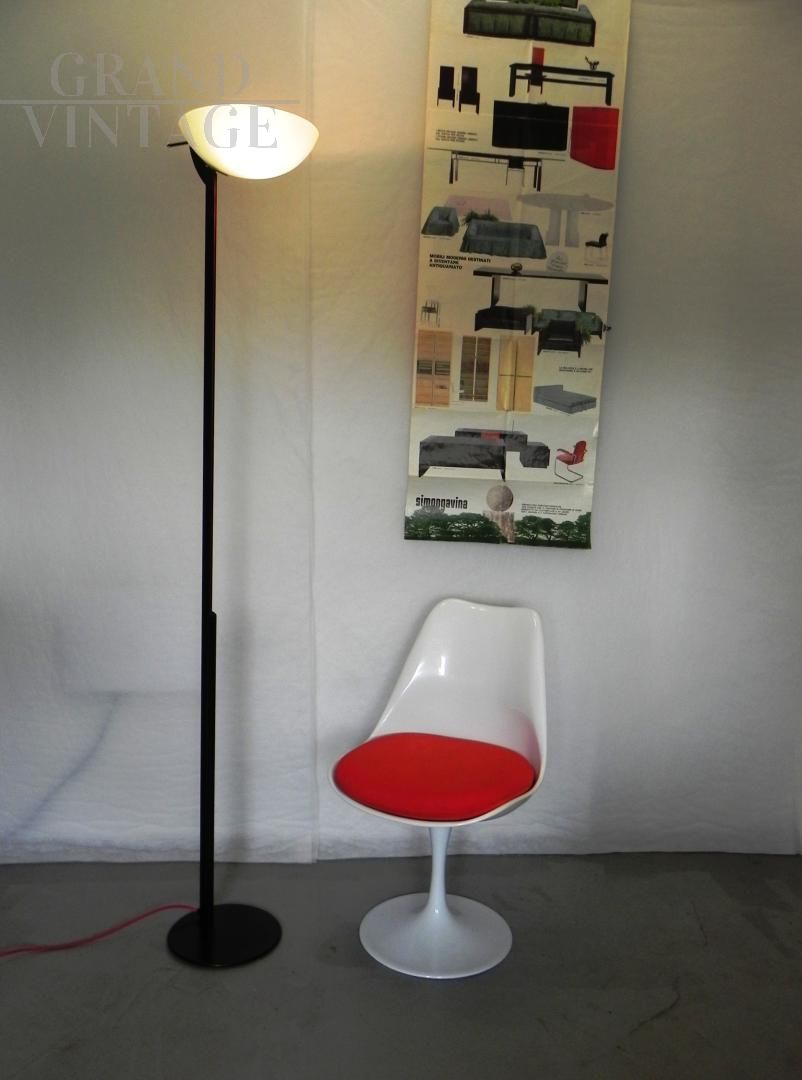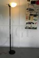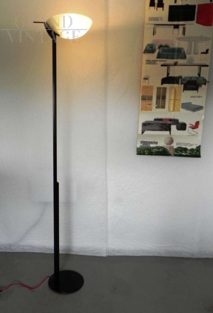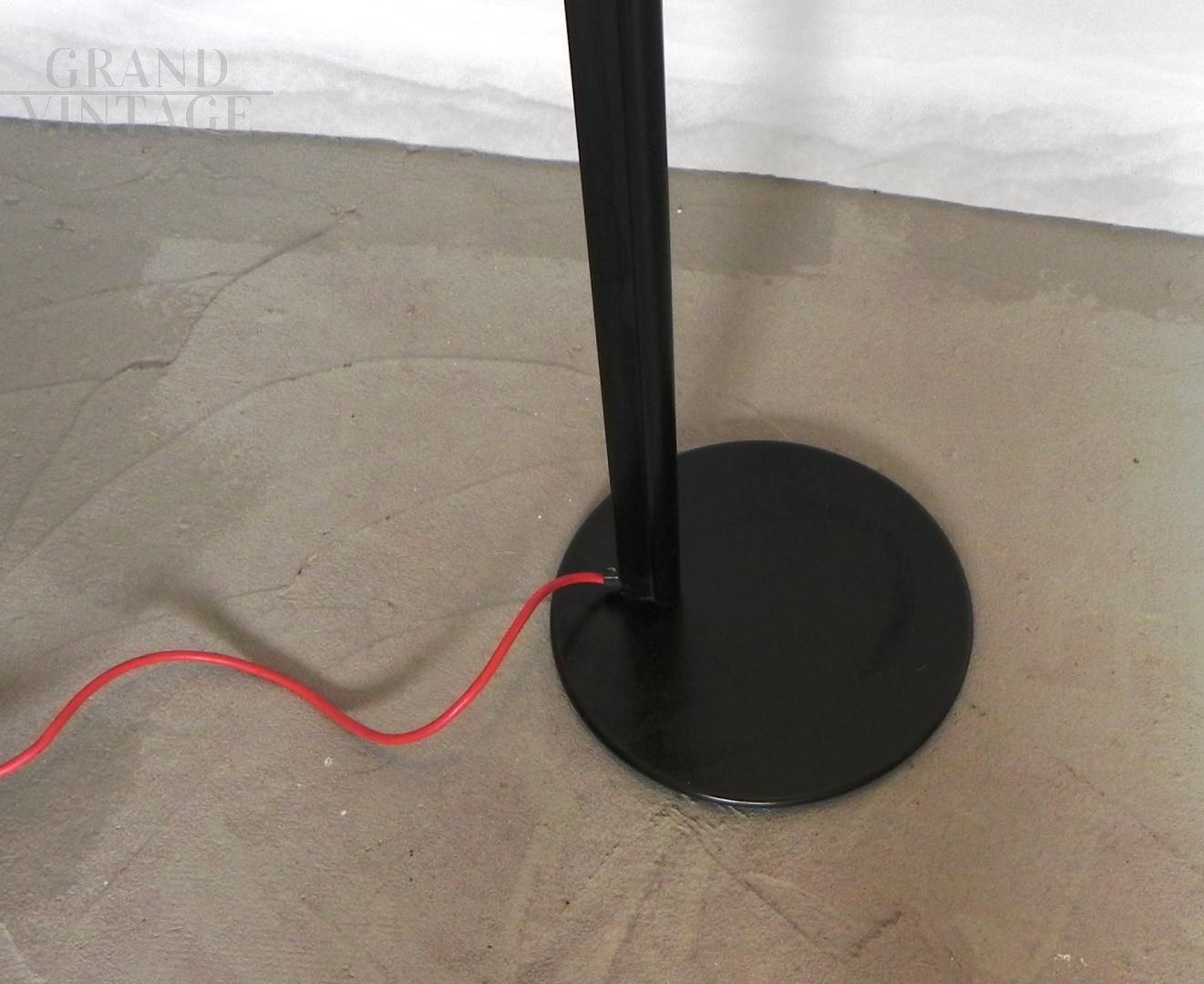 1980s design floor lamp with metal and plastic structure, acid-etched glass lampshade. Used but well preserved, with foot switch. Requires an E27 bulb.