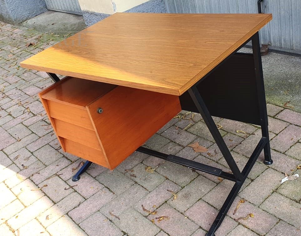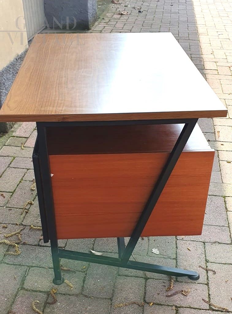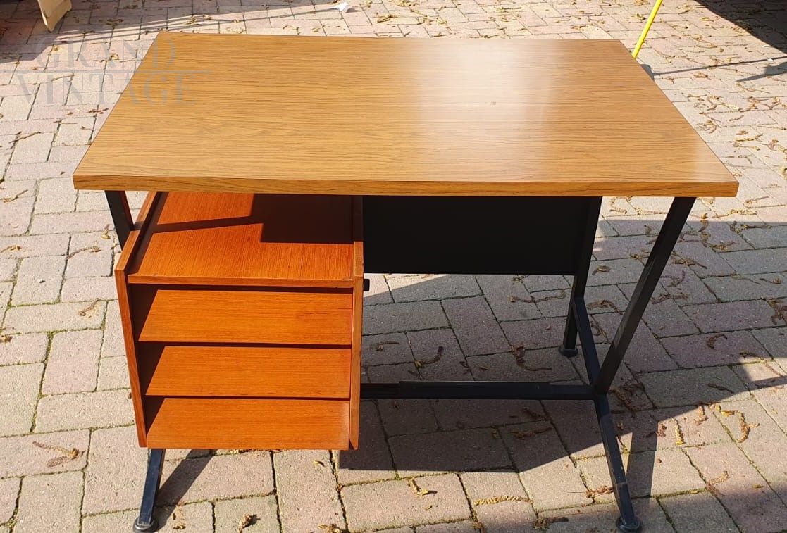 Beautiful 1970s Italian mid-century modern desk in teak wood with black tufted skai eco-leather front with capitonné buttons, the structure is in black lacquered iron and has a nice footrest. The desk is complete with a chest of drawers with three drawers on the left side and an oak laminate top. In excellent condition.