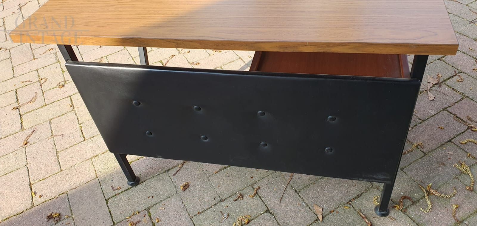Vintage desk in teak wood and black tufted skai leather
