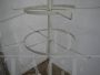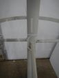 Vintage display stand in white lacquered metal, with metal supports for envelopes, dismountable and with working wheels, 70s industrial style.