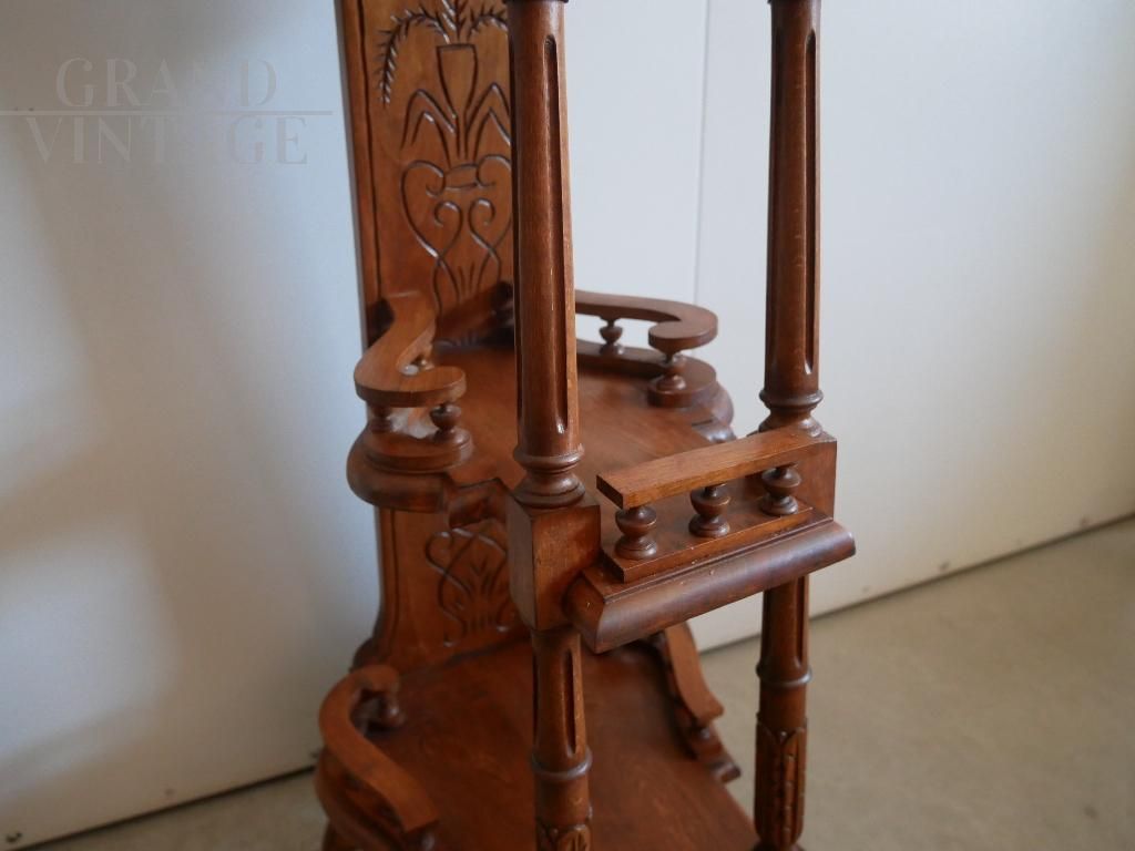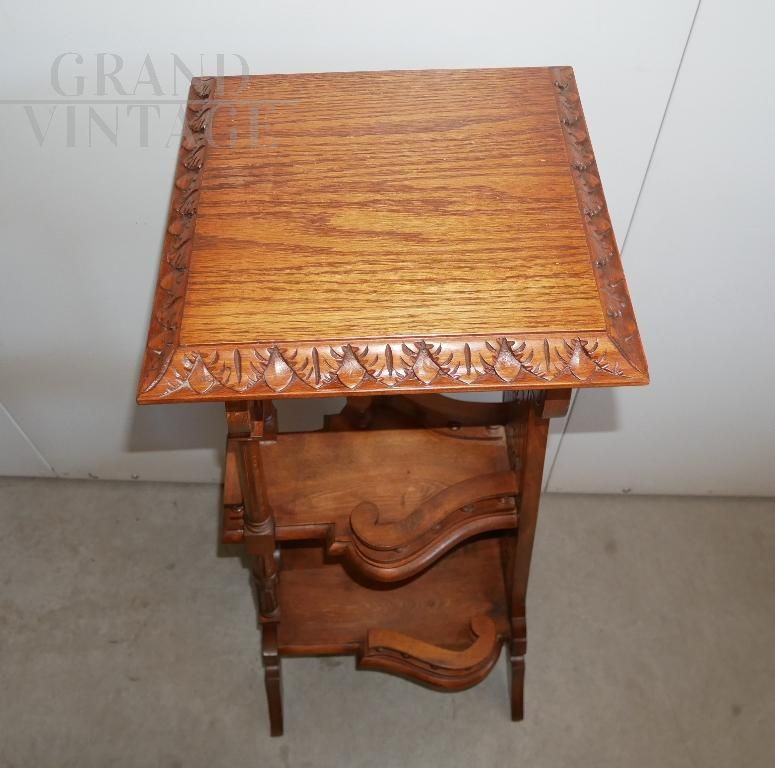 Vintage pedestal plant stand in solid beech wood richly carved in an eclectic style with floral motifs. The plant stand features a 31 x 31cm oak top with beautiful carved edges, and two wavy lower shelves with high edges.