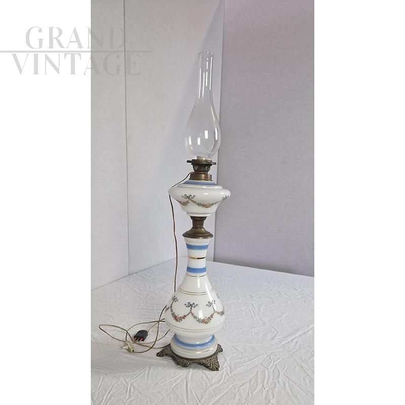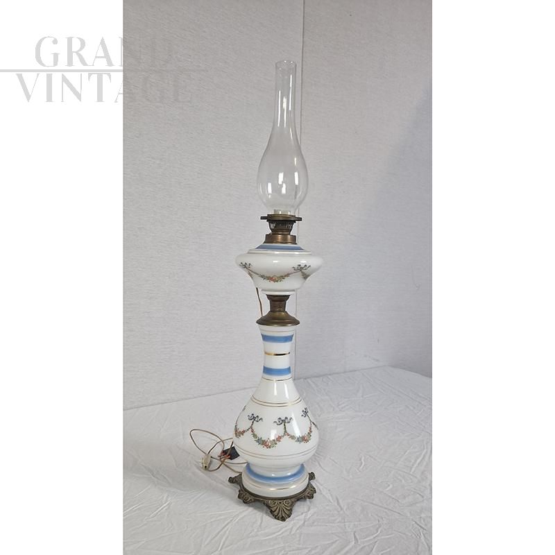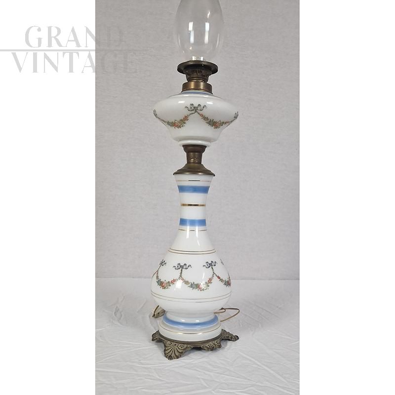 Beautiful table lamp with worked bronze base, hand-decorated opaline Murano glass stem and transparent glass lampshade, electrified.