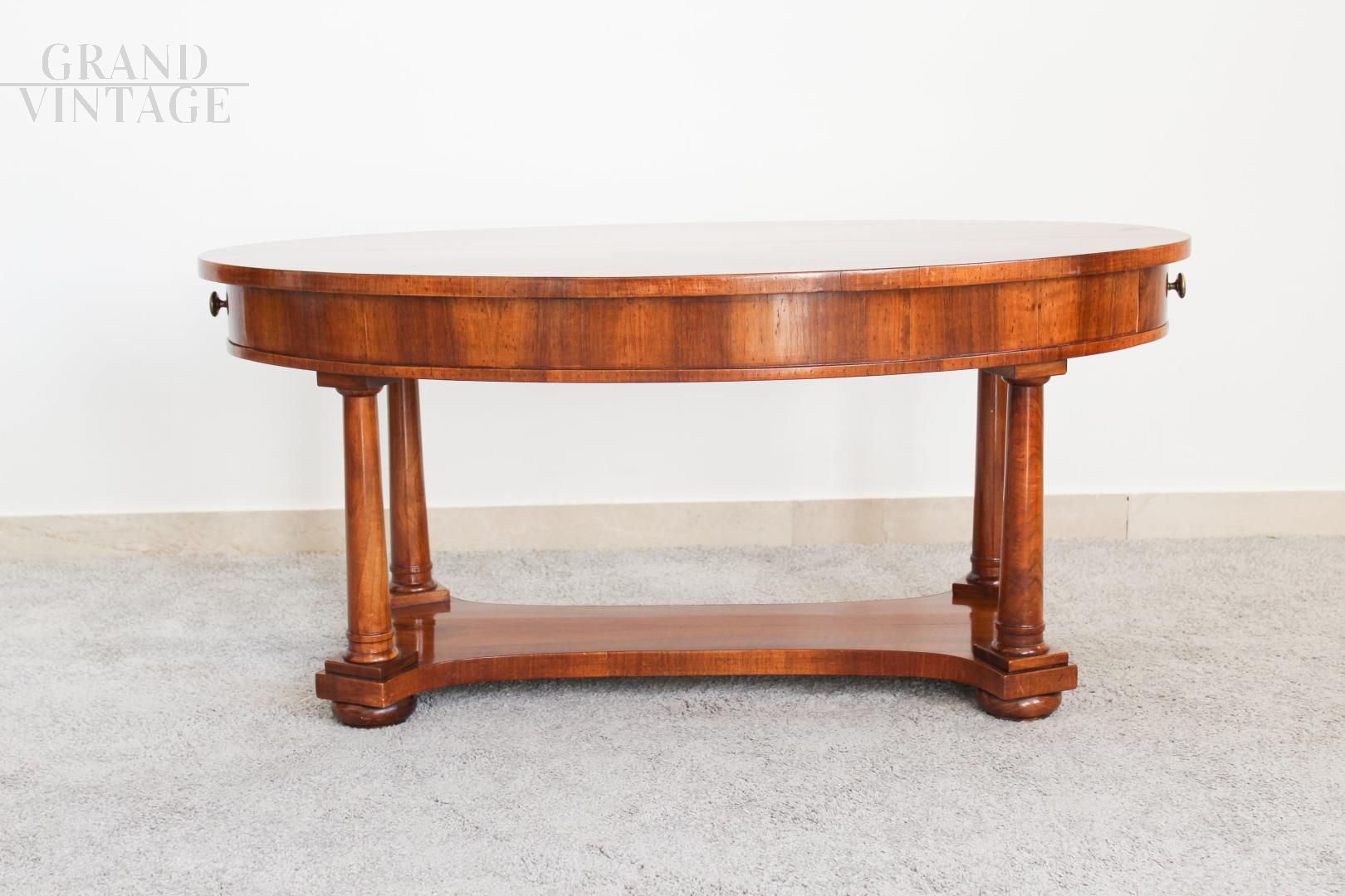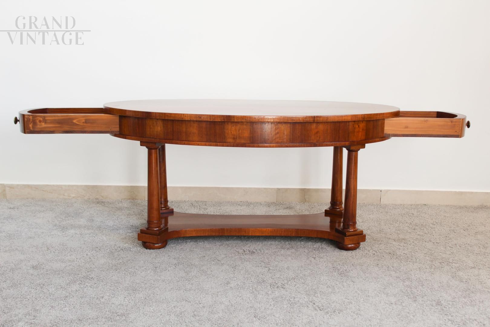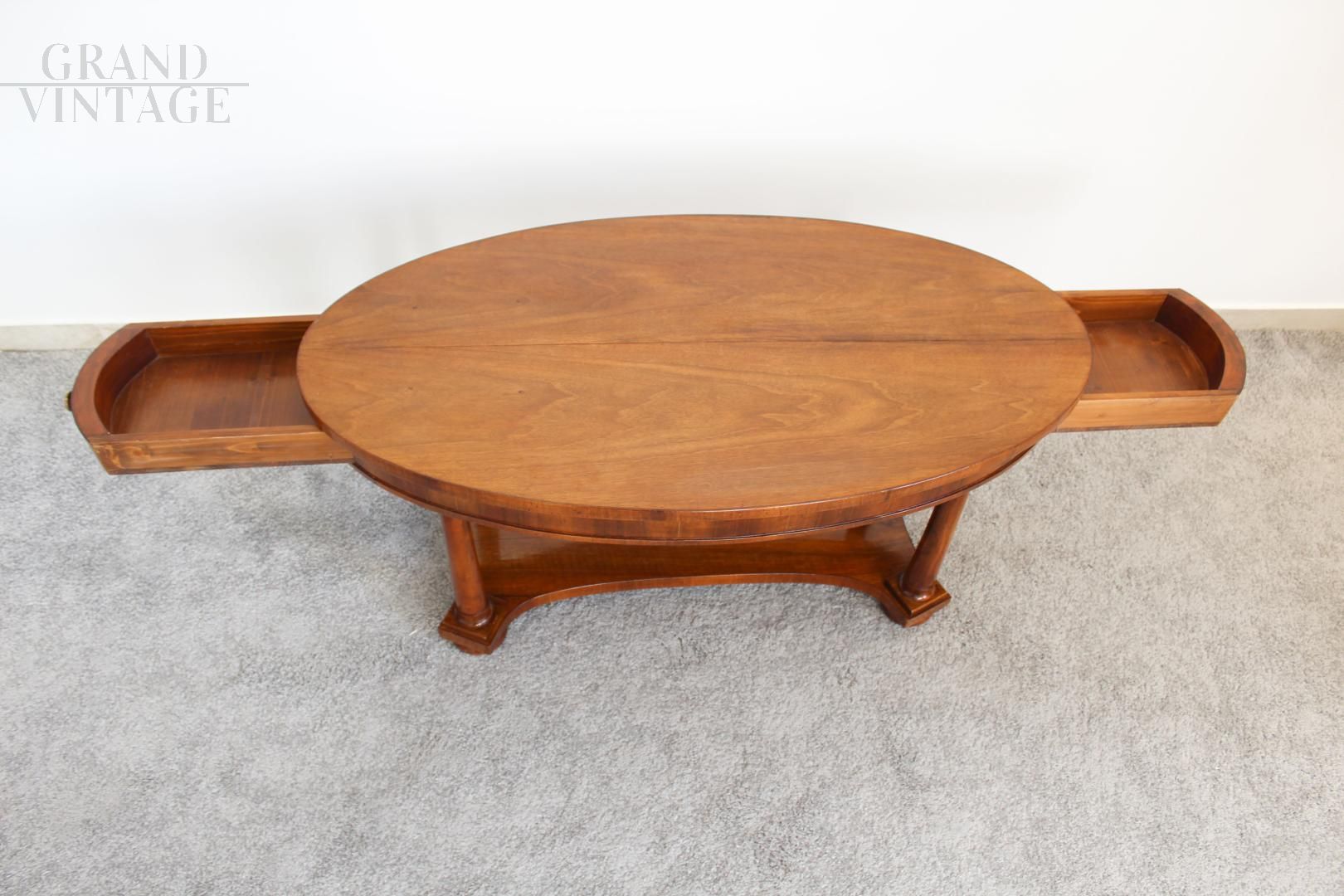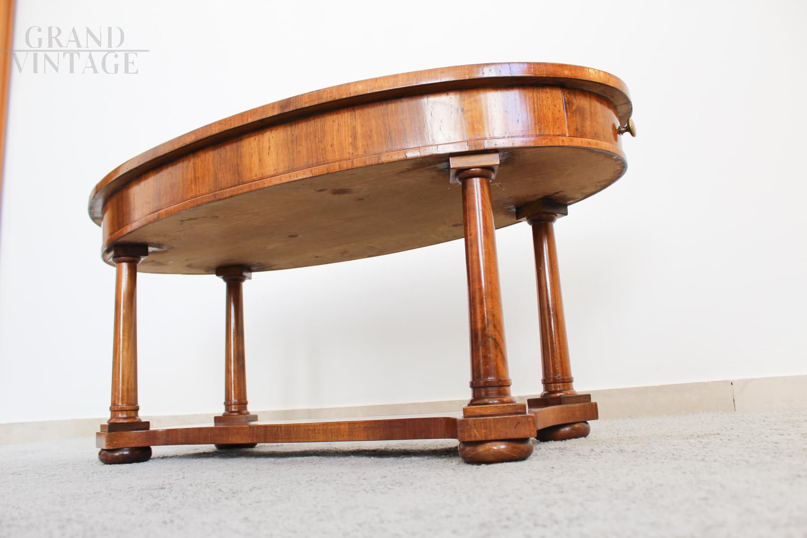 Vintage Empire style coffee table with 2 side drawers, in walnut wood, Italy 1940s.