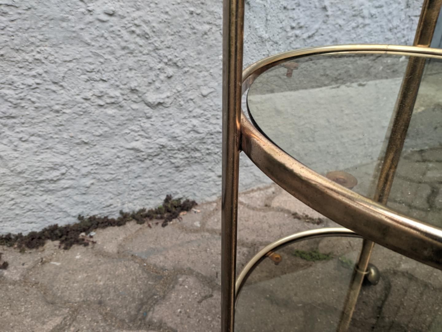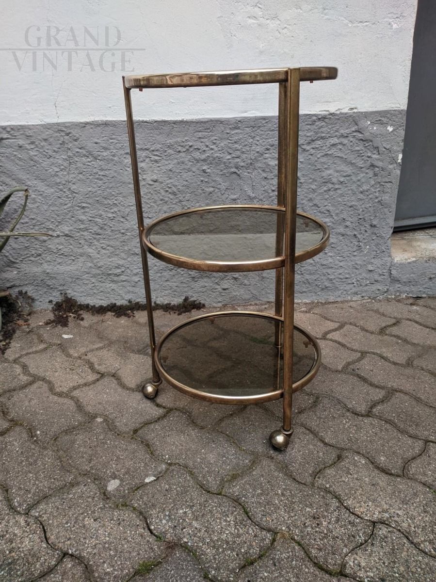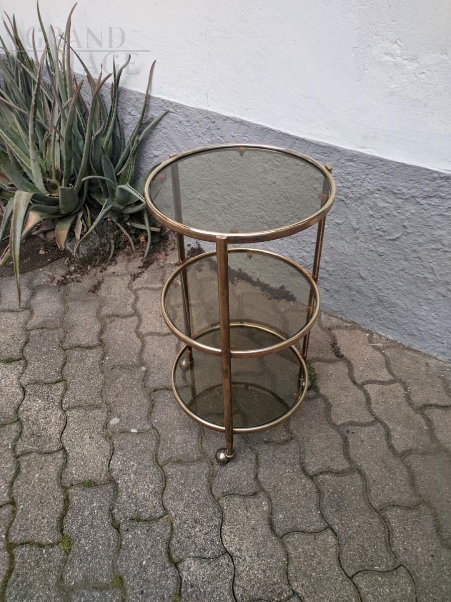 Particular vintage whatnot coffee table with wheels, with structure completely in brass, including wheels, and smoked glass shelves. Dated around 1960.