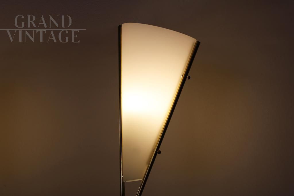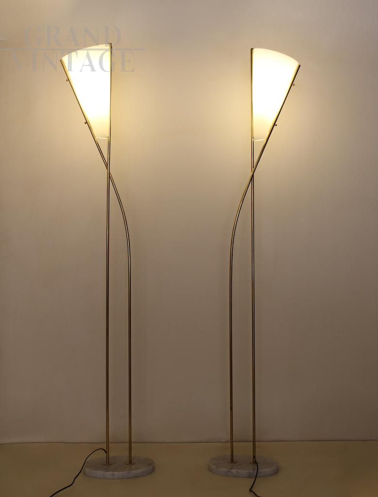Elegant vintage floor lamp with white marble base, double braided brass stem and white opaline glass cone lampshade. Origin: Italy, 1970s, pair available, price refers to the single piece.