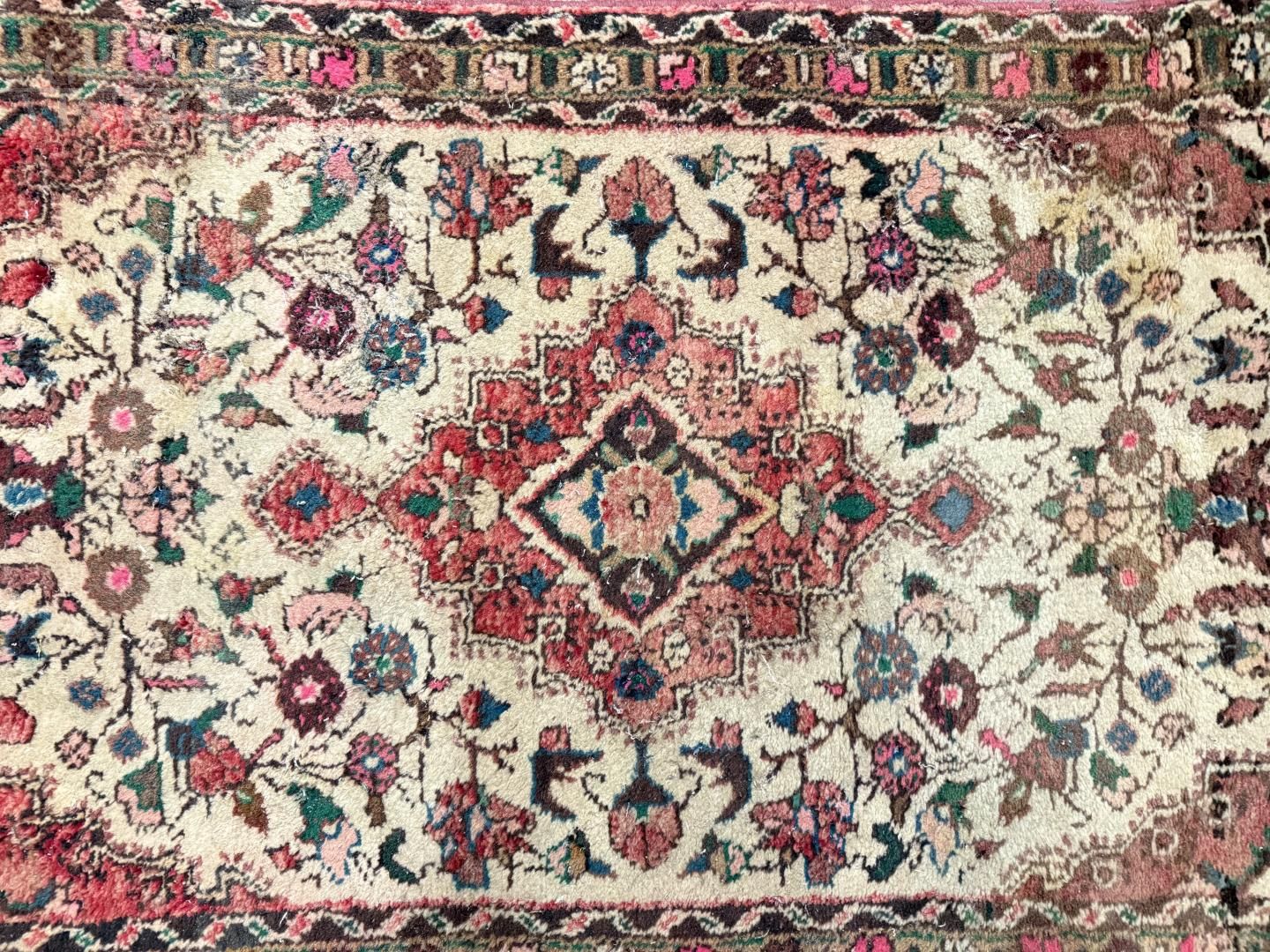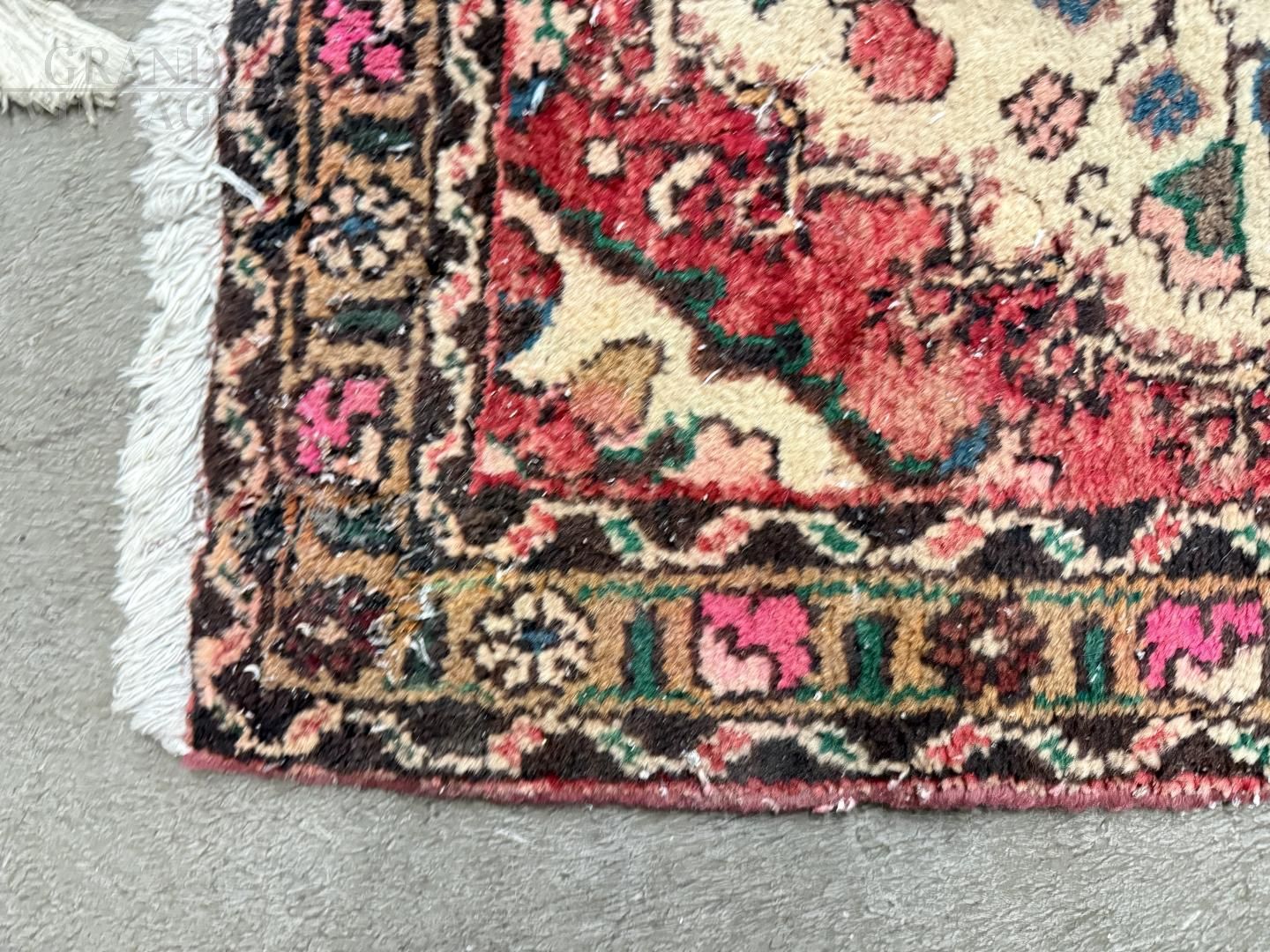 Vintage Persian rug with pink floral decorations, 141 x 81 cm, in good condition, with defects and wear due to time.