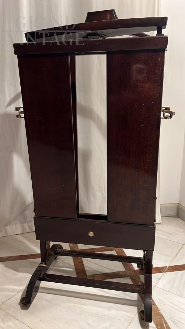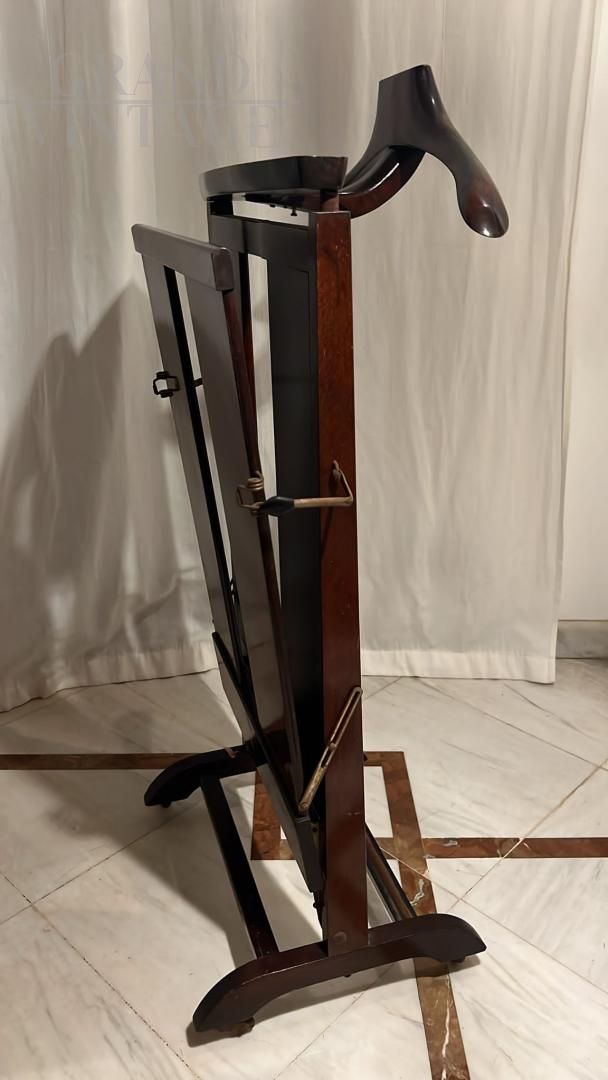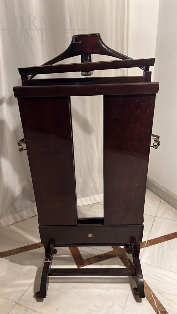 Vintage valet stand attributed to the Reguitti Brothers with trouser folder, in walnut wood and brass, production period 1970 - 1979. Midy Century style. It shows natural signs of wear due to age