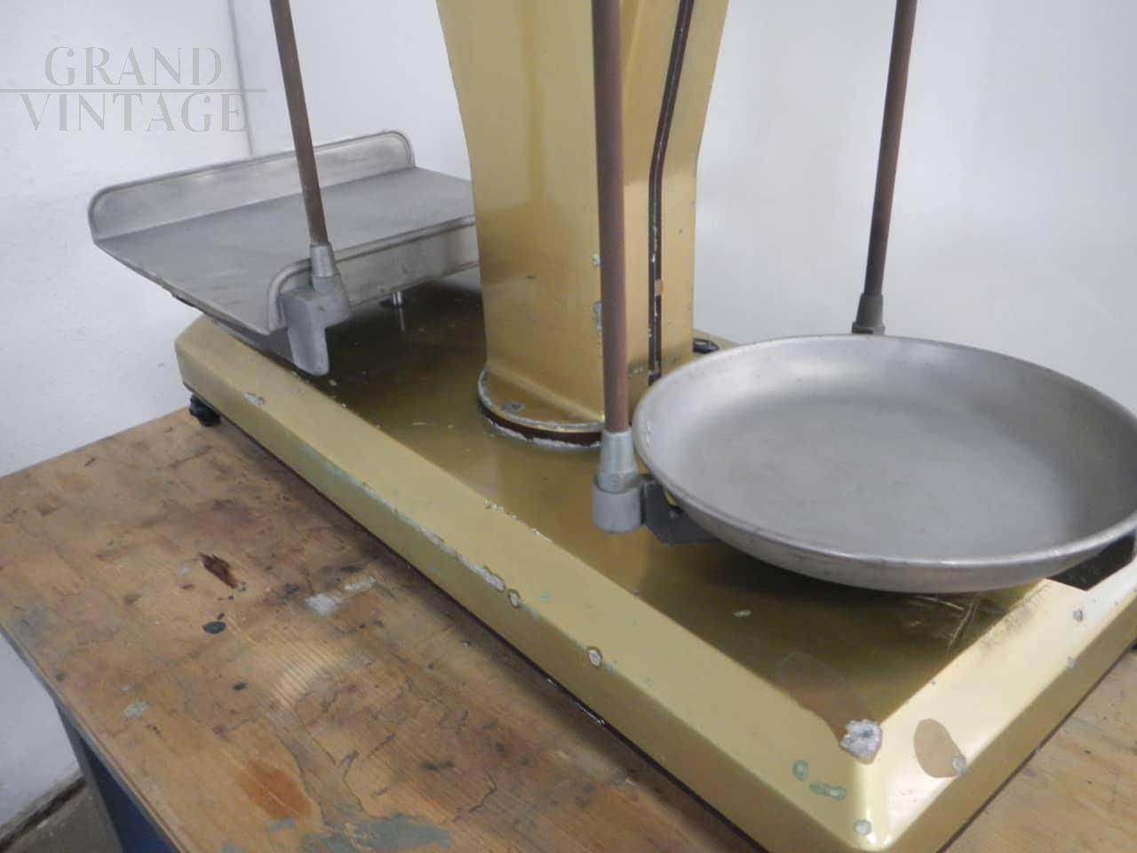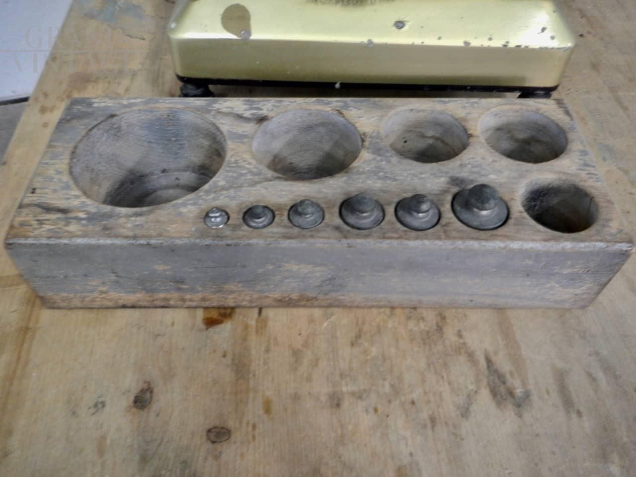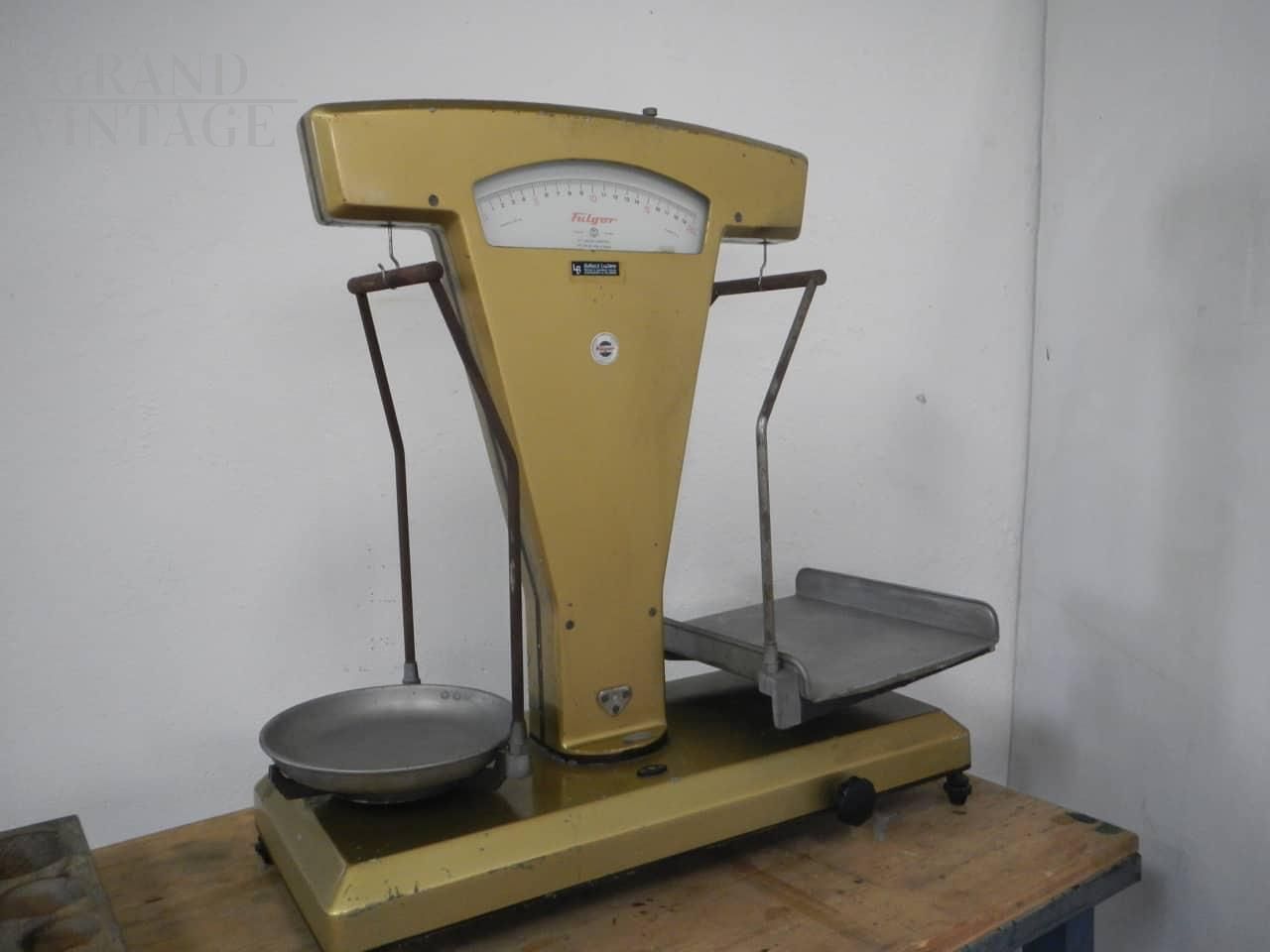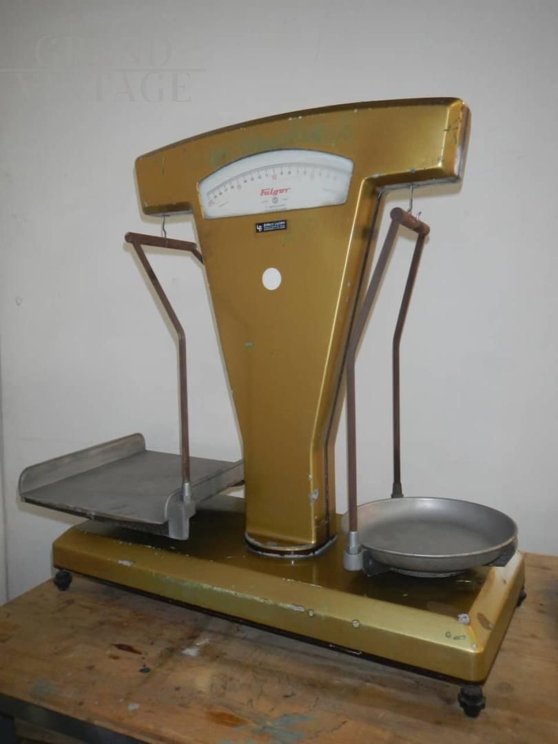 Fulgor precision goldsmith scale, vintage 1980s, in gilded metal with showcase on both sides. Steel plates, incomplete weight box. Working.