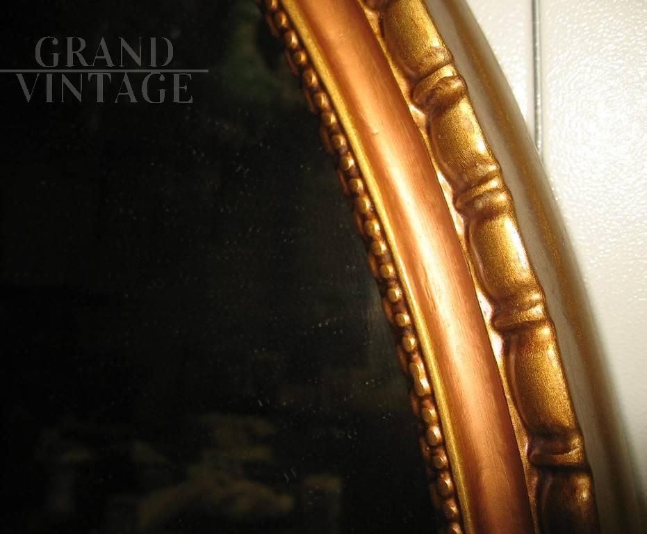 Vintage mirror with finely carved oval wooden frame gilded and decorated with coppery-colored lacquer. Nineteenth-century style, vintage from the 70s, complete with mirror. Excellent general conditions.
