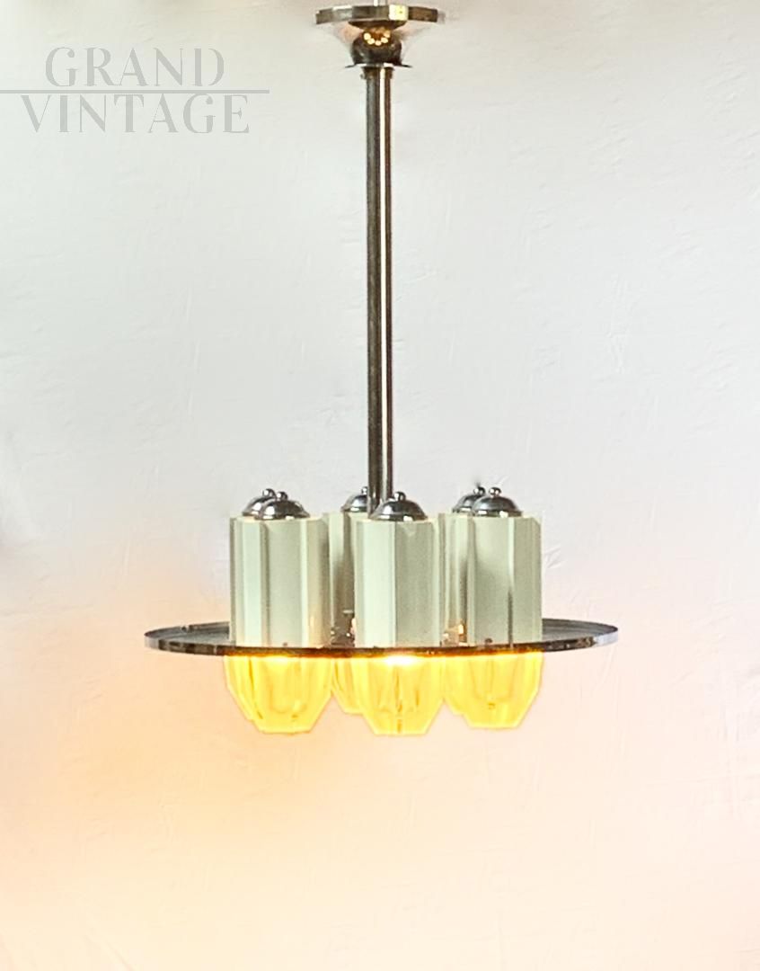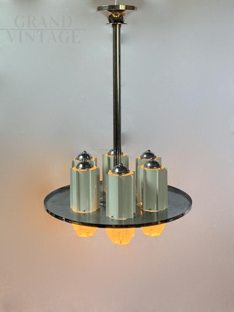 Fantastic chandelier attributed to Artemide with glass by Fidenza Vetraria, 1960s. Iron and steel structure, original paint and chrome in good condition. Of course, the frame has the classic signs of aging. The chandelier has 6 lights with E14 fitting, and weighs about 25 kg. Electric system redone and structure cleaned with special pastes;