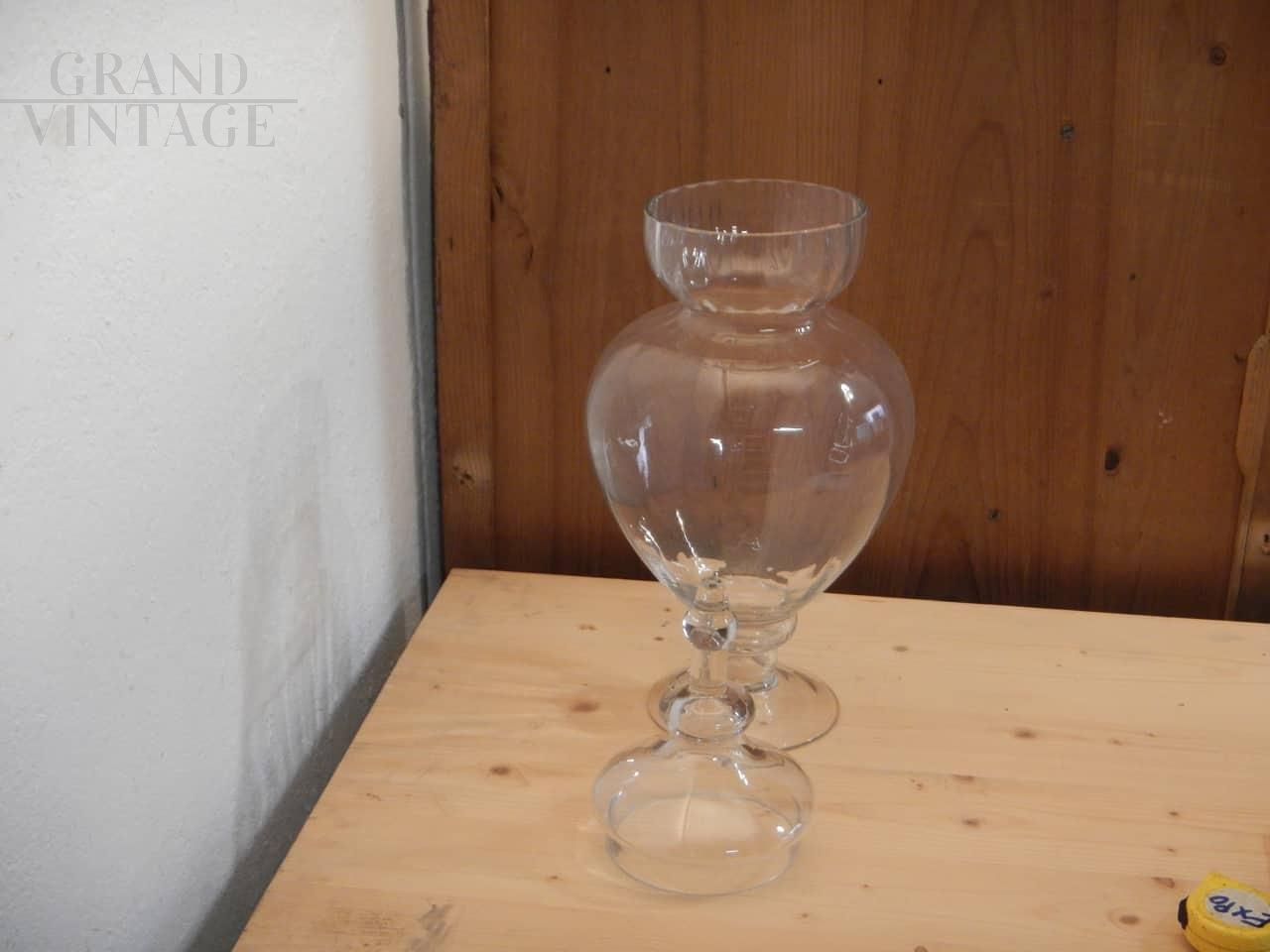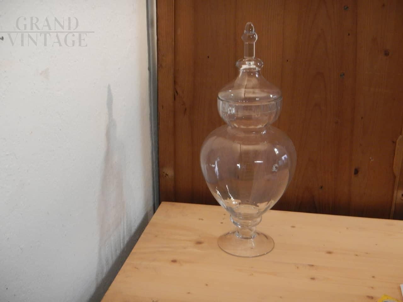 Vintage clear glass vase with glass lid, elegant shape, in good condition. The price includes a wooden box as packaging.