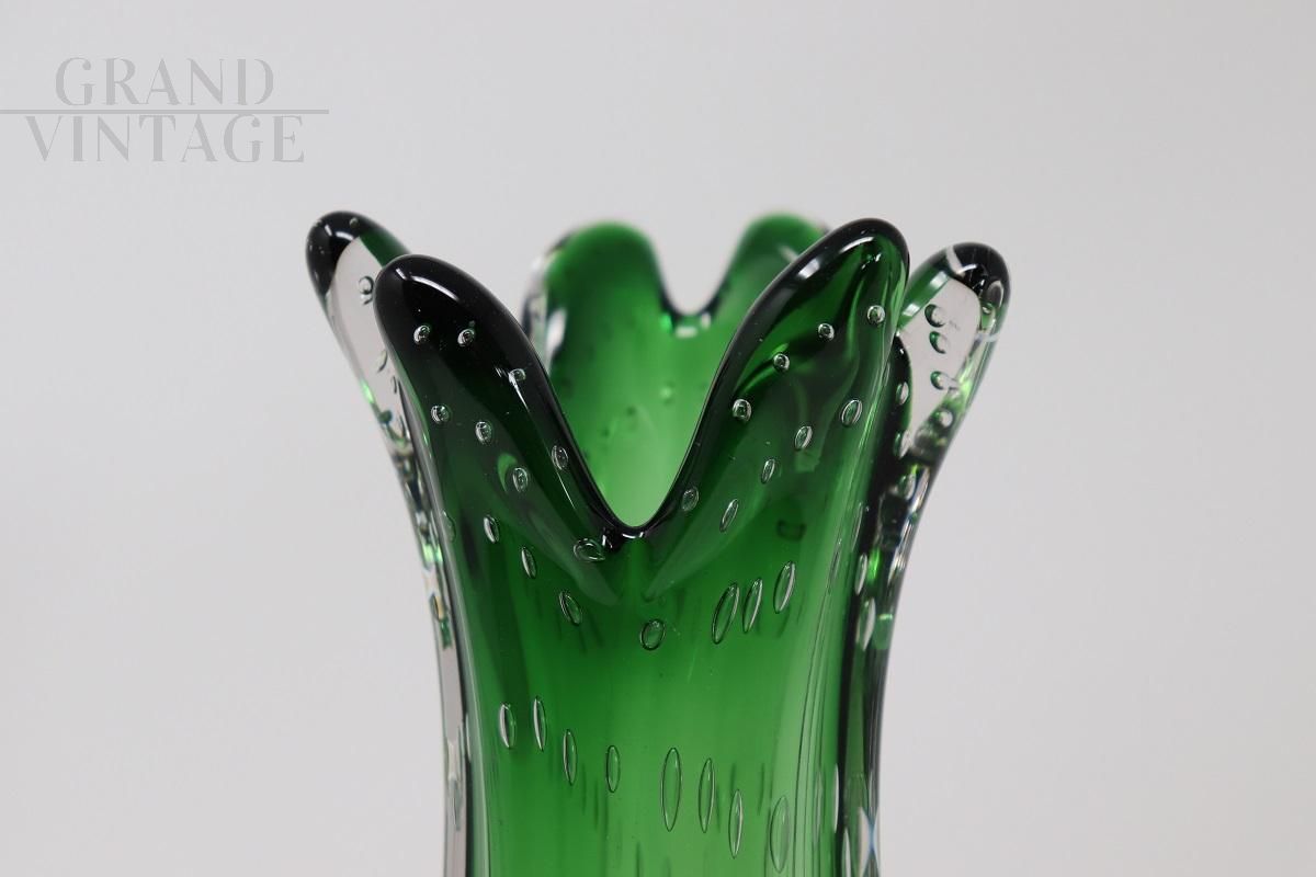 This emerald green vase is the result of artistic glass processing that makes each creation unique. The Bullicante technique not only adds a visual element of great interest thanks to the air bubbles deliberately visible inside, but also highlights the ability of the Murano glassmakers in creating effects of light and color that change with the angle and the lighting. A vase that lends itself to different locations and can be used to hold flowers or simply become a furnishing accessory to be admired. Perfect condition, price negotiable.