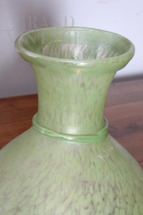 Splendid vintage green Murano glass bowl vase with golden luster reflections, in perfect condition, 1950s. Height 28 cm.