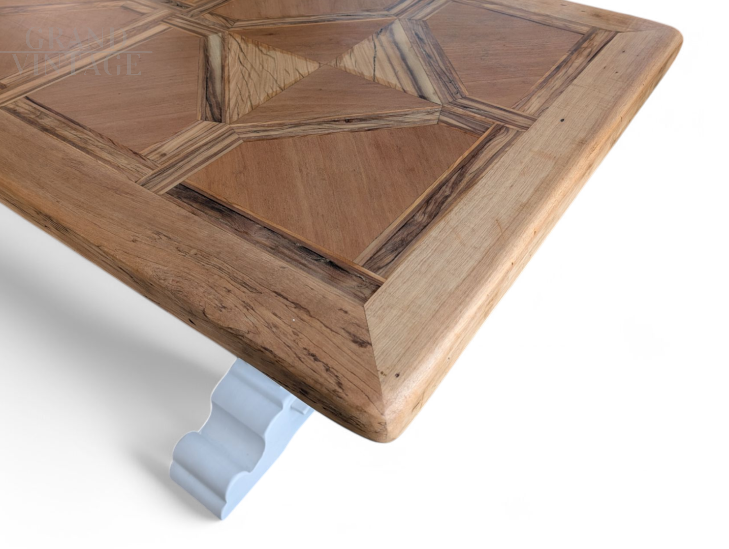 Gorgeous large rustic handcrafted refectory dining table in solid wood with wooden inlays on the top and with carved legs lacquered in white. In perfect condition, perfect for spacious indoor or outdoor environments.