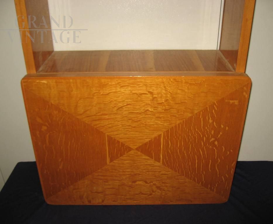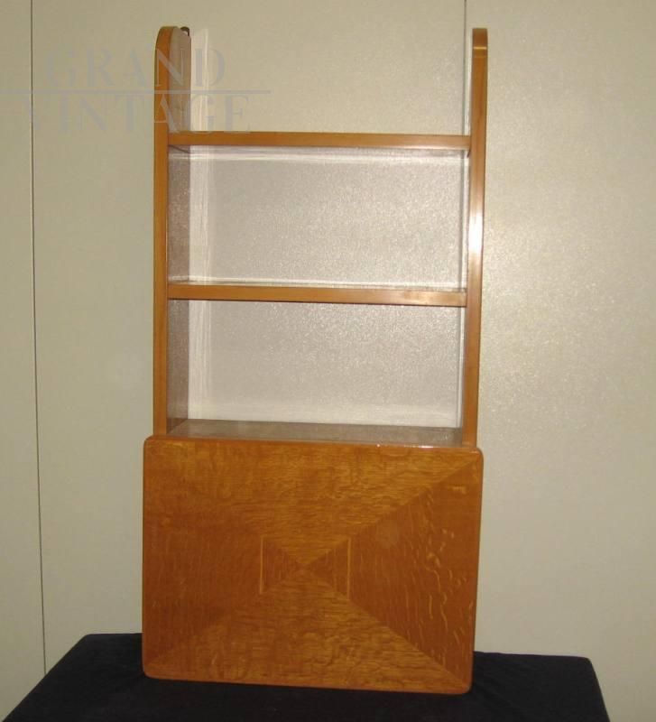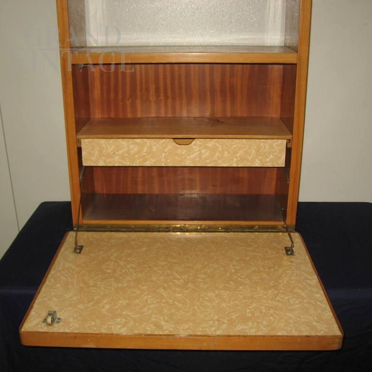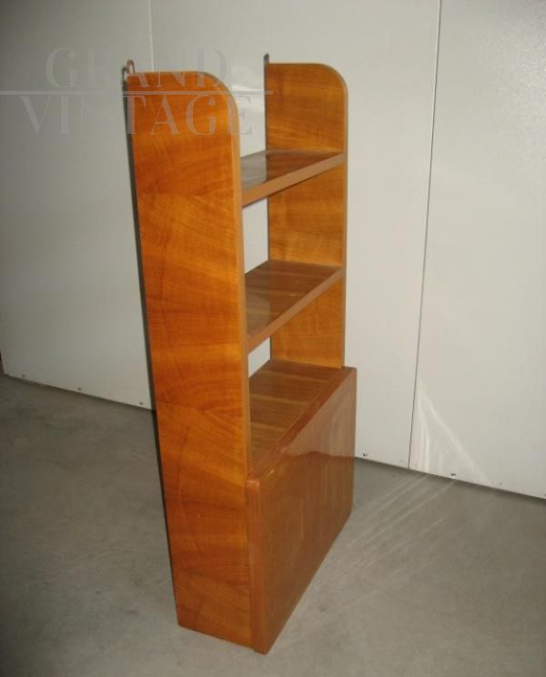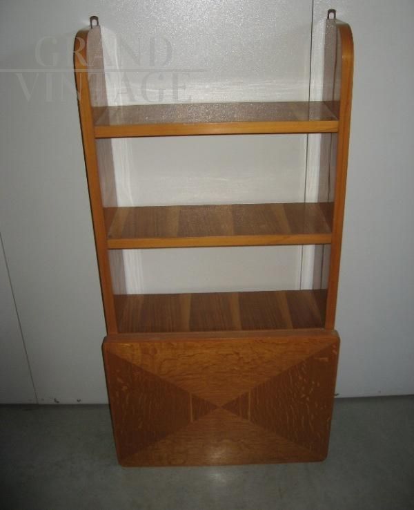 Wall unit / bookcase from the 60s, Italian modern antiques, with shelves and drop-down door. Veneered with light wood, this wall unit is characterized by 2 open shelves and a lower door with drop-down opening, inside which there are a drawer and a shelf. The useful space between the shelves is 25 cm.