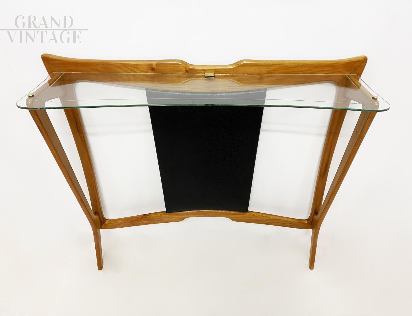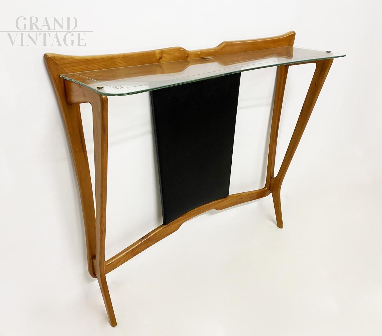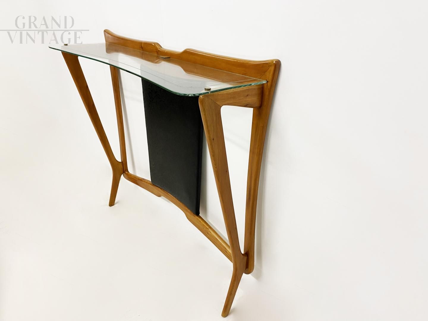 Particular mid-century modern design wall console in Ico Parisi style, original from the 1950s, entirely made of cherry wood with glass top and central detail in black lacquered leather. Great space-saving solution for a narrow entryway. Italian mid-century modern art from the 50s.