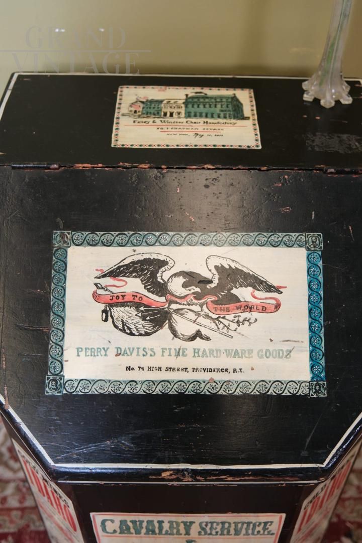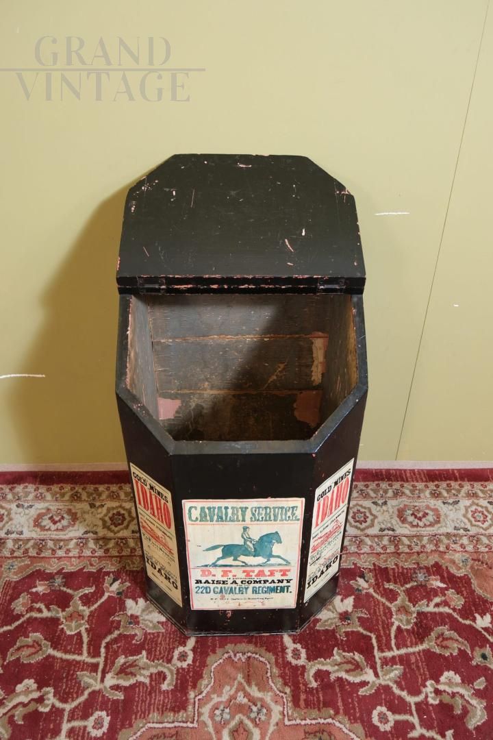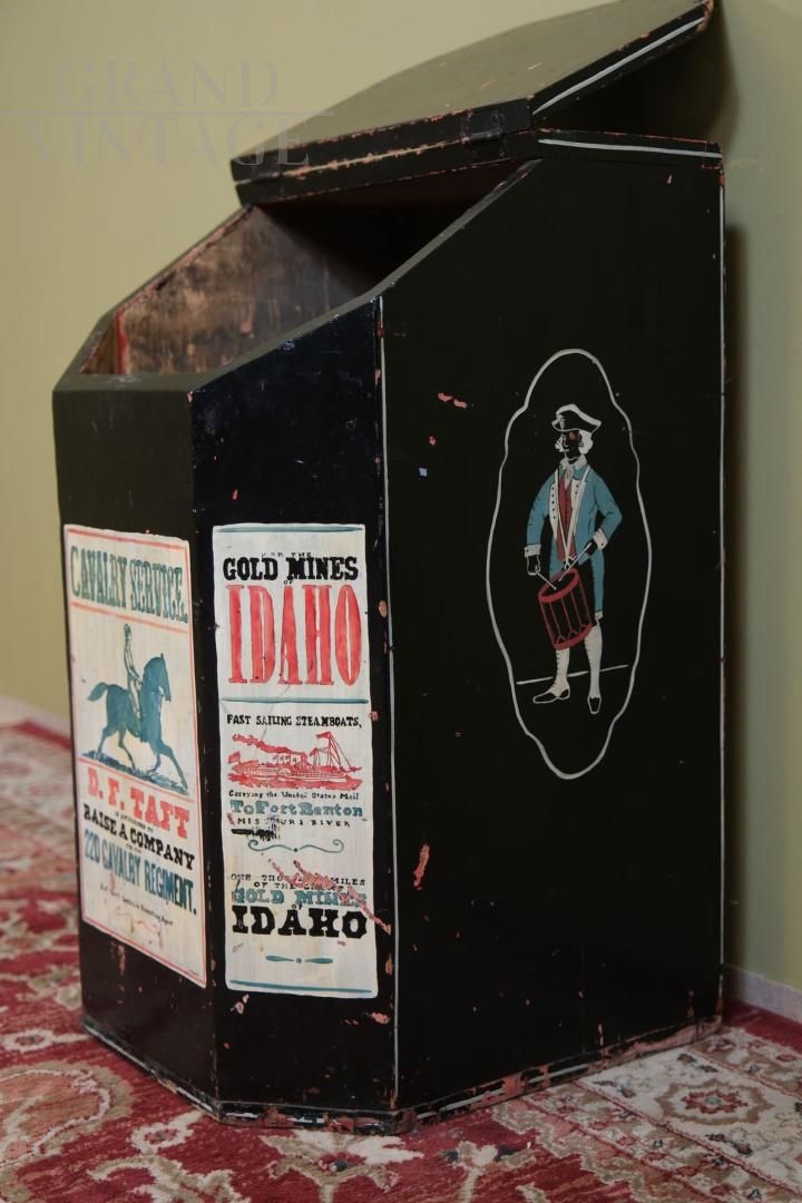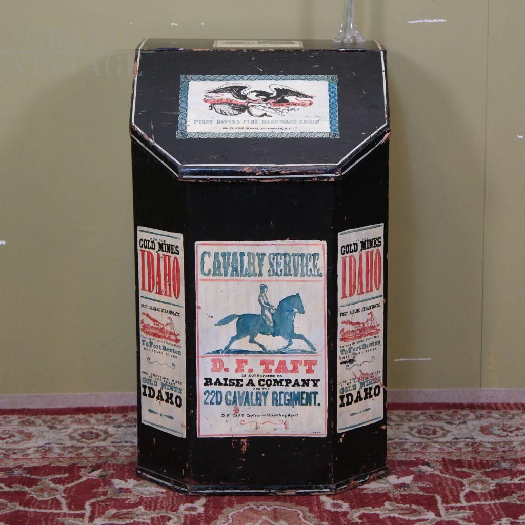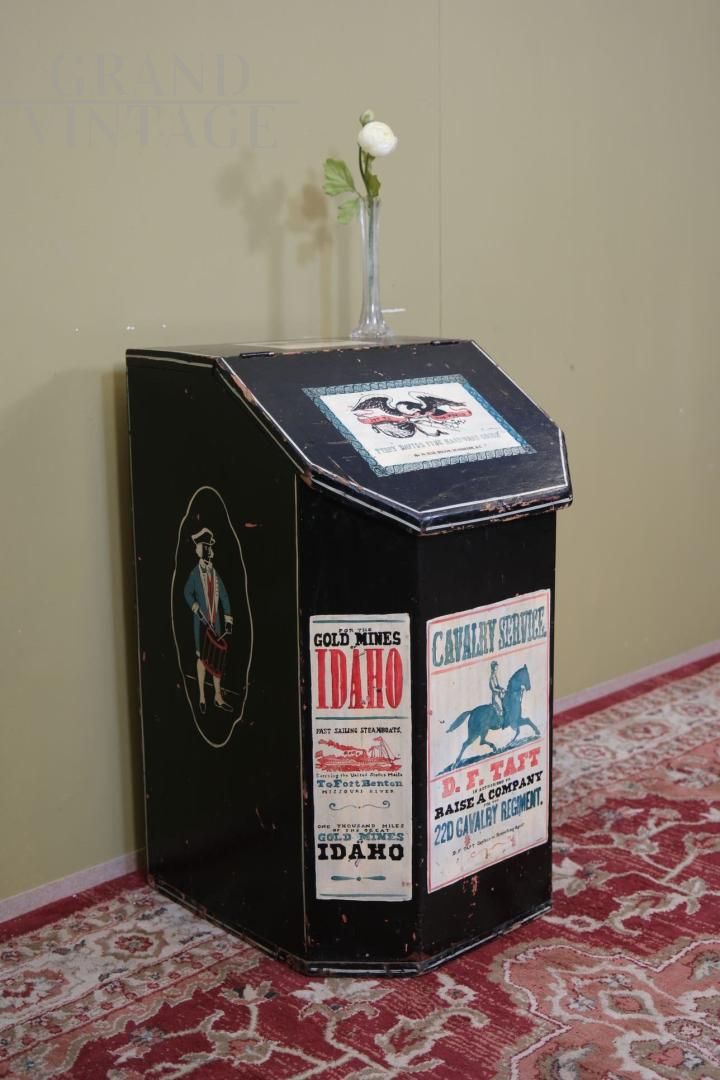 A rare object with a strong evocative value, capable of telling ancient stories, this wall container decorated with vintage American advertisements is perfect for furnishing with personality and vintage spirit, it will be like living in a saloon.