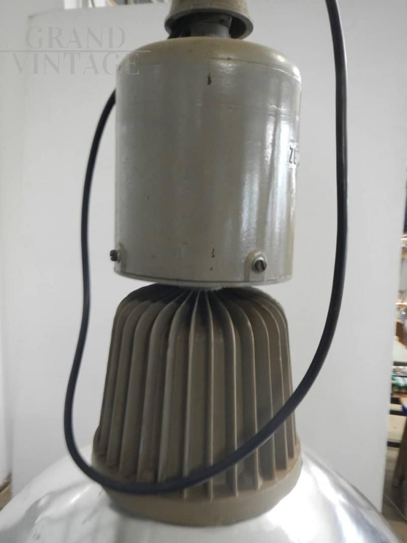 1970s industrial suspension lamps by Zetalux Milano, with large chromed metal lampshade, rewired and functional, with E 27 bulb attachment.