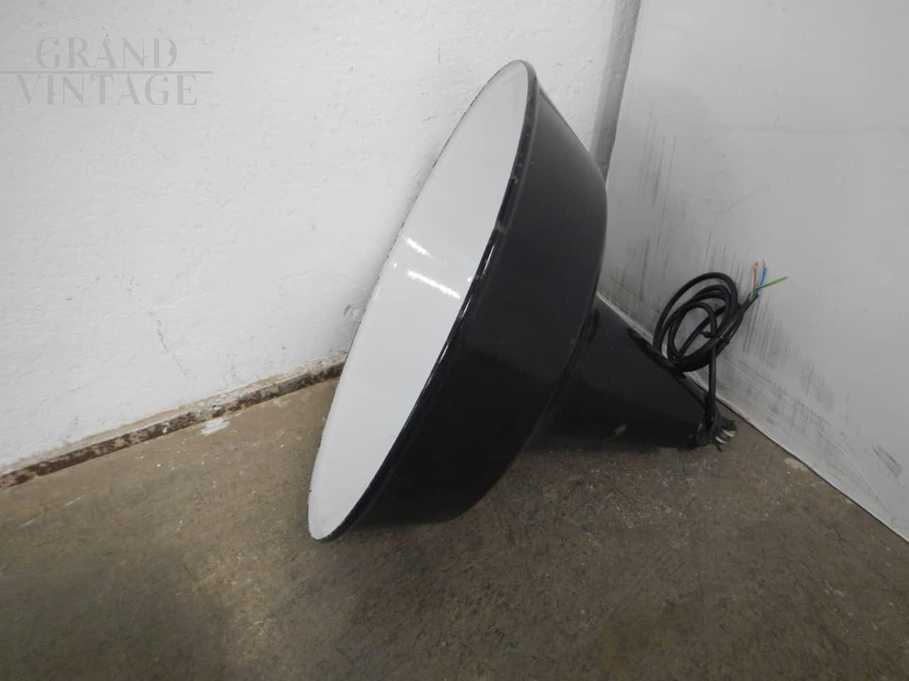 Vintage industrial lamp in black metal with white interior and ceramic hook, working electrical system with E27 bulb connection. In good condition, it has the natural signs of aging which increase its charm.