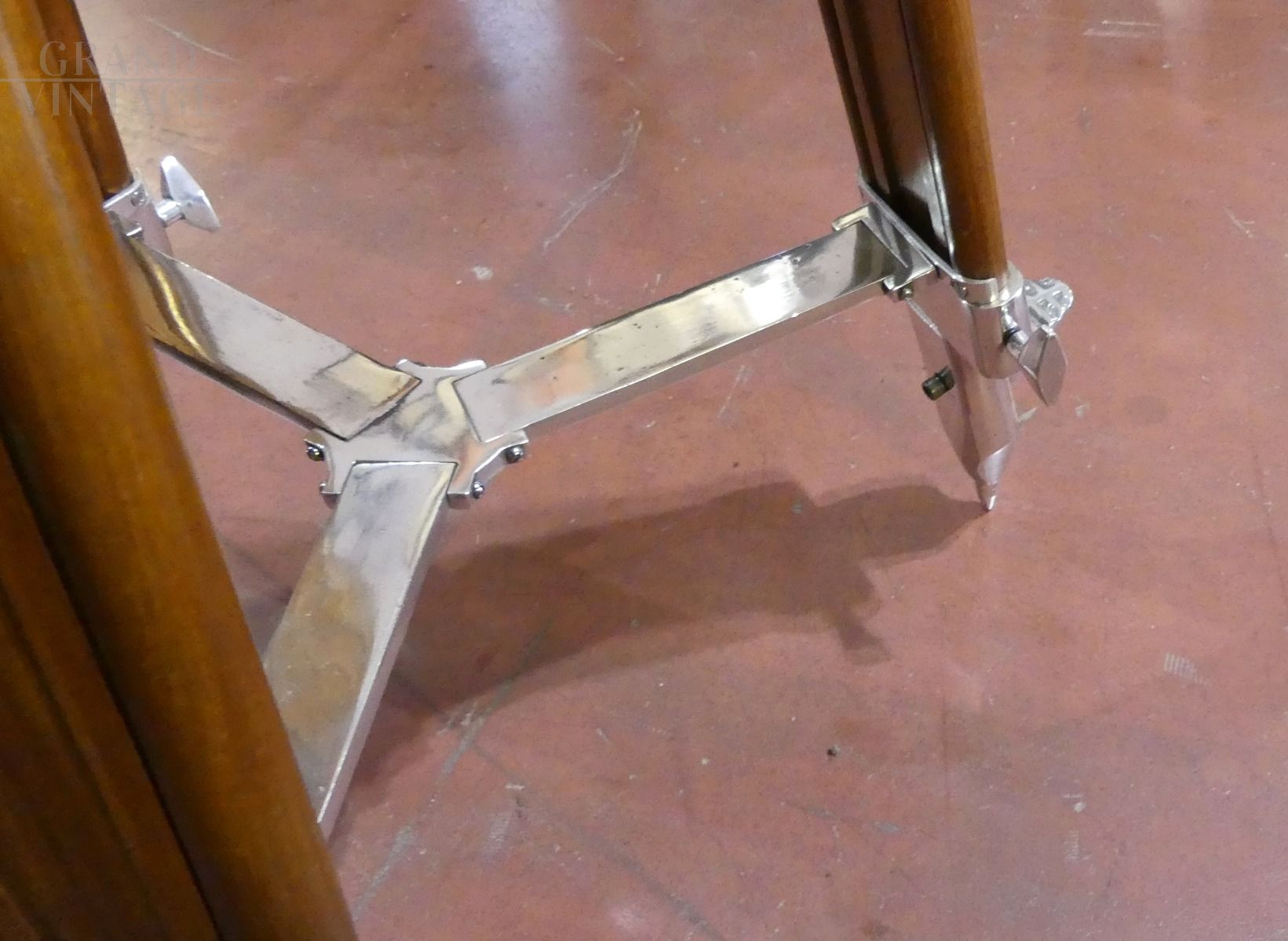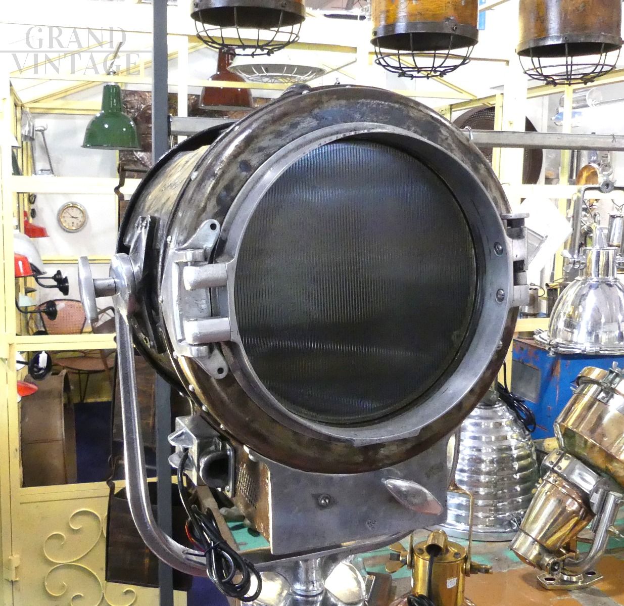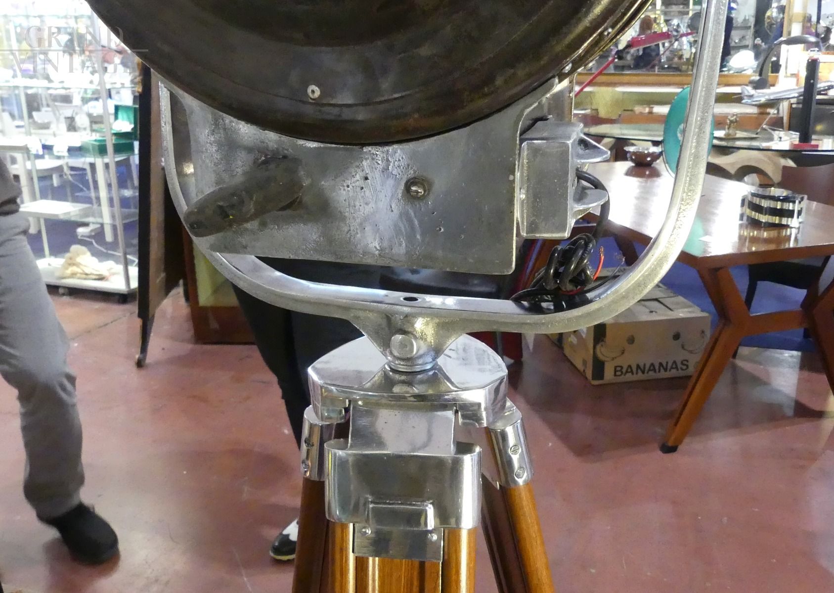 Industrial spotlight floor lamp in aluminum and iron from the 1930s, with wooden theodolite tripod. The headlight has a knurled glass which prevents glare. The height is adjustable from a minimum of 166 cm, and the legs are held together by an iron cross.