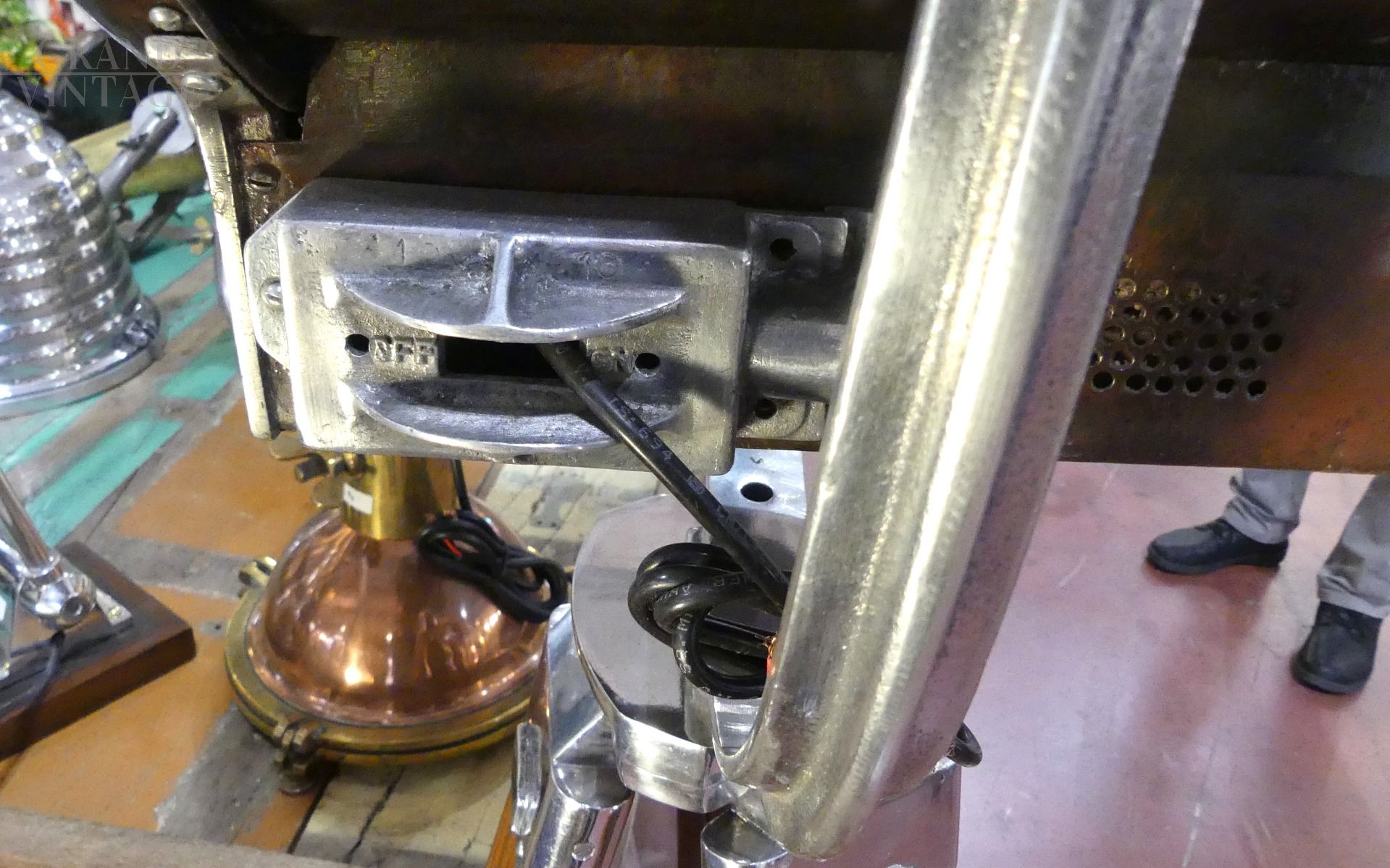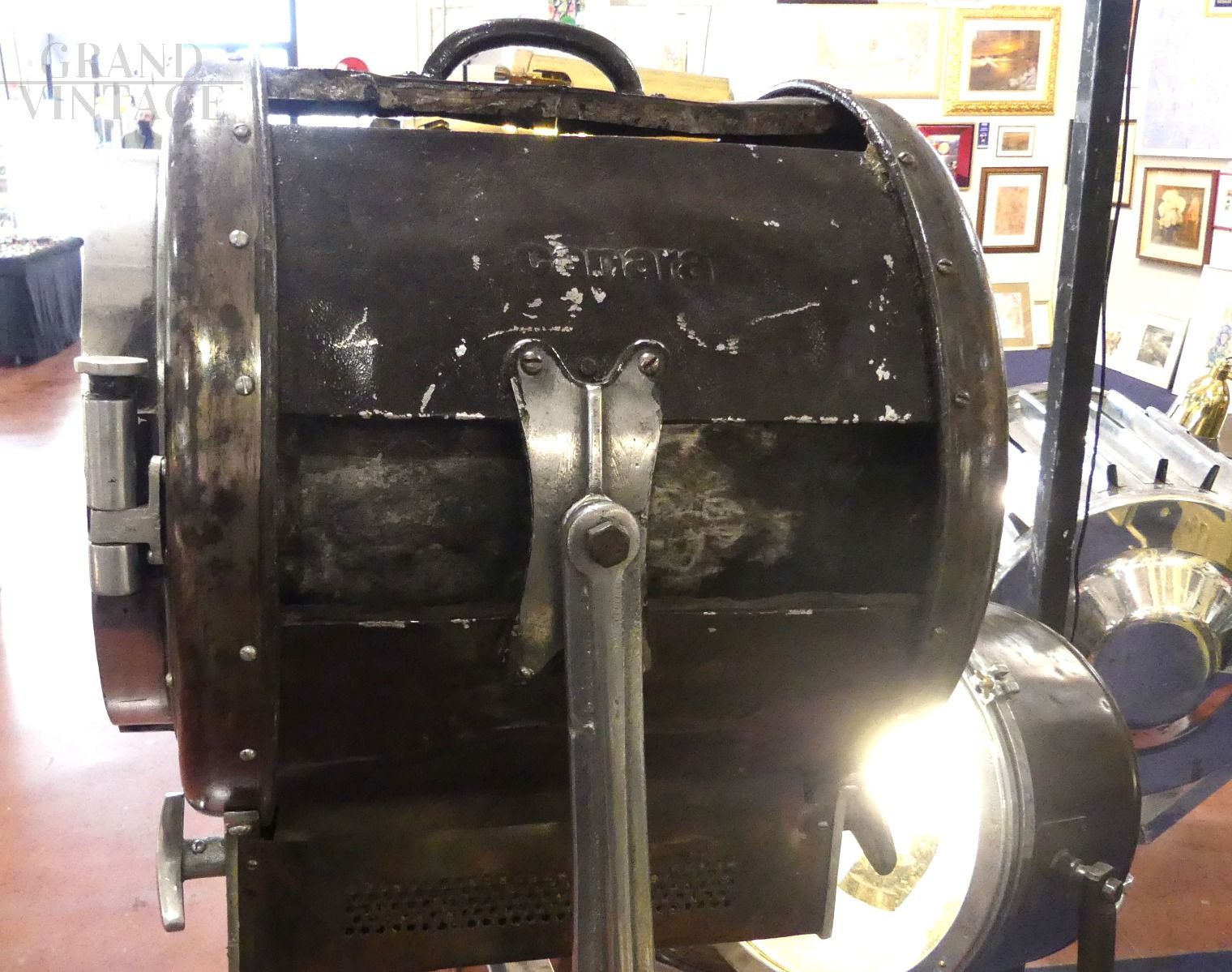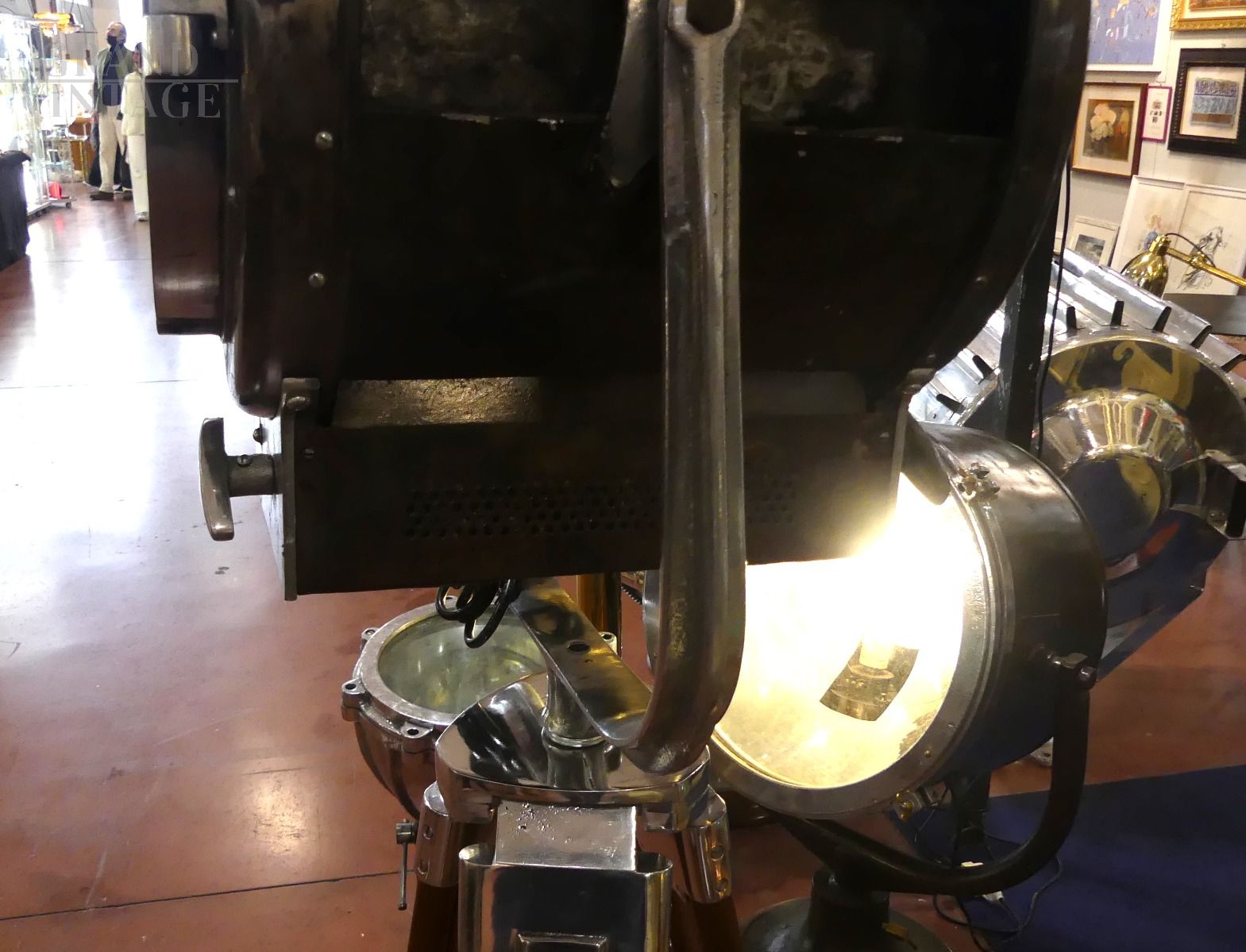 Industrial spotlight floor lamp in aluminum and iron from the 1930s, with wooden theodolite tripod. The headlight has a knurled glass which prevents glare. The height is adjustable from a minimum of 166 cm, and the legs are held together by an iron cross.