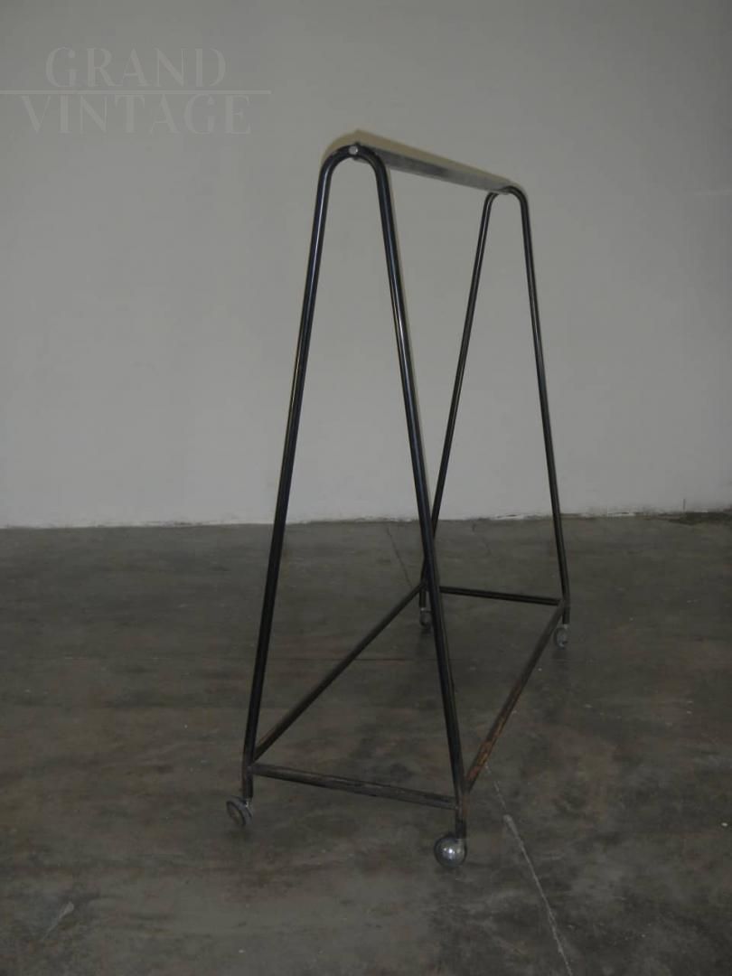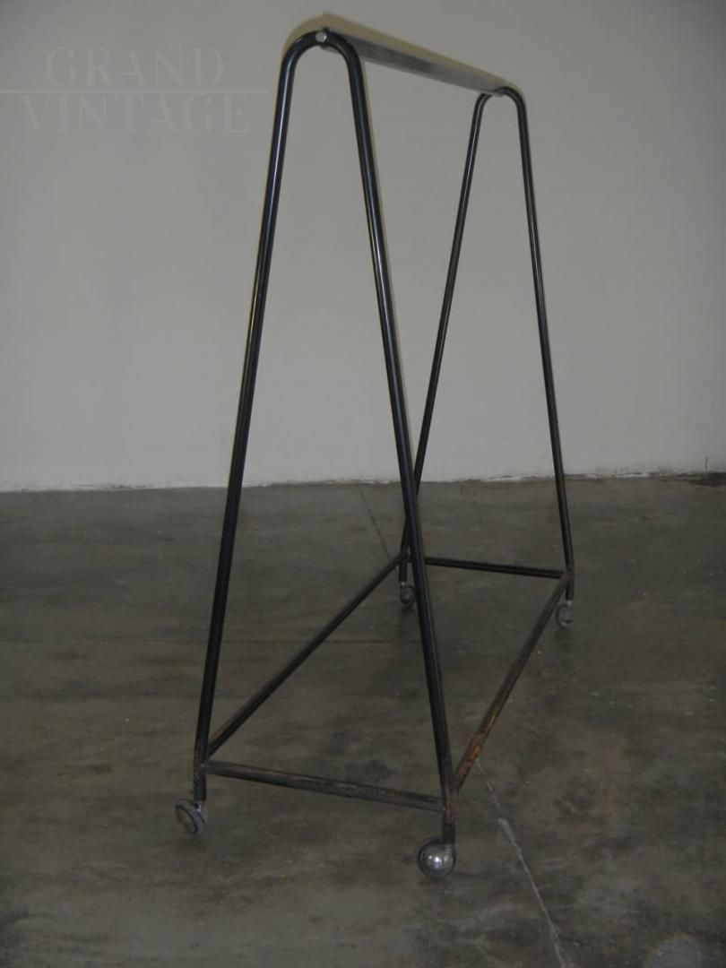 Vintage shop stander clothes hanger in black painted iron tube, with chromed upper pole, working wheels.