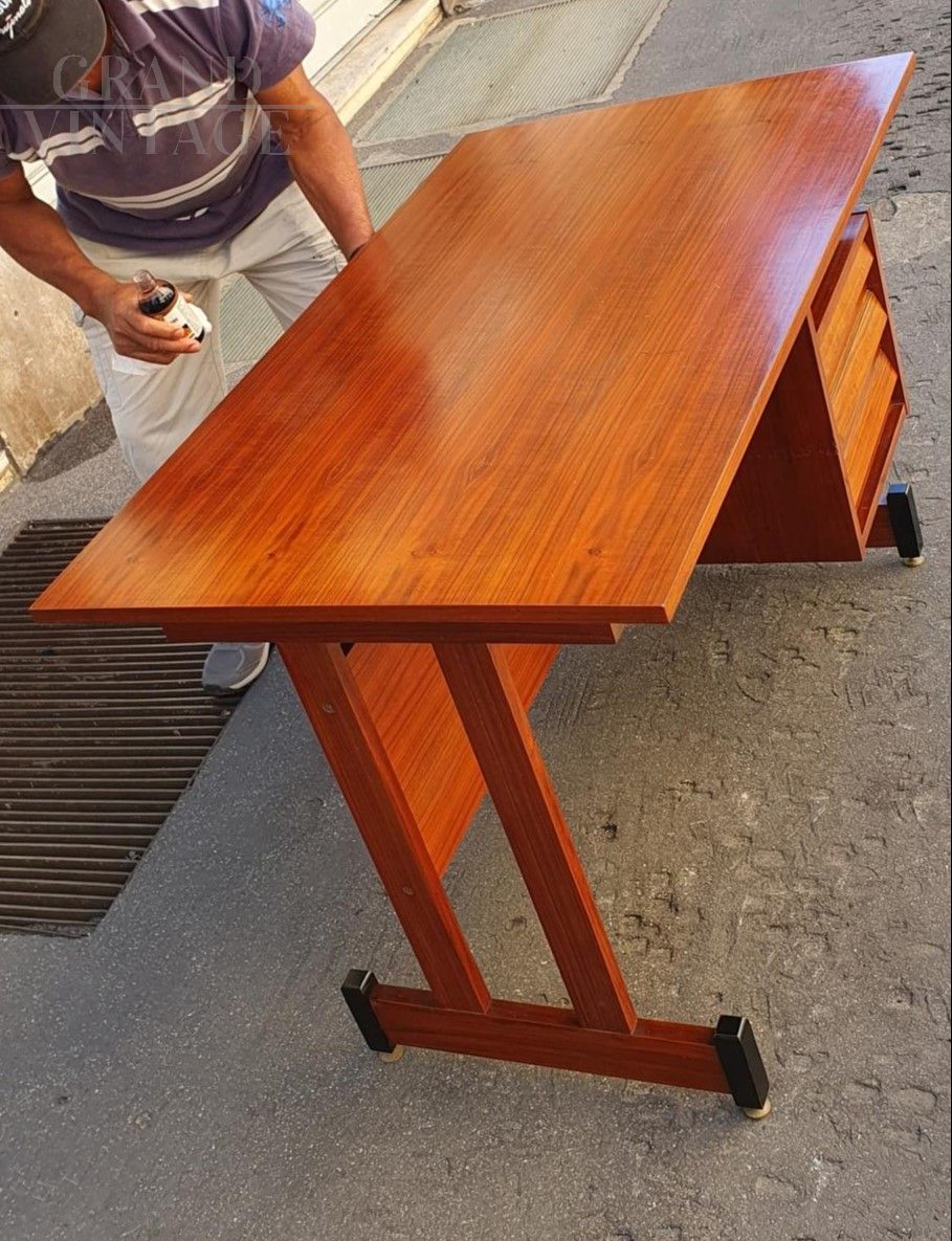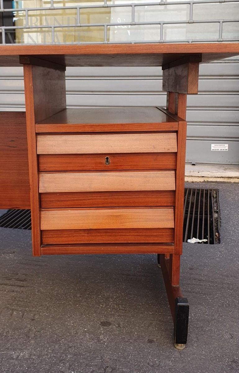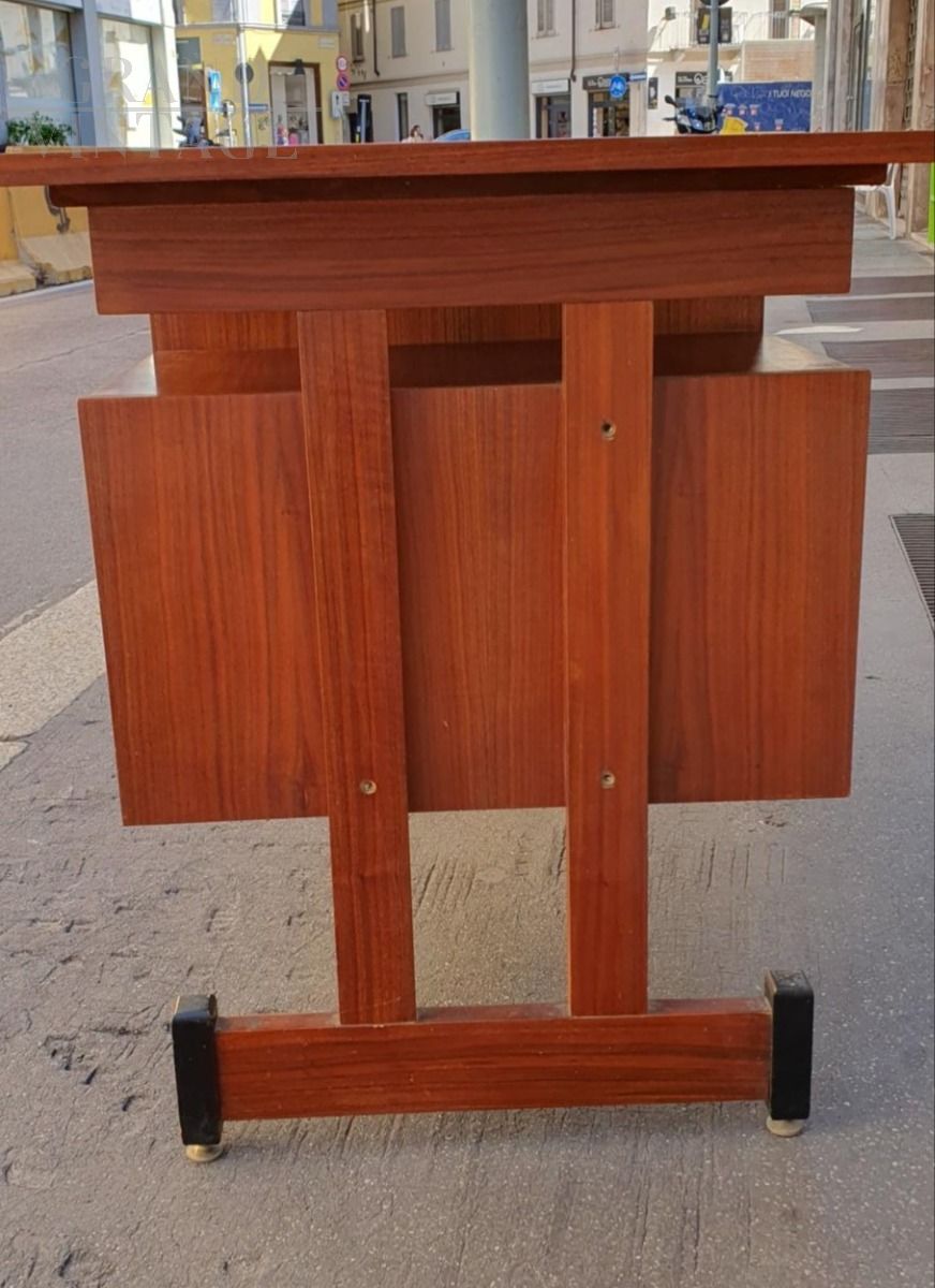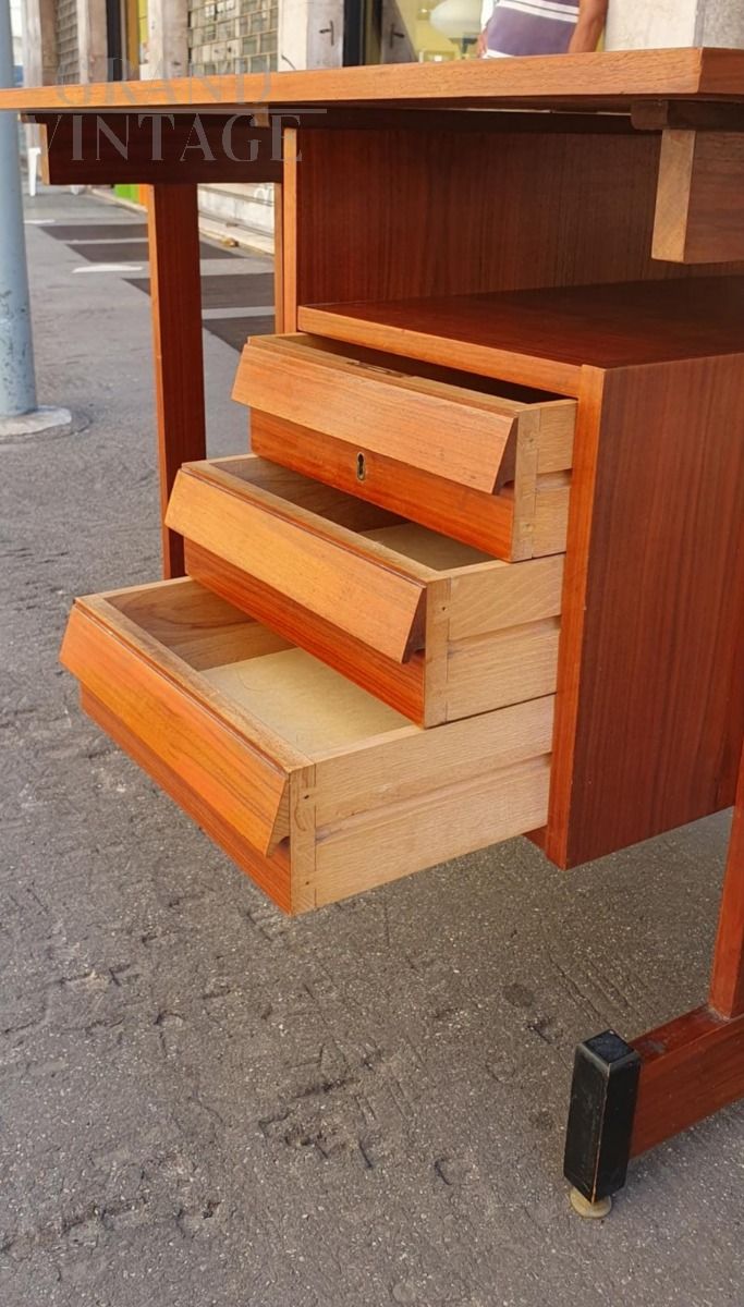 Vintage teak wood desk with chest of drawers on the right side, Scandinavian style, Italy from the 1960s, original and in excellent condition, small in size, suitable for a bedroom or small office. The desk is very beautiful from both sides, perfect to place in the center of the room, and has adjustable brass feet.