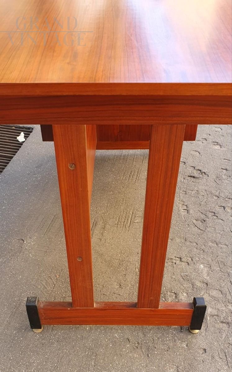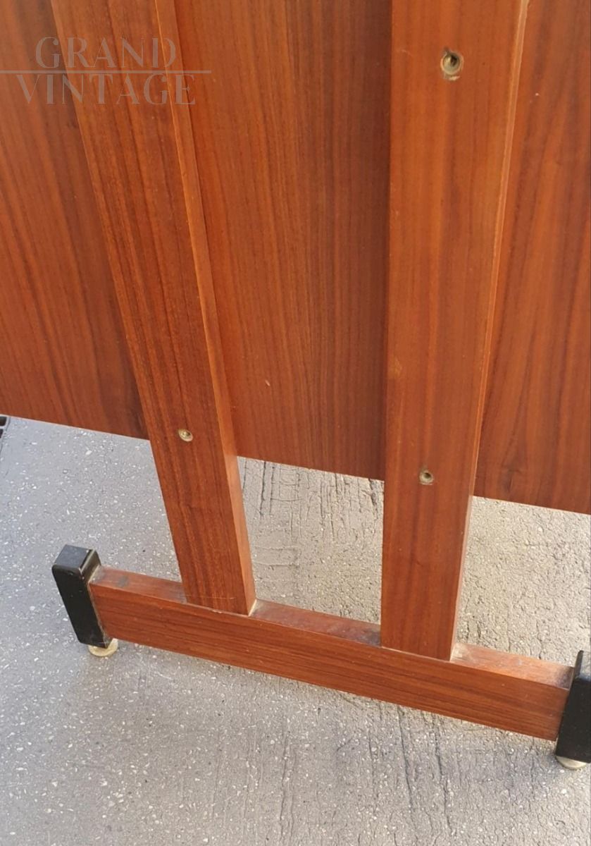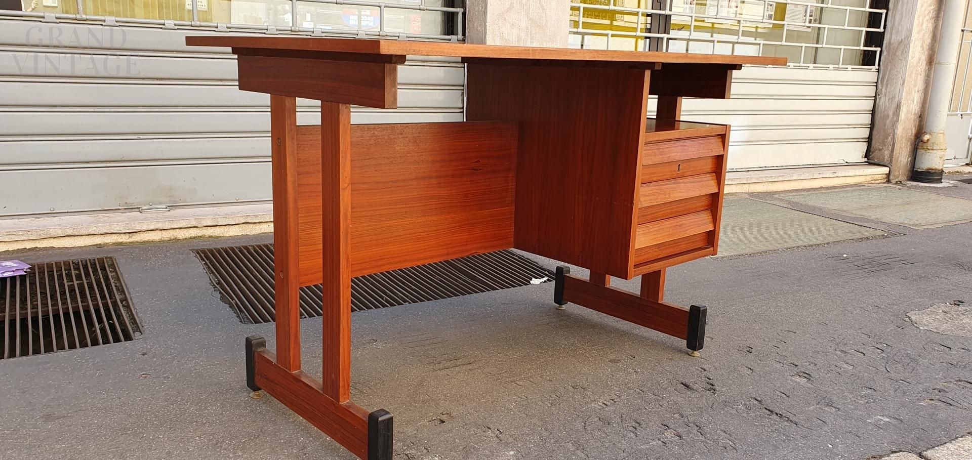 Vintage teak wood desk with chest of drawers on the right side, Scandinavian style, Italy from the 1960s, original and in excellent condition, small in size, suitable for a bedroom or small office. The desk is very beautiful from both sides, perfect to place in the center of the room, and has adjustable brass feet.