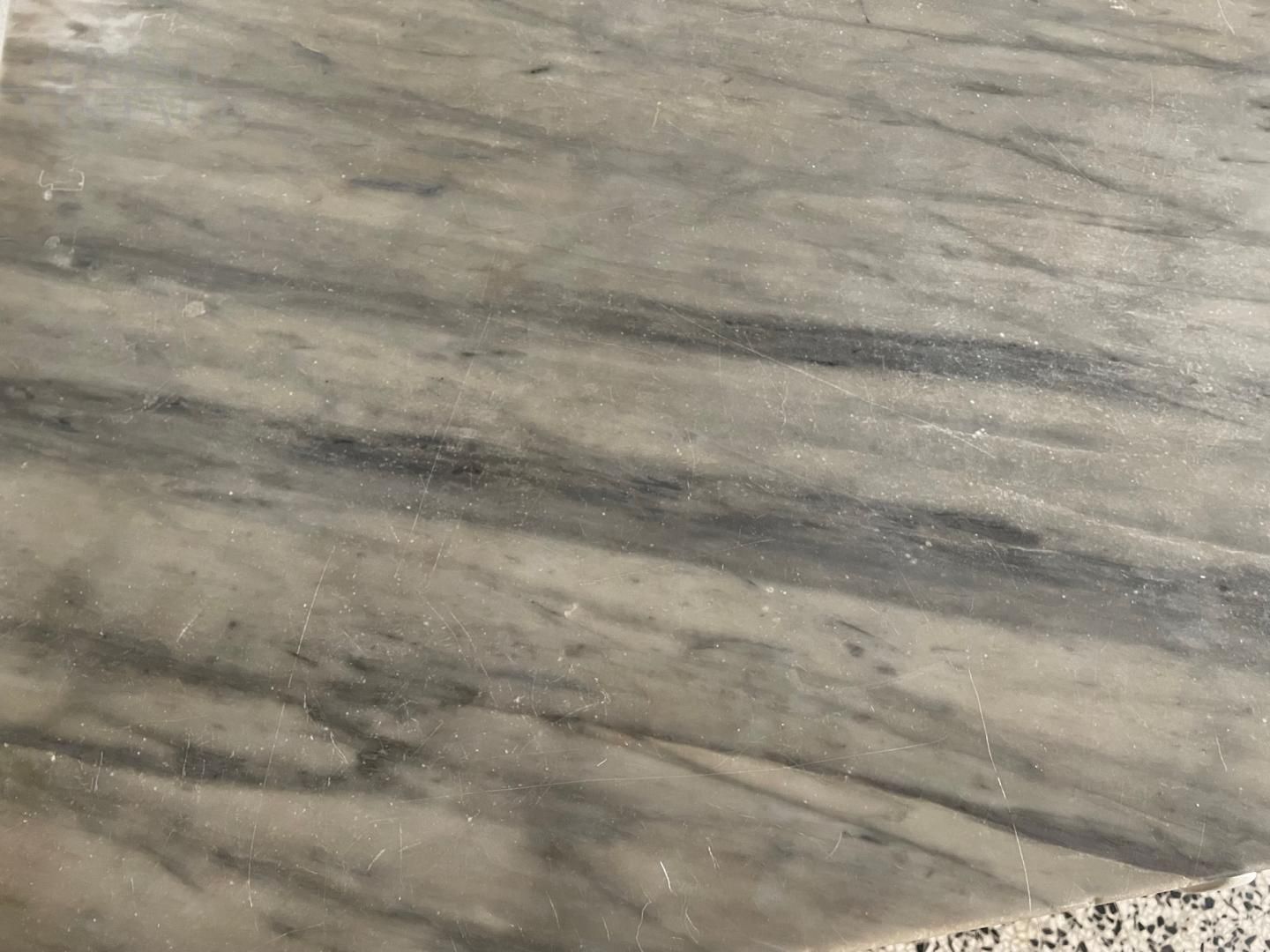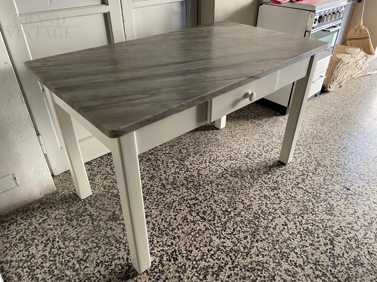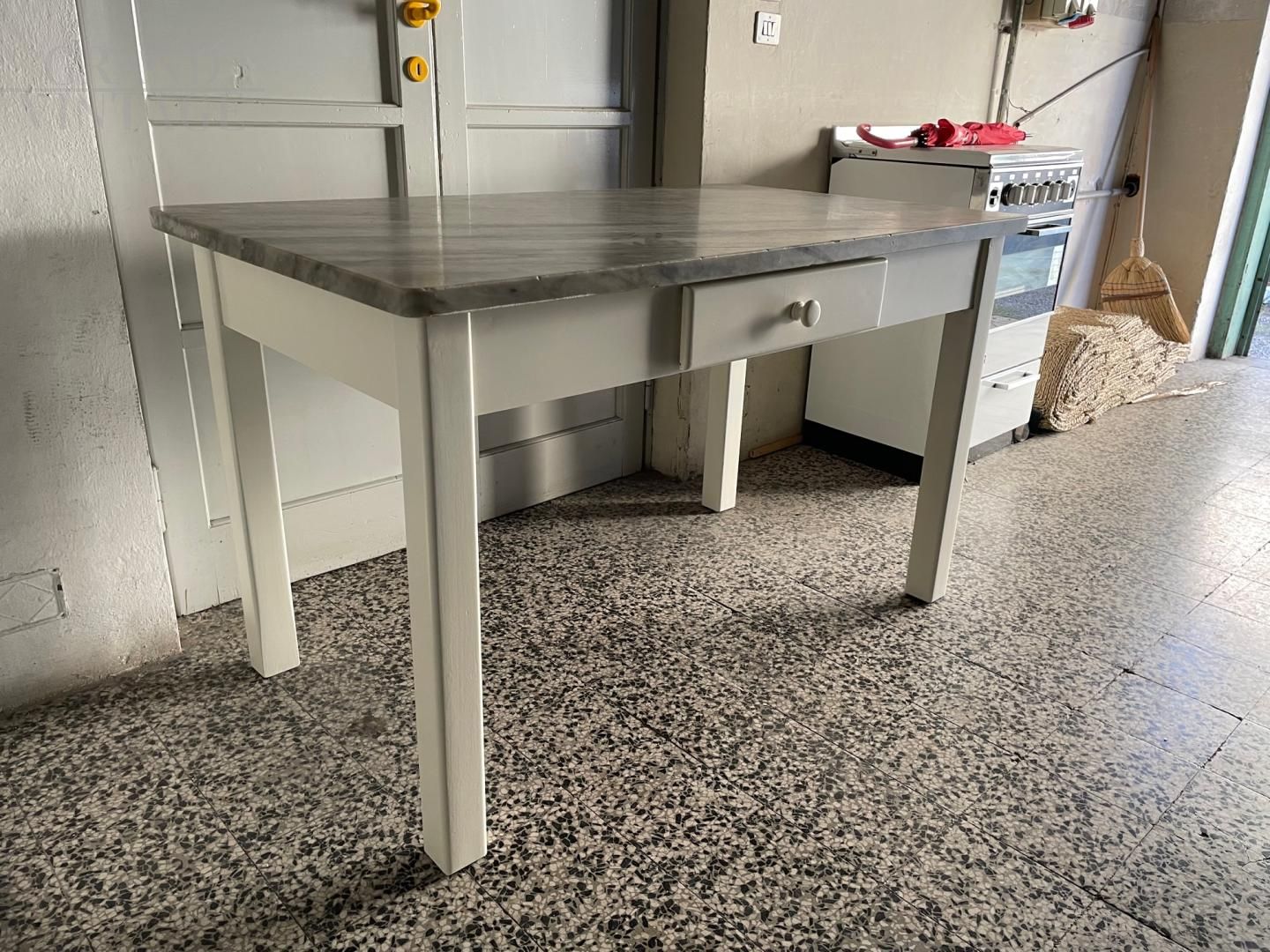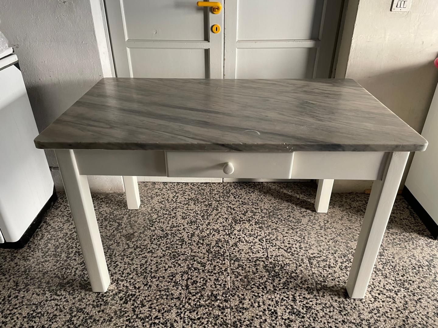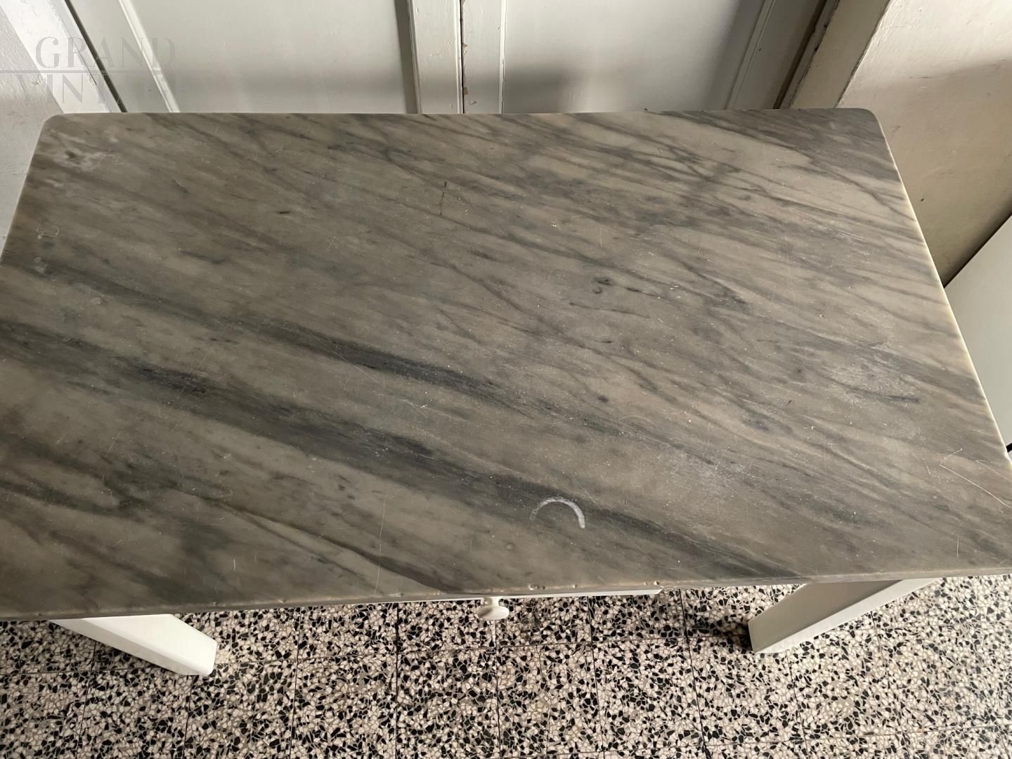 Beautiful vintage kitchen table in white lacquered wood with gray marble top and central drawer, in good vintage condition.