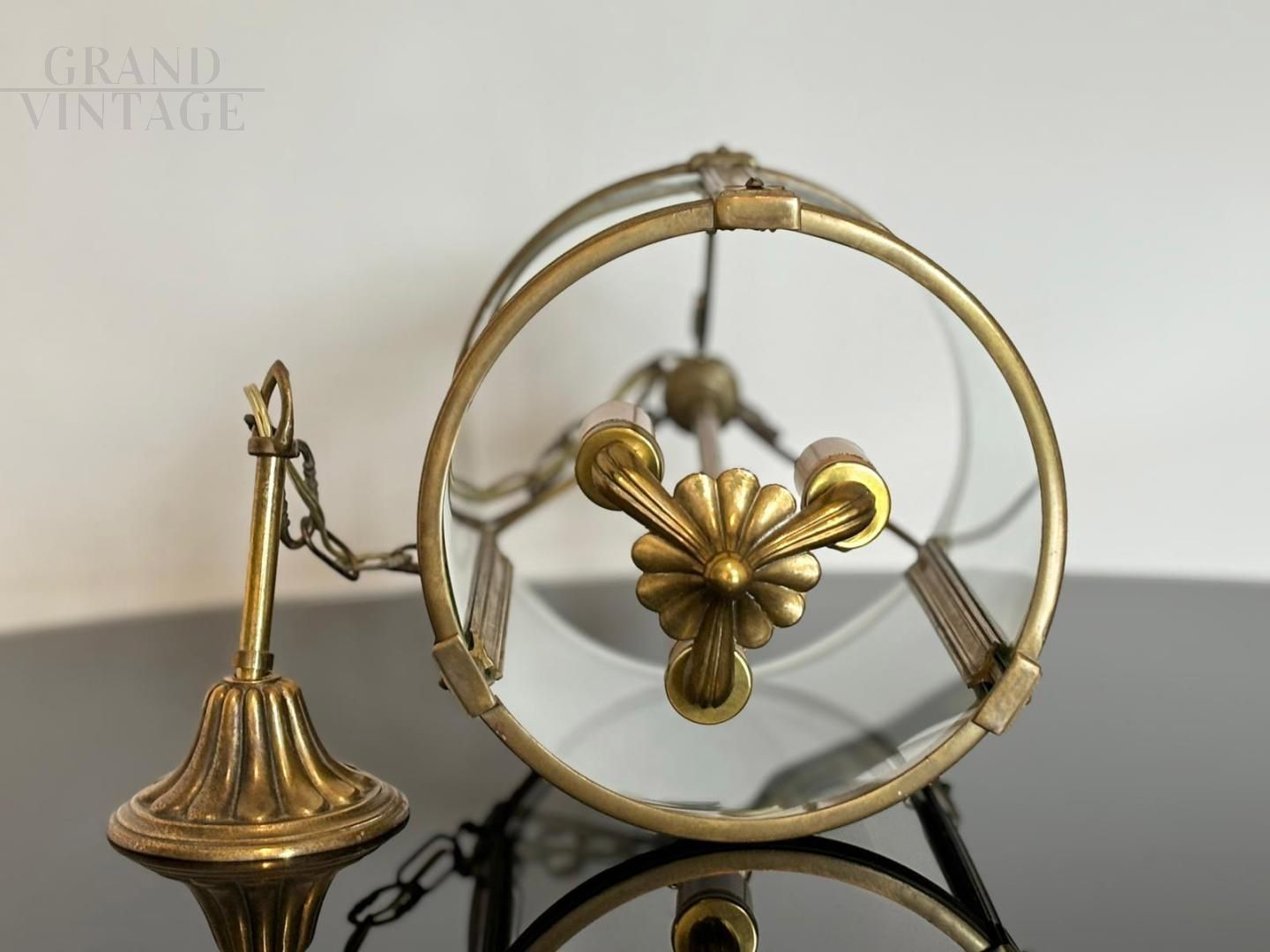 Vintage round lantern chandelier in brass and blown glass with three light points, Italy 1950s, in excellent condition and in working order.